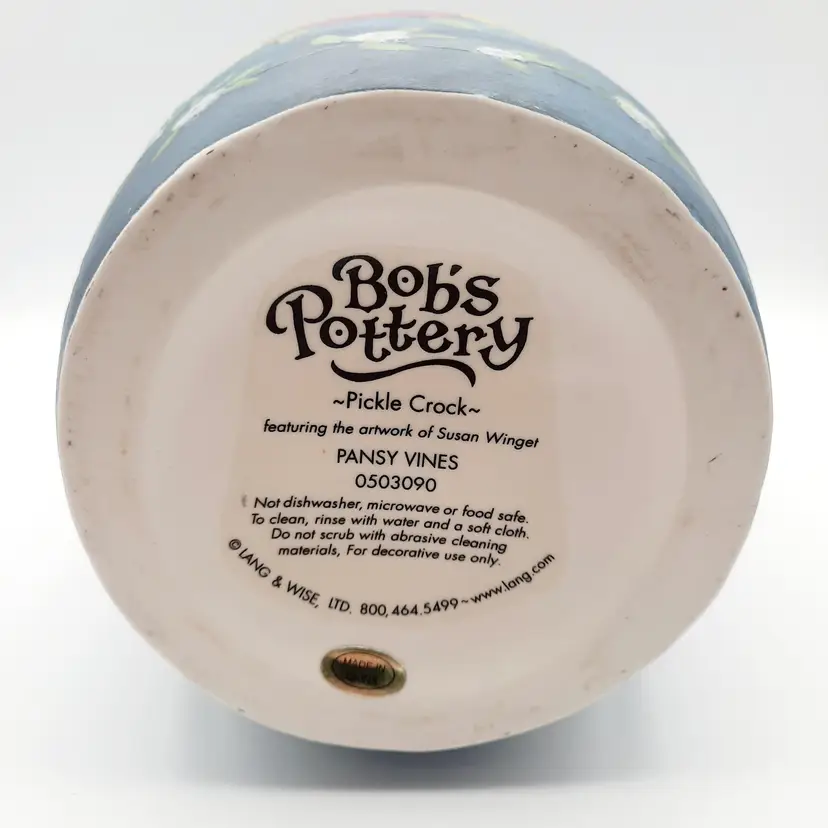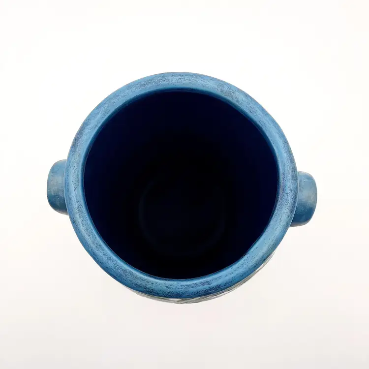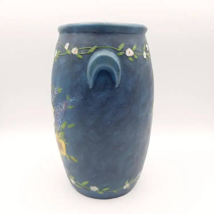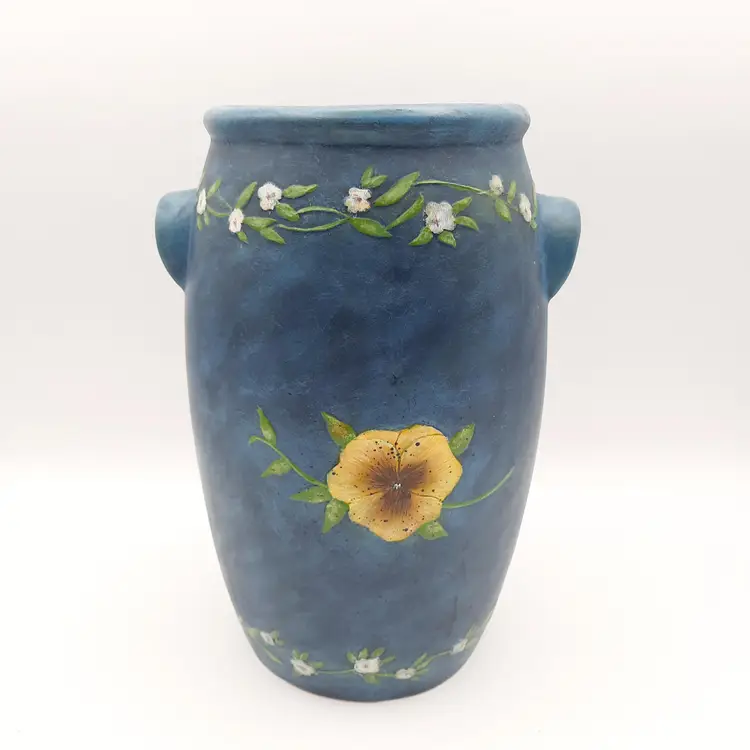 Beautiful raised floral design on this decorative crock/vessel/vase 9 1/2"H x 6"W handle to handle, weighs almost 3 lbs, great condition.