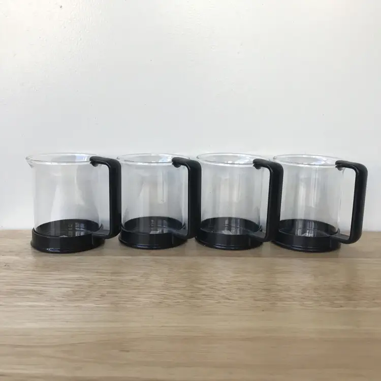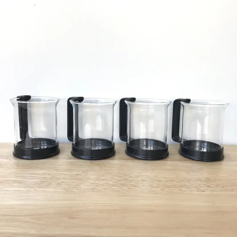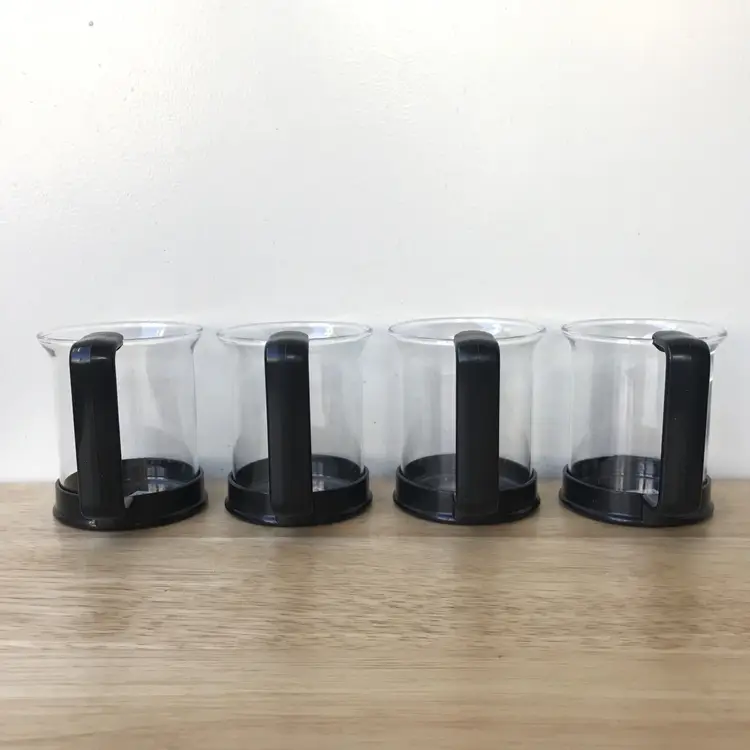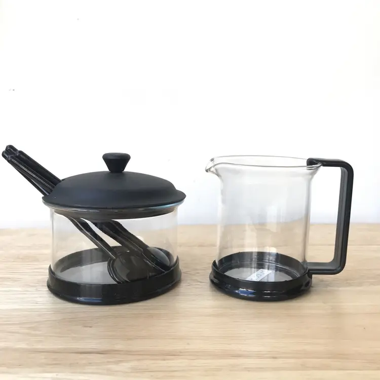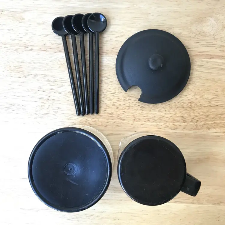 4 espresso cups with removable black plastic handles (8 pieces) 1 creamer with removable black plastic handle (2 pieces) 1 sugar bowl with black plastic lid and holder (3 pieces) 5 black plastic stirrers (5 pieces)