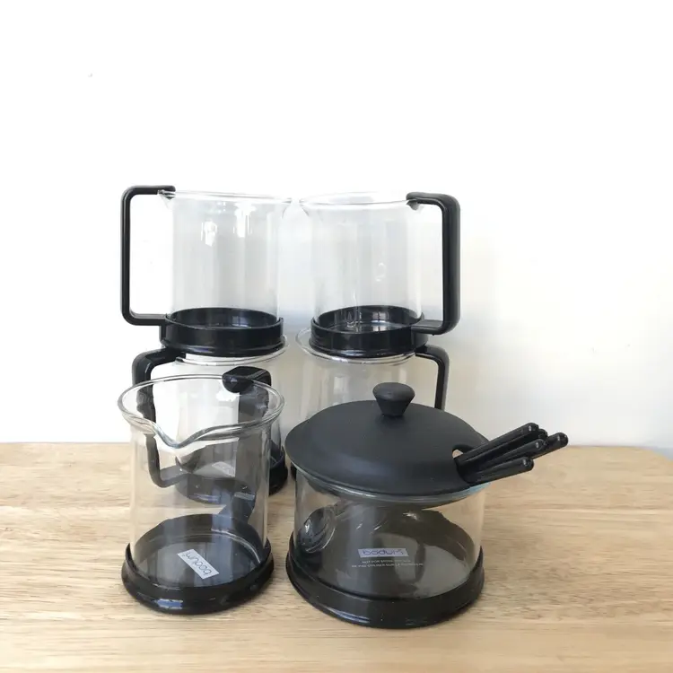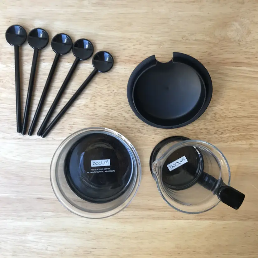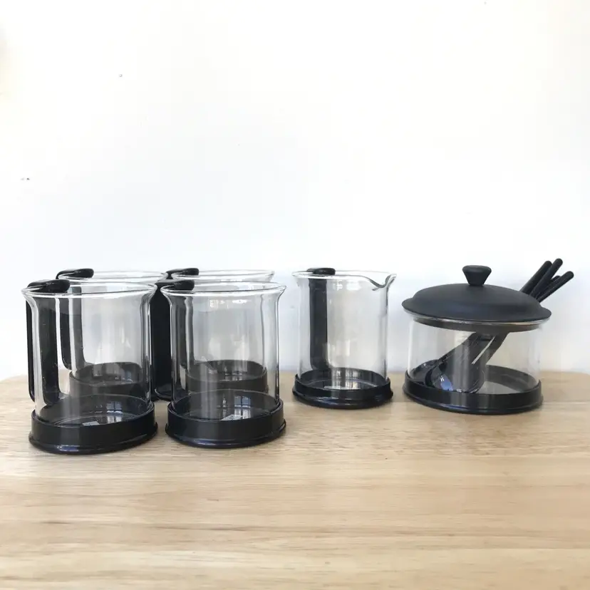 – Model: Bodum – Country/Region of Manufacture: Switzerland – Material: Multi Materials – Type: Cups, Sugar, Creamer, Stirrers – Features: Handle – Color: Black – Number of Items in Set: 18-Piece – Service For: 4 – Glassware Type: Mug – Set Includes: Creamer, Sugar Bowl, Stirrers, Espresso Cup – Brand: BODUM