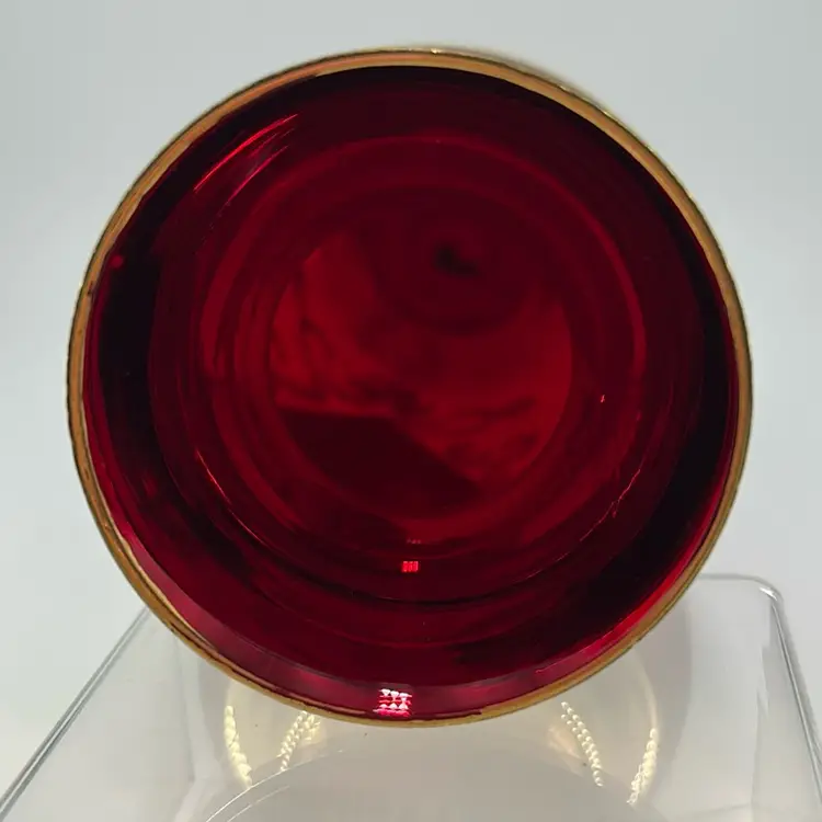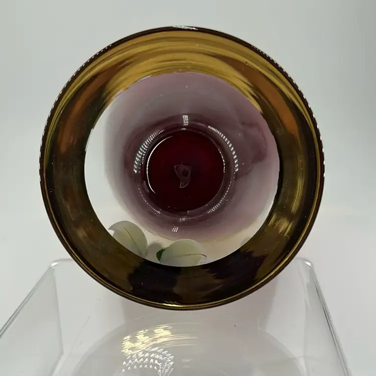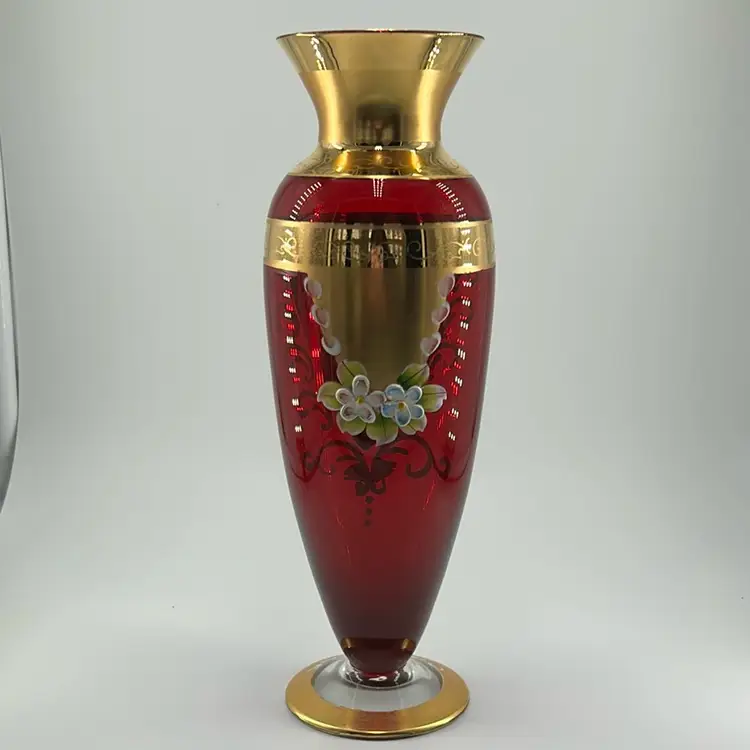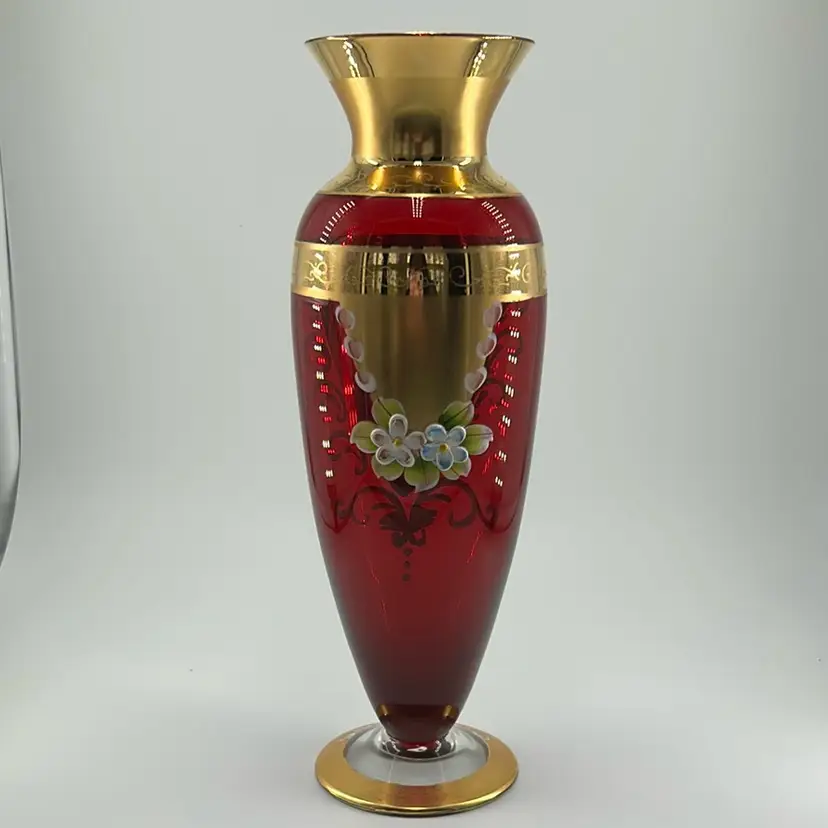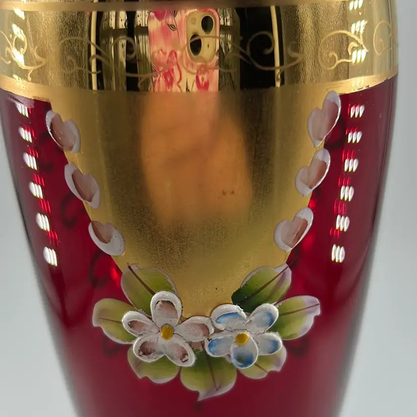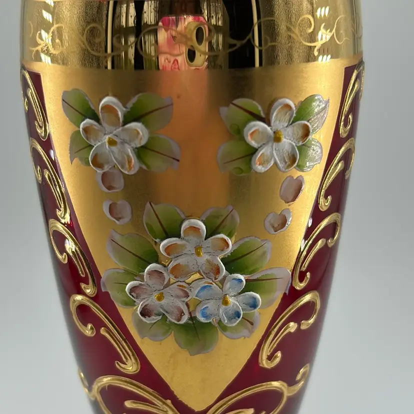This piece is a decorative bohemian art glass vase. It is known for its intricate design in gold accents. They are most likely handcrafted with Viber collars and luxurious detailing. This piece feature is a blend of gold and red toes with floral embellishment. This is a stunning piece. It stands 9 1/2 inches tall and 2 1/2 inches across the top. In excellent condition. No chips no crack.