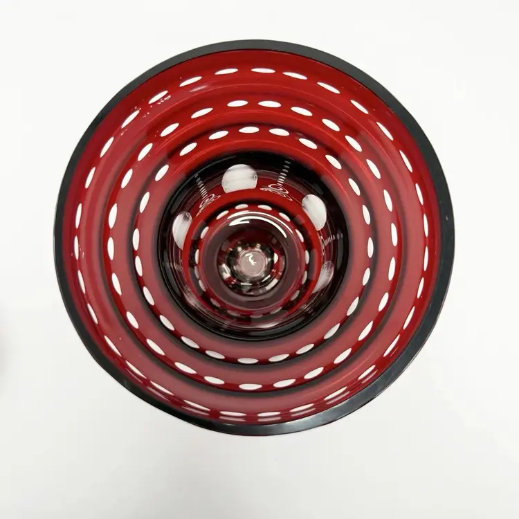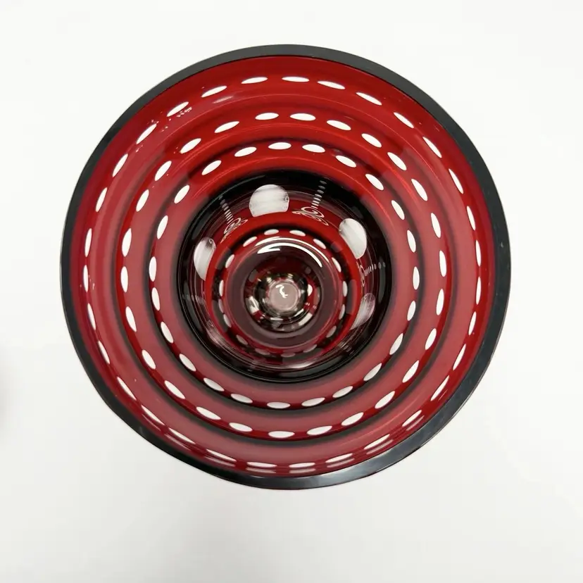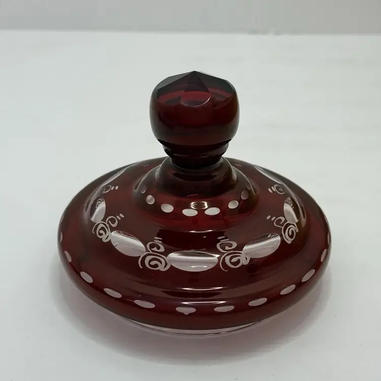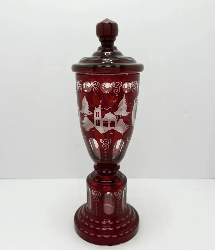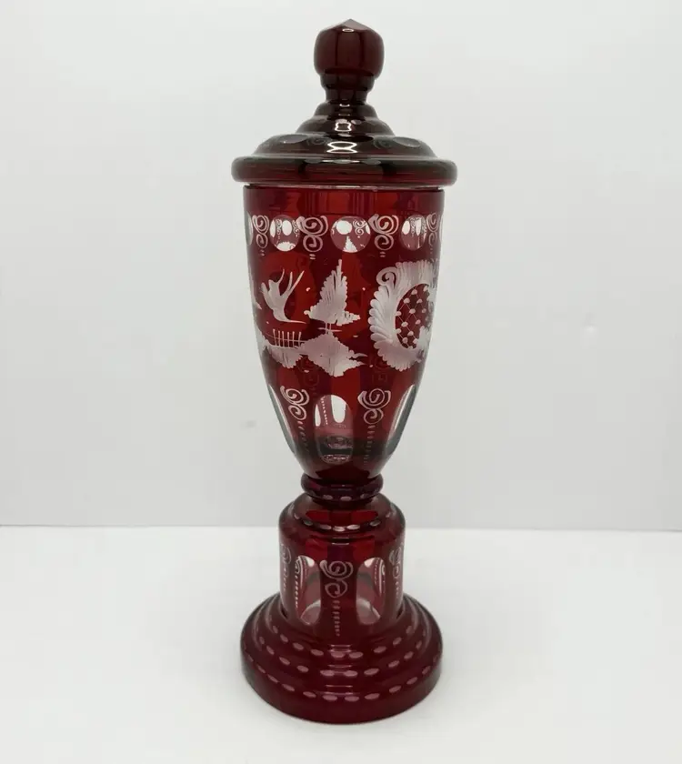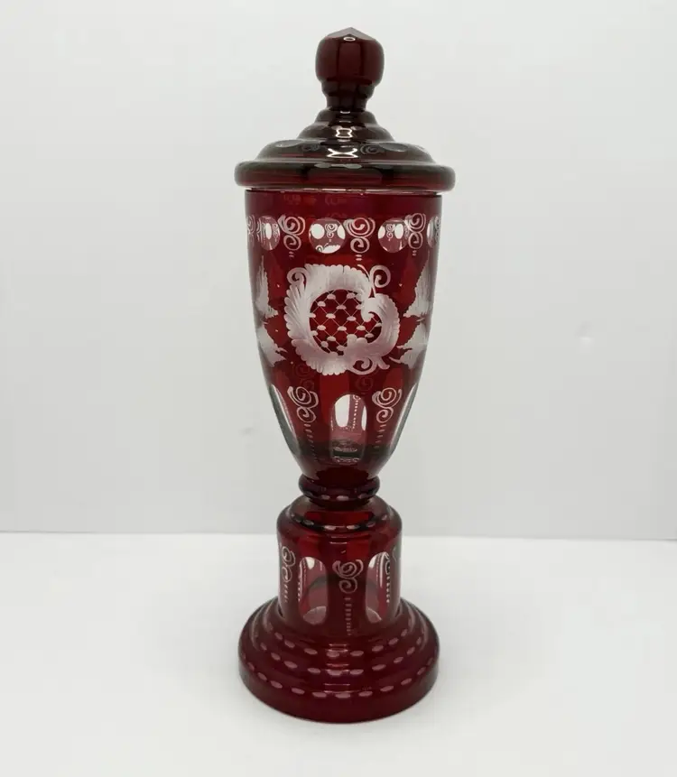 This Bohemian Crystal Hand-cut Jar with Lid is a stunning piece of vintage craftsmanship. Handmade with a ruby red to clear color, this one-compartment candy jar stands at 15 1/2" tall and features intricate hand-cut details. The set includes a matching lid, and the item has a unique Bohemian style that adds a touch of elegance to any kitchen or home decor. Made of glass, this jar is not only functional for storage but also a beautiful collectible item for those who appreciate handmade artistry.