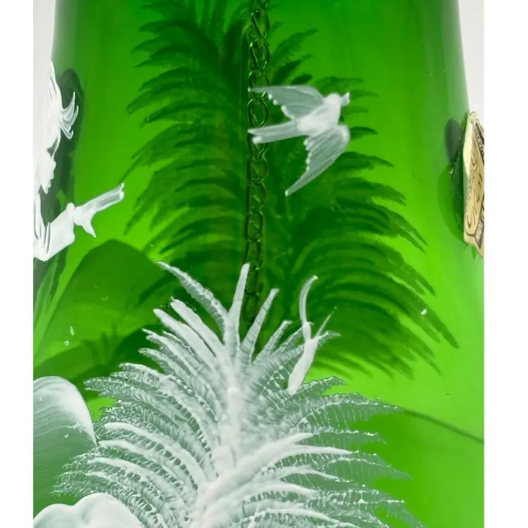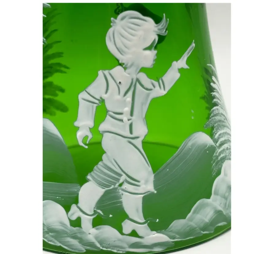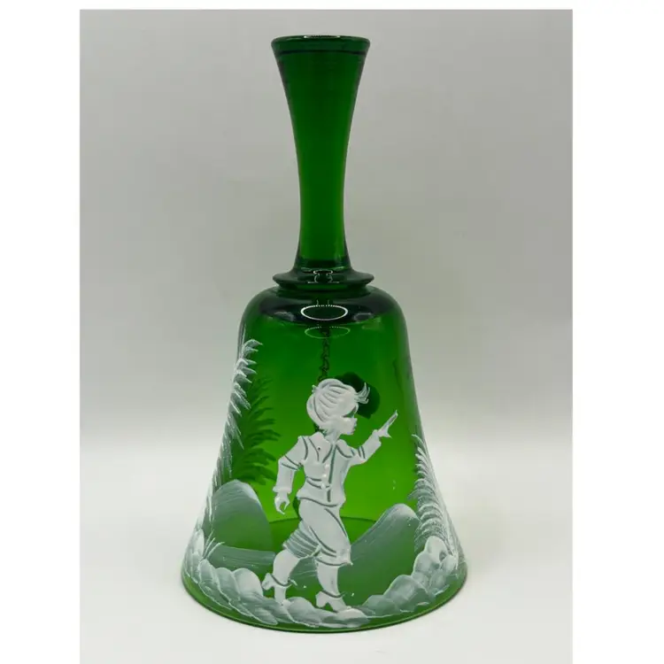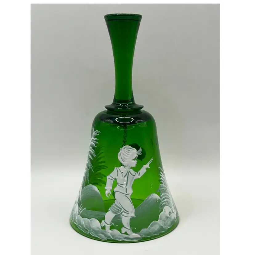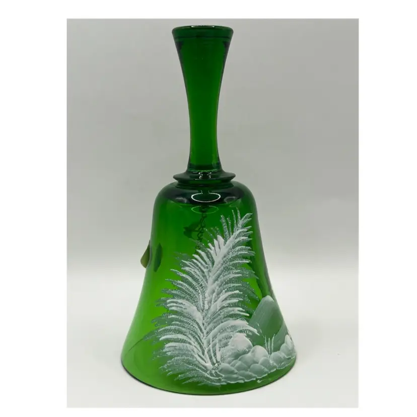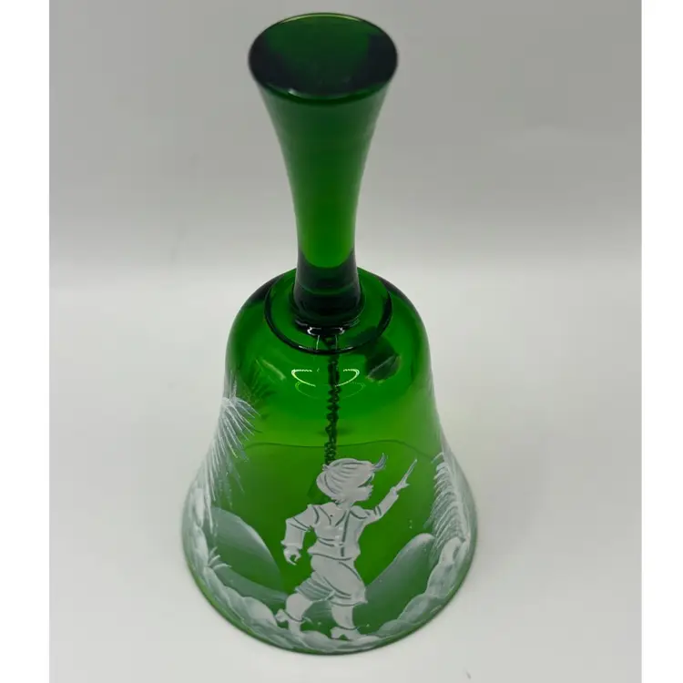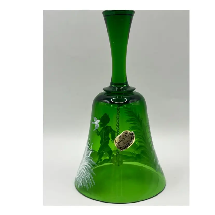 This Beautiful green glass bell in the style of Mary Gregory would look amazing with your Christmas decor. Original sticker states that it is Bohemian glass made in Czechoslovakia No chips or cracks 6” tall mouth of bell 3” wide