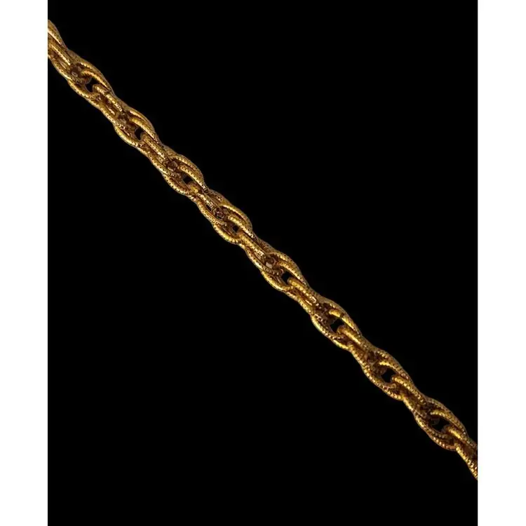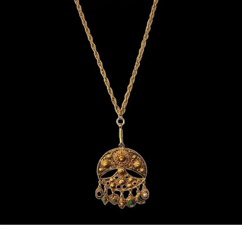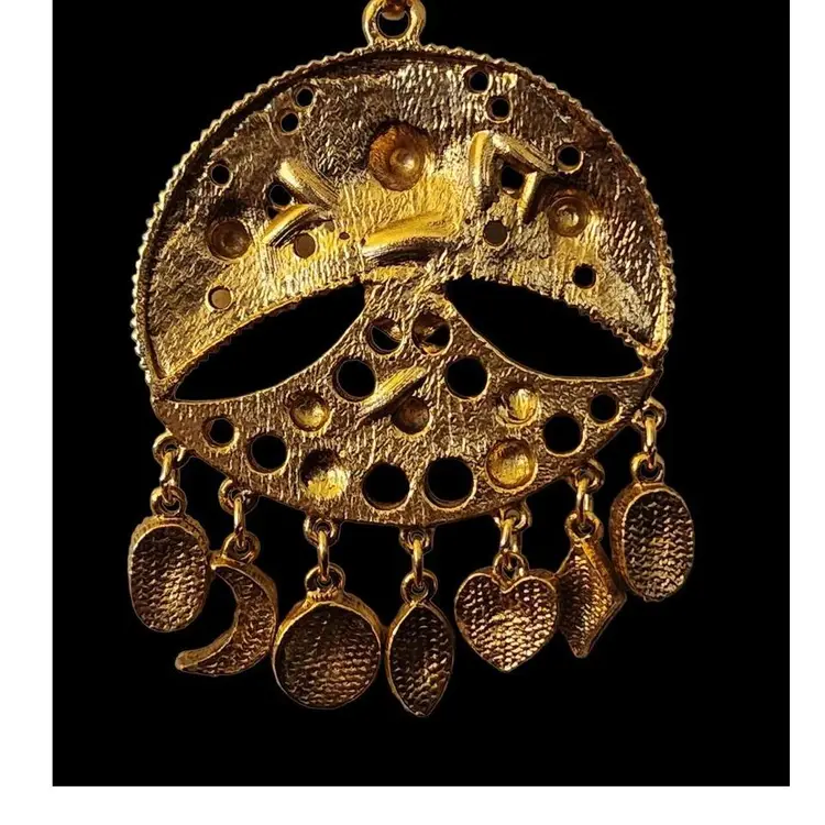 From the pendant, 6 dangles of oval, diamond, heart, round, and moon shape Multiple shaped cutouts on pendant as well Rope chain with a spring ring closure. Excellent condition!