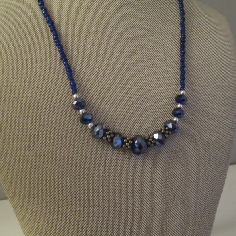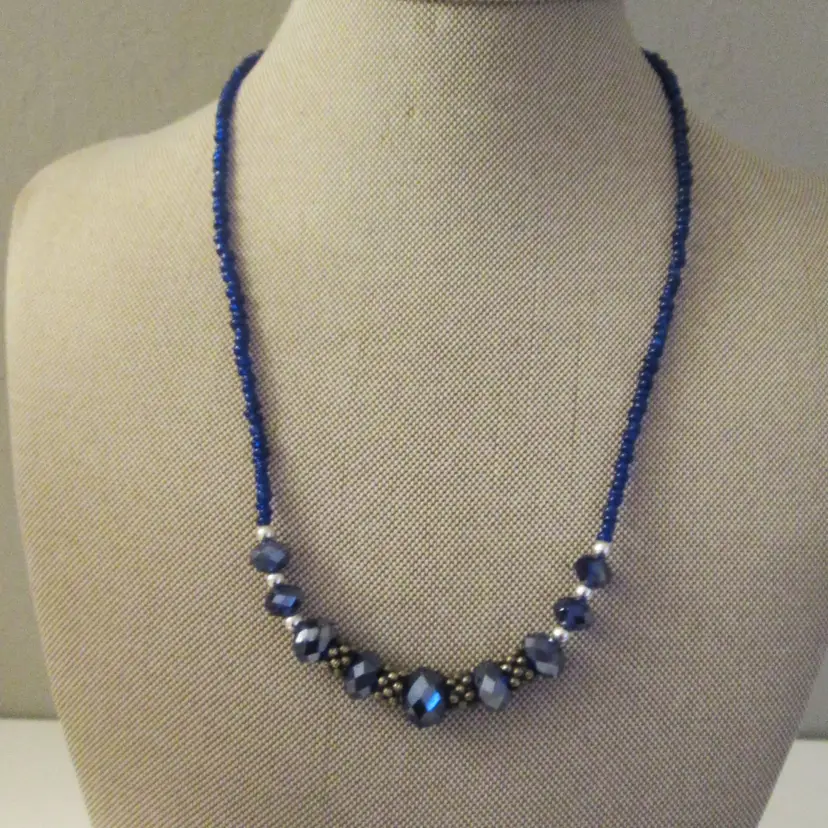Stunning upcycled Bohemian style necklace with faceted cobalt blue glass beads. Length measures 18" to 20" with adjustment.