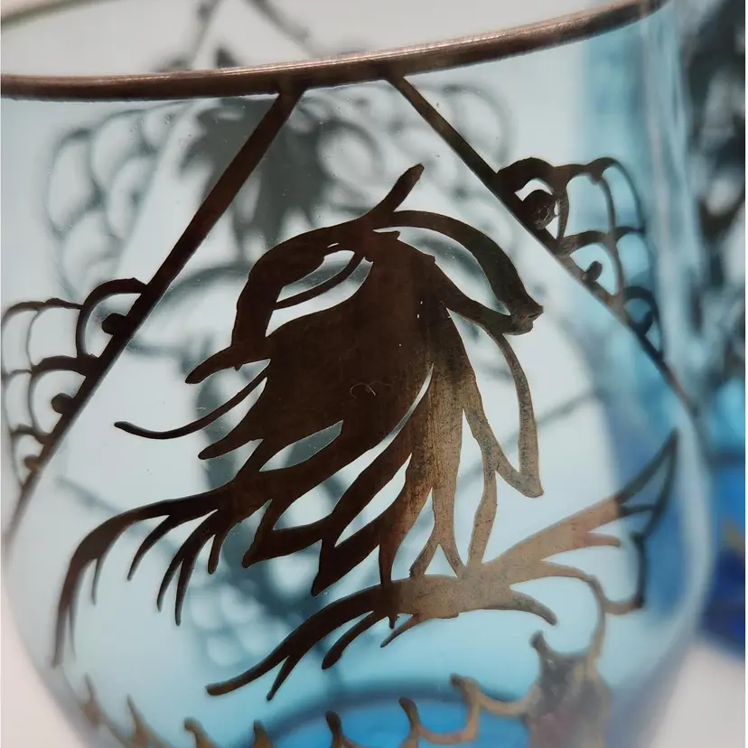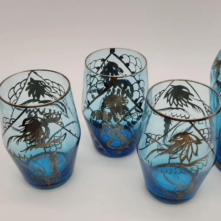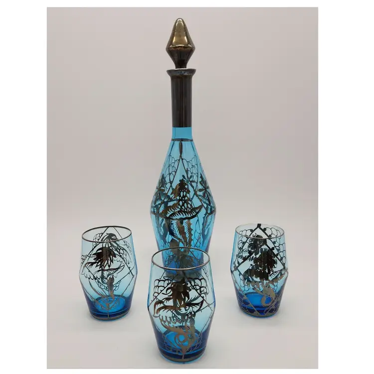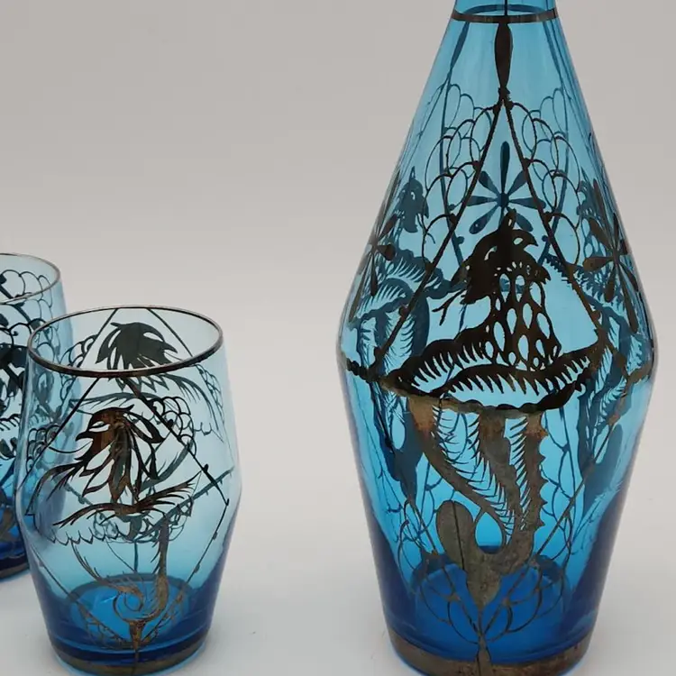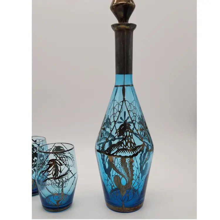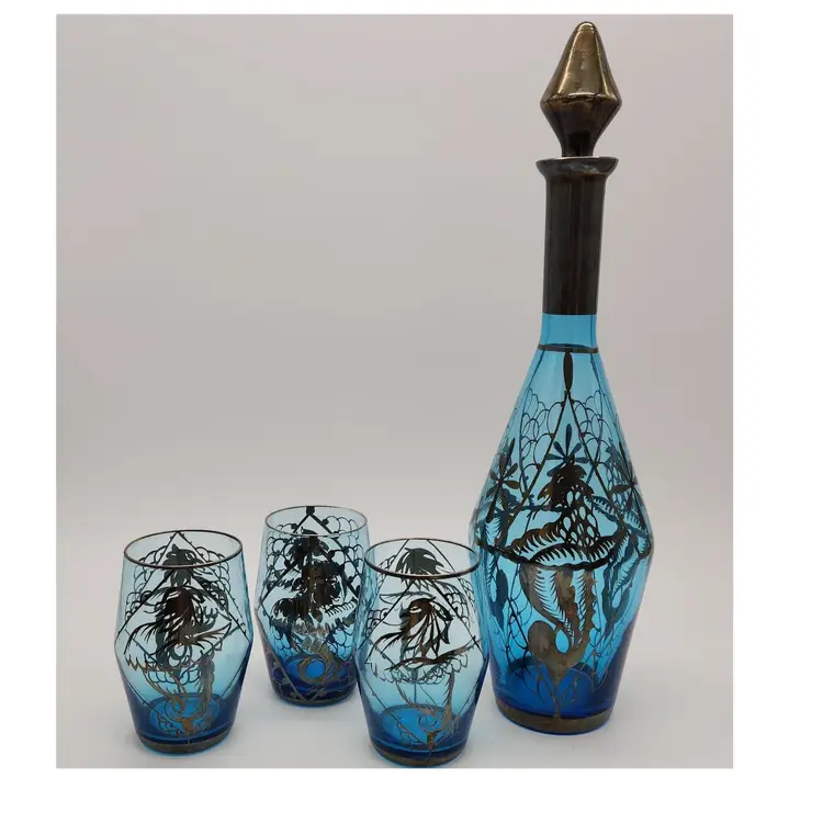 Bohemian or Czech Glass Decanter 14"H + 3 Cordial Glasses. SILVER OVERLAY is DRAGON or PHOENIX design - each one slightly different and SO COOL! No chips or cracks. A few minor scratches and slight wear to the overlayed design, which needs polished but I'll leave that to you. Thanks for looking!