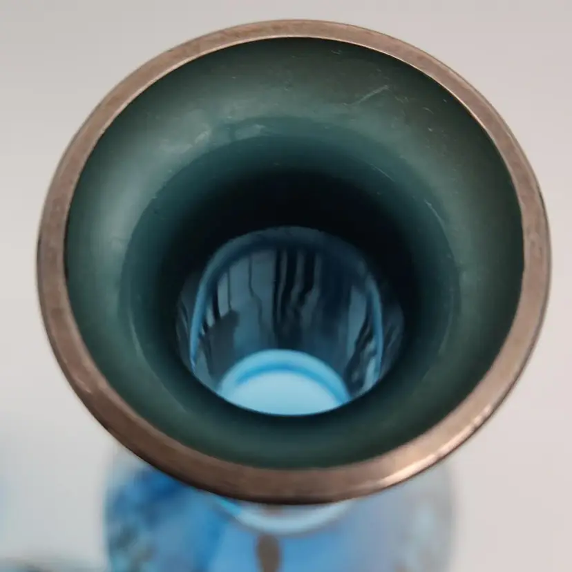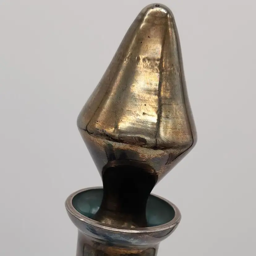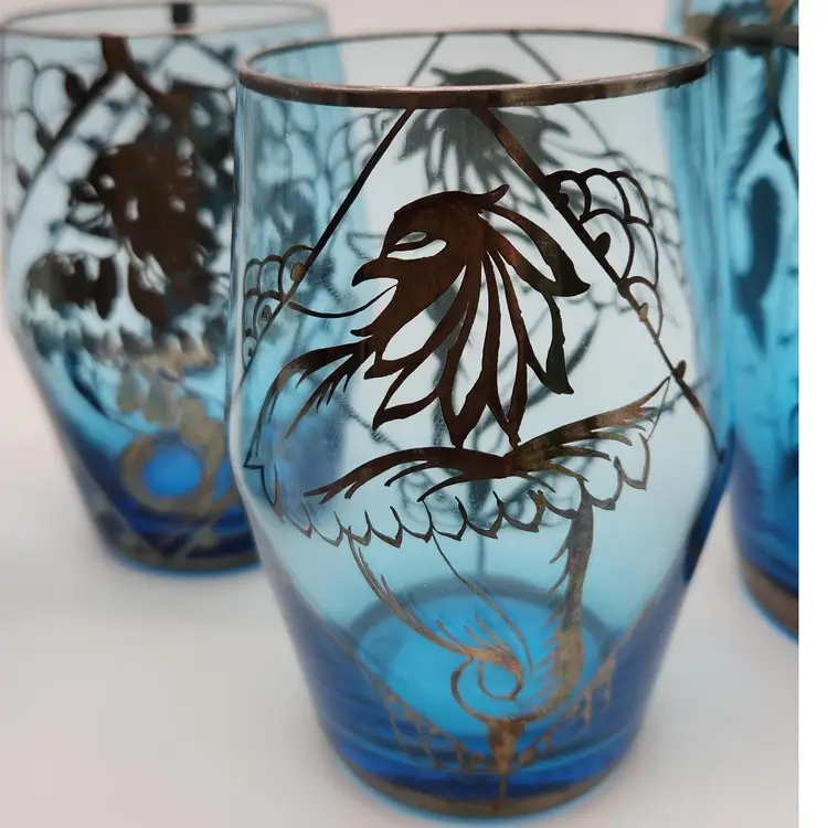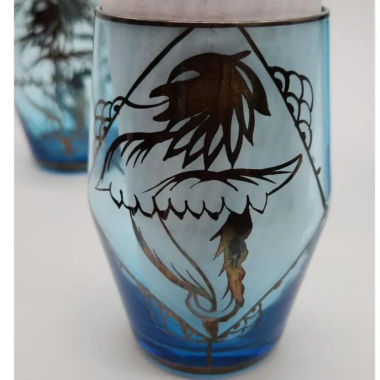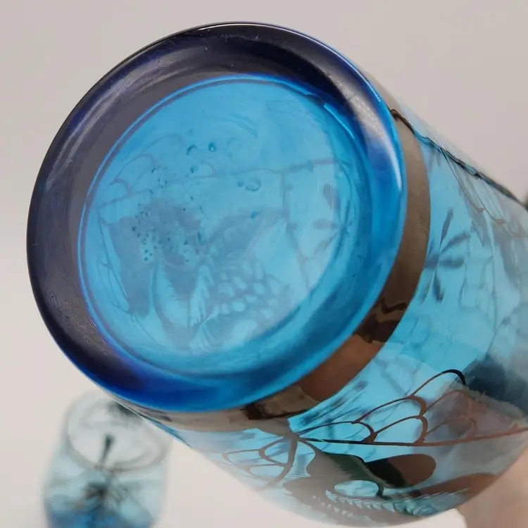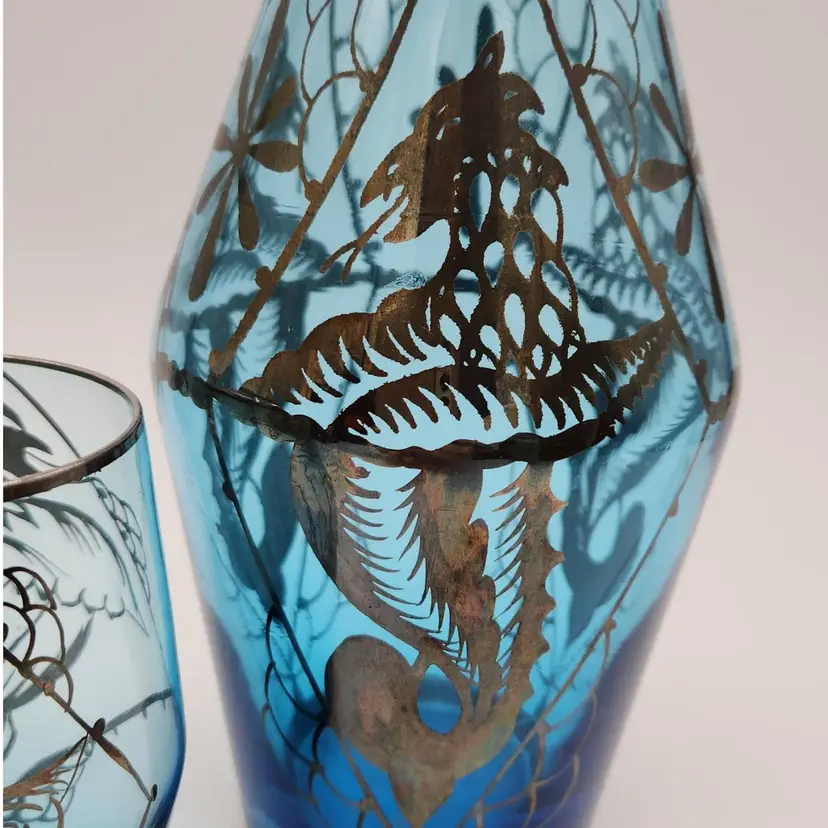 Bohemian or Czech Glass Decanter 14"H + 3 Cordial Glasses. SILVER OVERLAY is DRAGON or PHOENIX design - each one slightly different and SO COOL! No chips or cracks. A few minor scratches and slight wear to the overlayed design, which needs polished but I'll leave that to you. Thanks for looking!