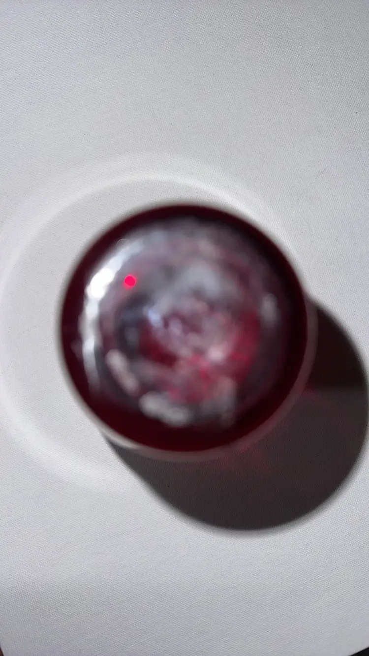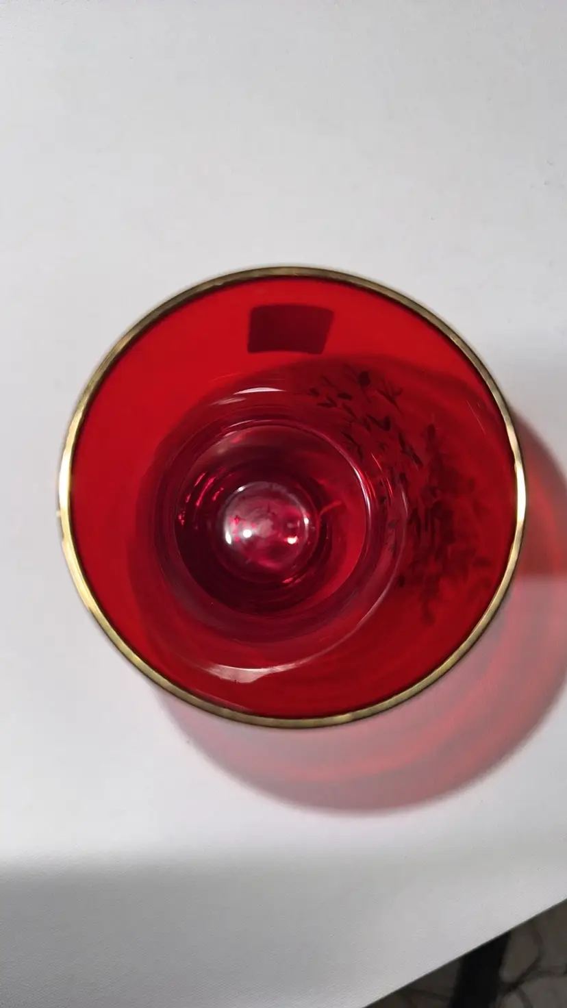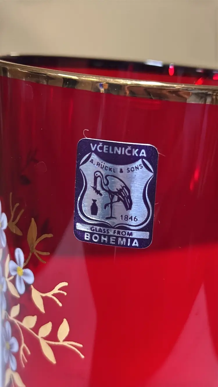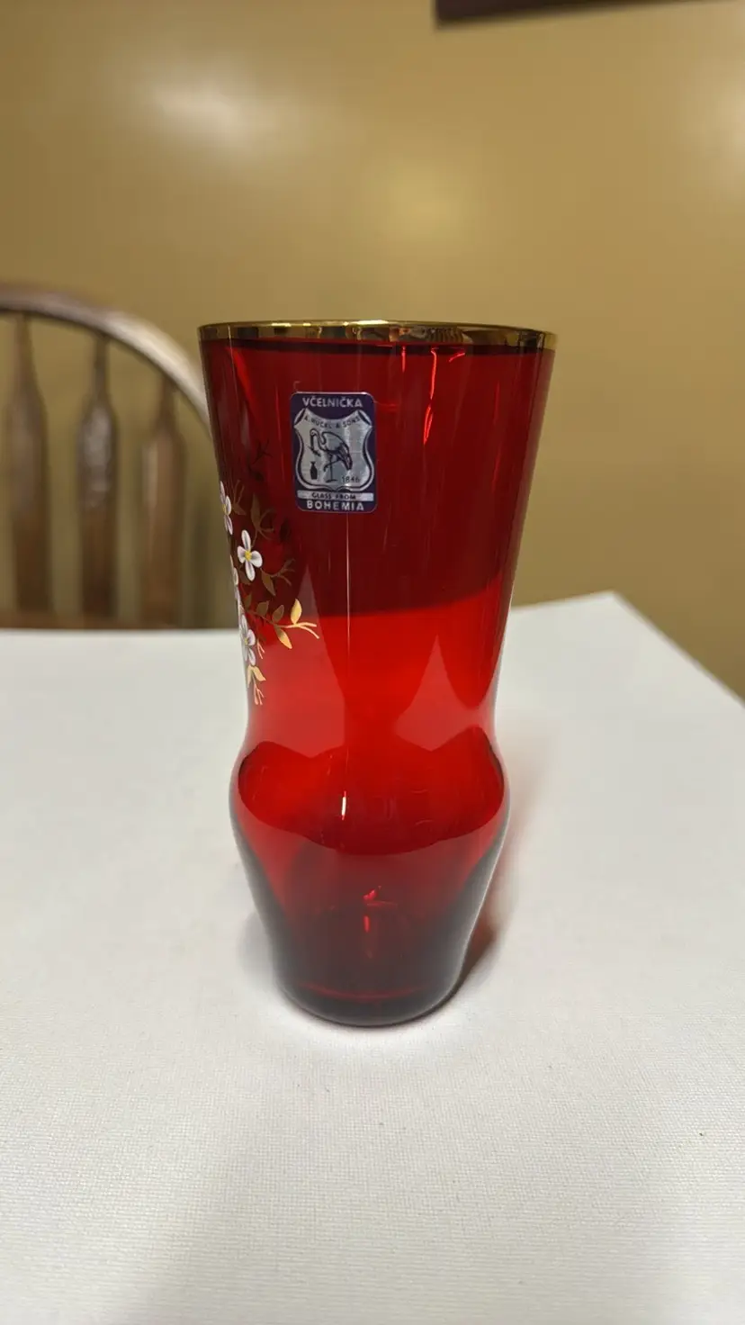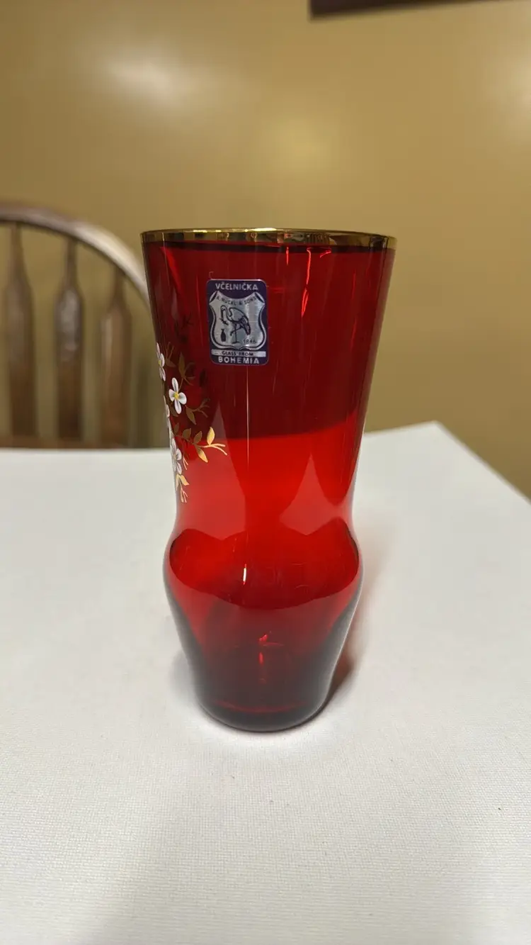 Vintage Bohemian Red and Gold Vase With Hand Painted Floral Design 6” tall 2 7/8” diameter opening on top Gold trim and leaves with white flowers Original sticker Beautiful vase with no breaks or chips (12913025a)