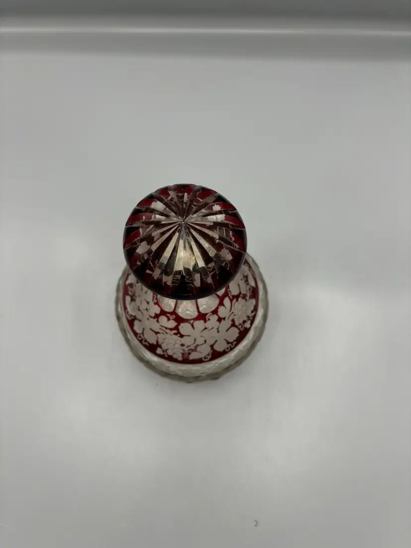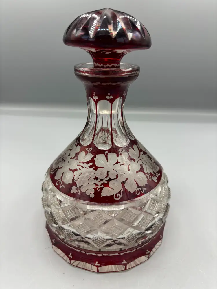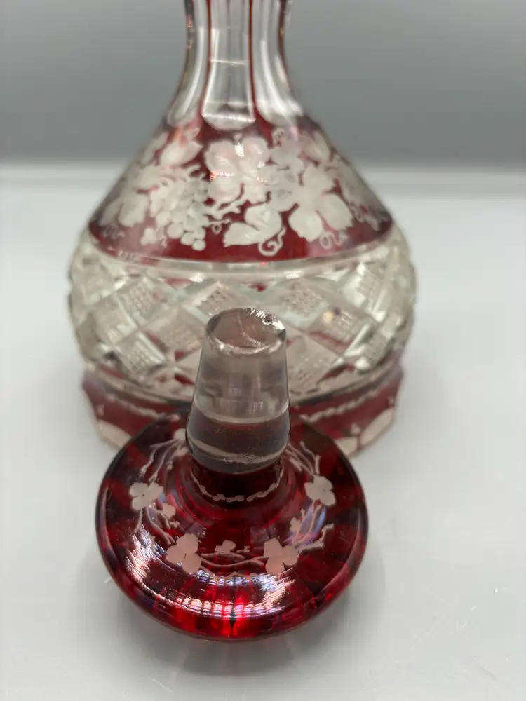 Bohemian Ruby cut to clear decanter with stopper that would make a great conversation decanter at any gathering. The stopper has chips, refer to the pictures for details.