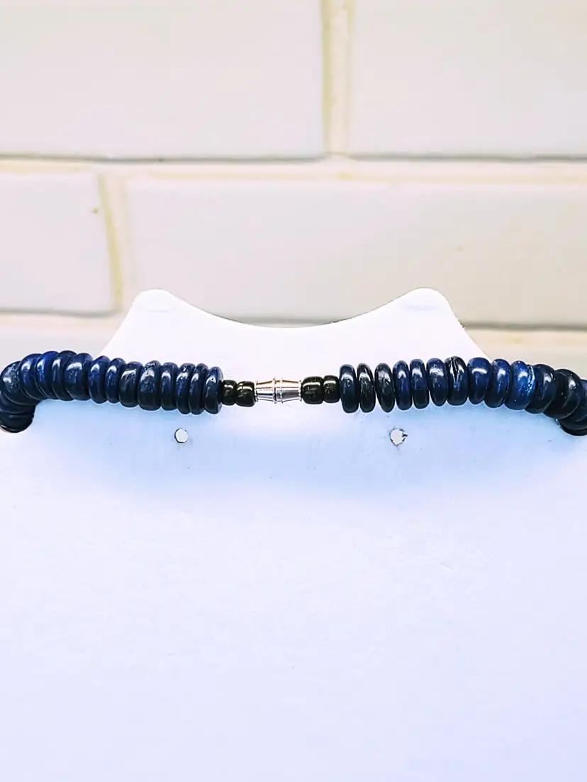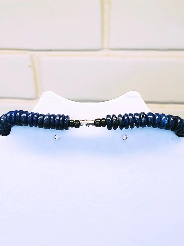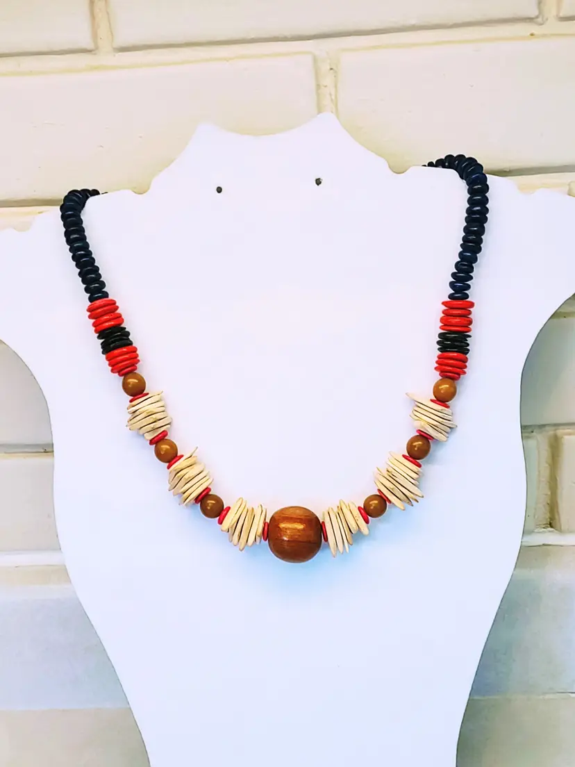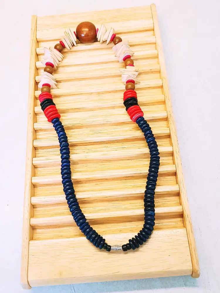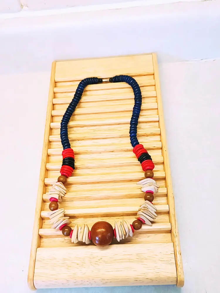 This Bohemian Tribal Vintage Wood Multi-Shaped Beaded Necklace is a statement piece that is handmade in the United States. The necklace features a variety of navy blue, red, tan, and cream-colored beads made of wood, with a stainless steel barrel closure. It is nickel-free and has a vintage style, perfect for adding a unique touch to any outfit. Ideal for a birthday gift, this bohemian-themed piece exudes ethnic flair and is sure to make a stylish statement.