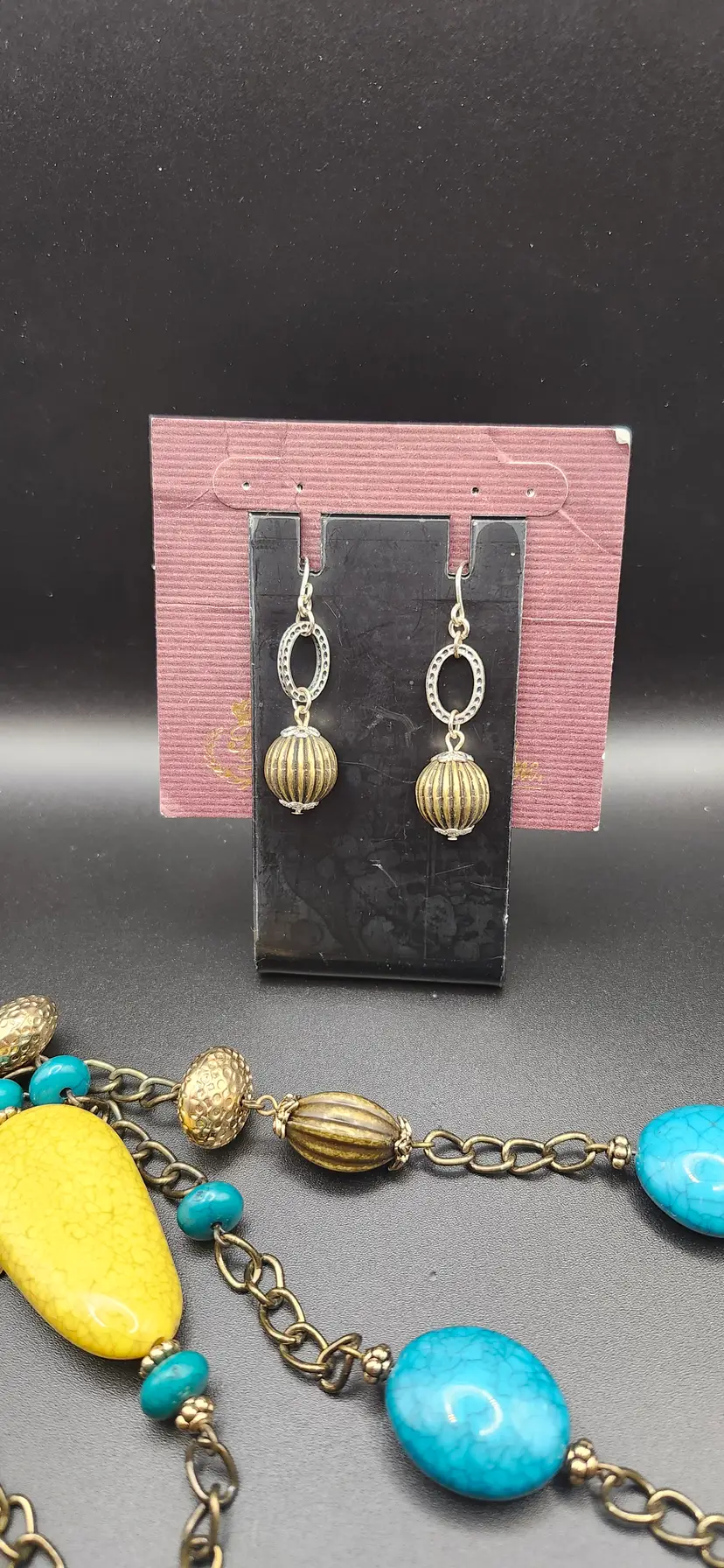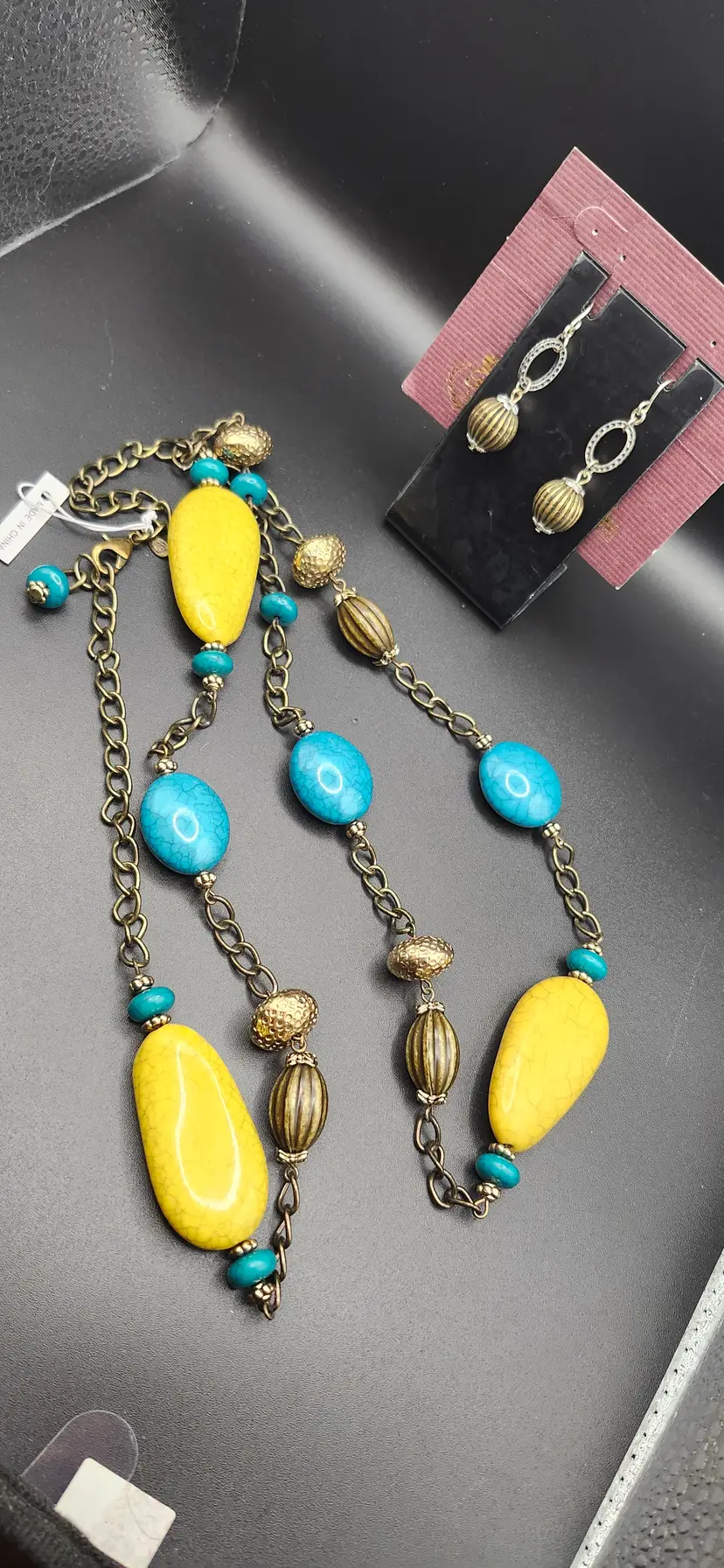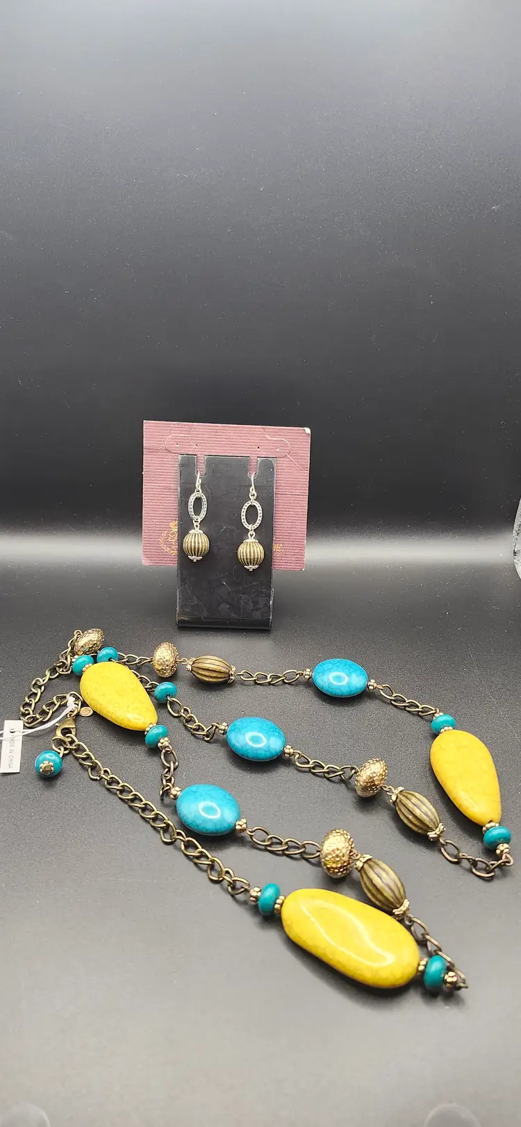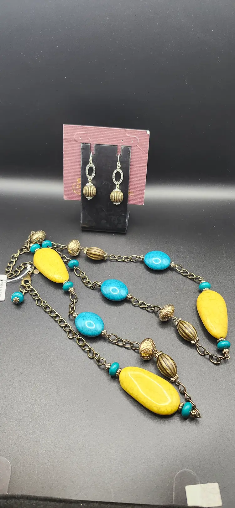 Add a pop of color to your outfit with this boho chic necklace and earring set. Featuring vibrant turquoise and yellow beads paired with antique gold-tone accents, this set is perfect for casual outings or a fun night out. The long chain design offers versatility, while the matching earrings complete the look effortlessly.