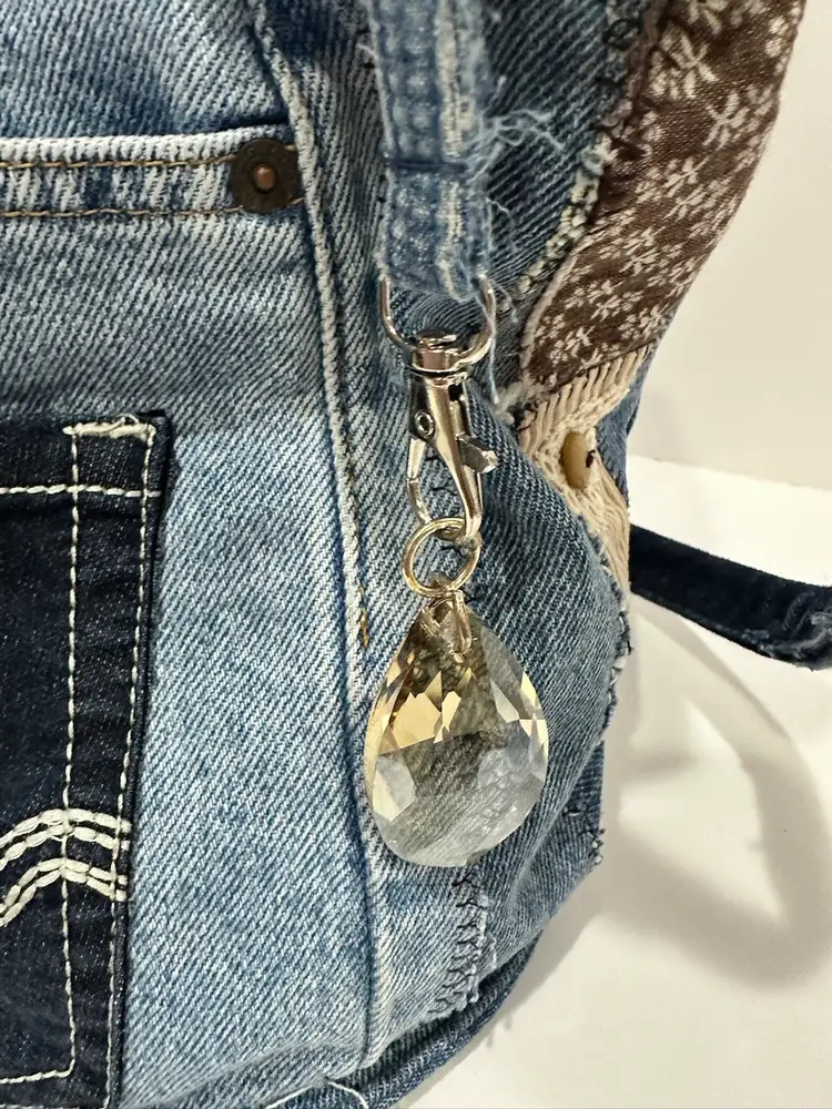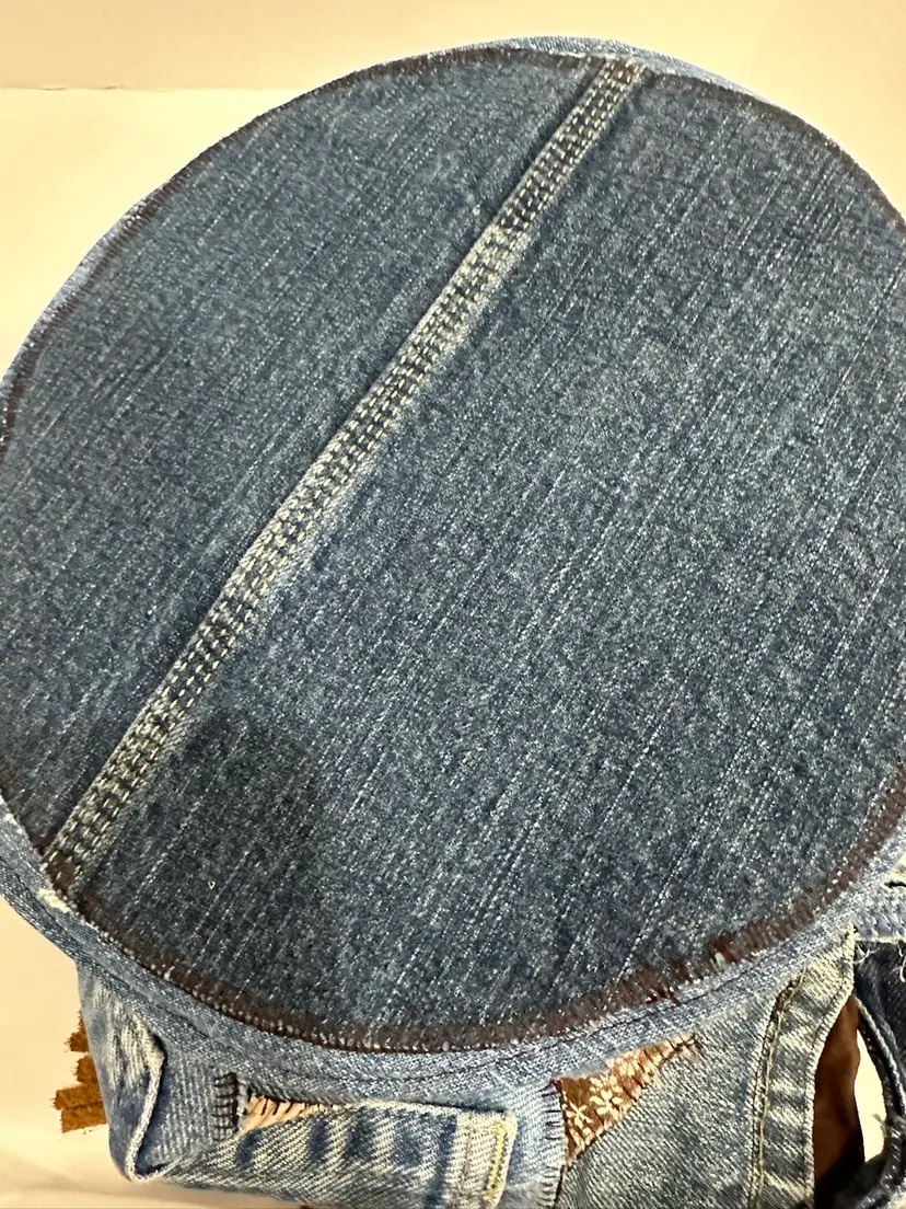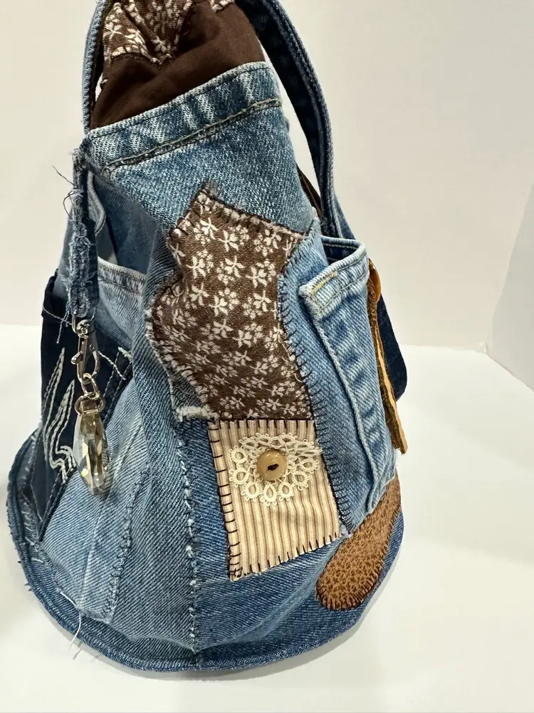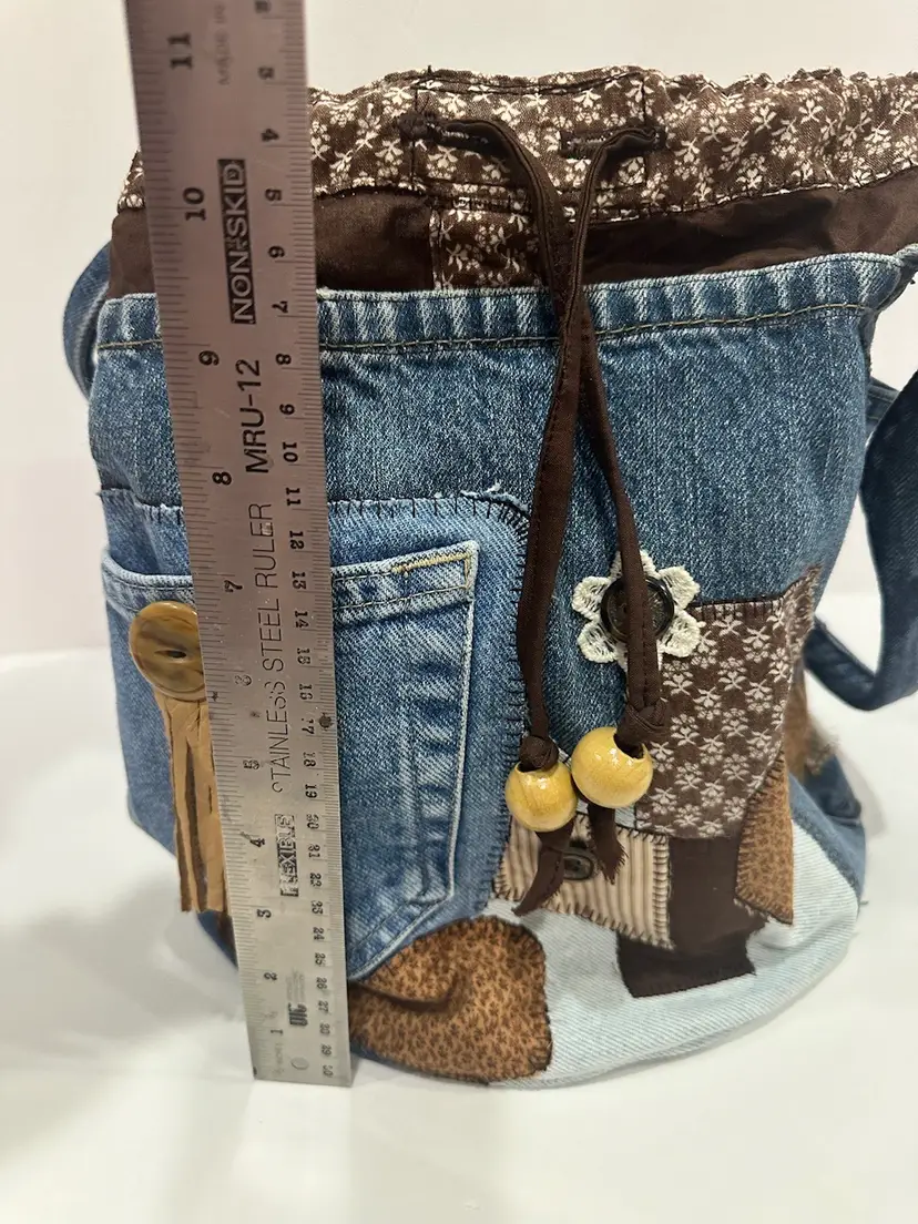 A gorgeous handmade upcycled denim barrel bag that’s both stylish and sustainable. Perfect as a purse, tote, or carry-all, this one-of-a-kind bag blends denim with patchwork fabric for a rustic, boho vibe.