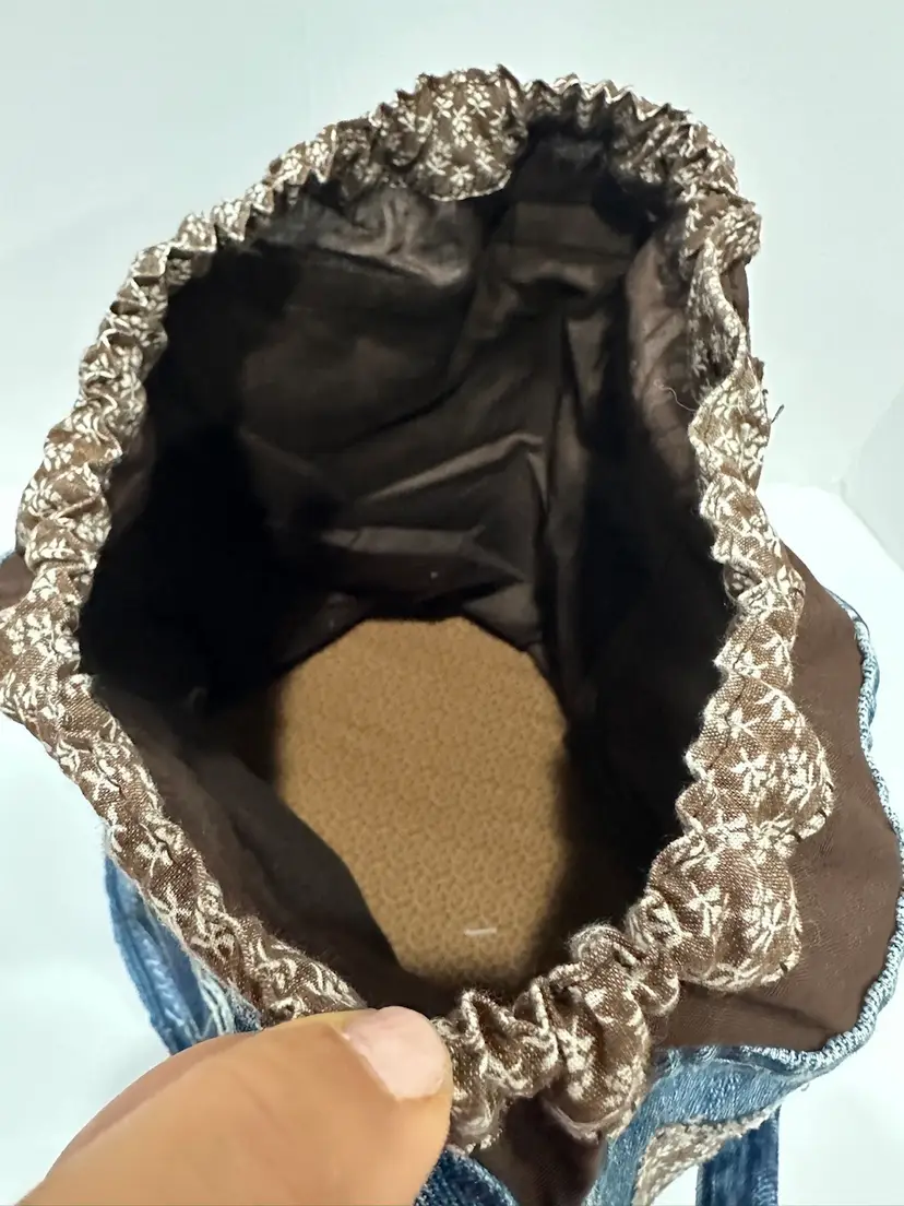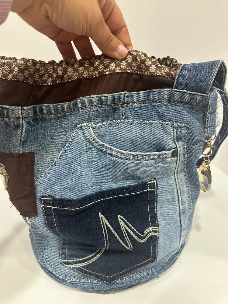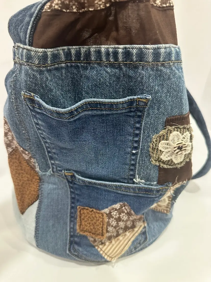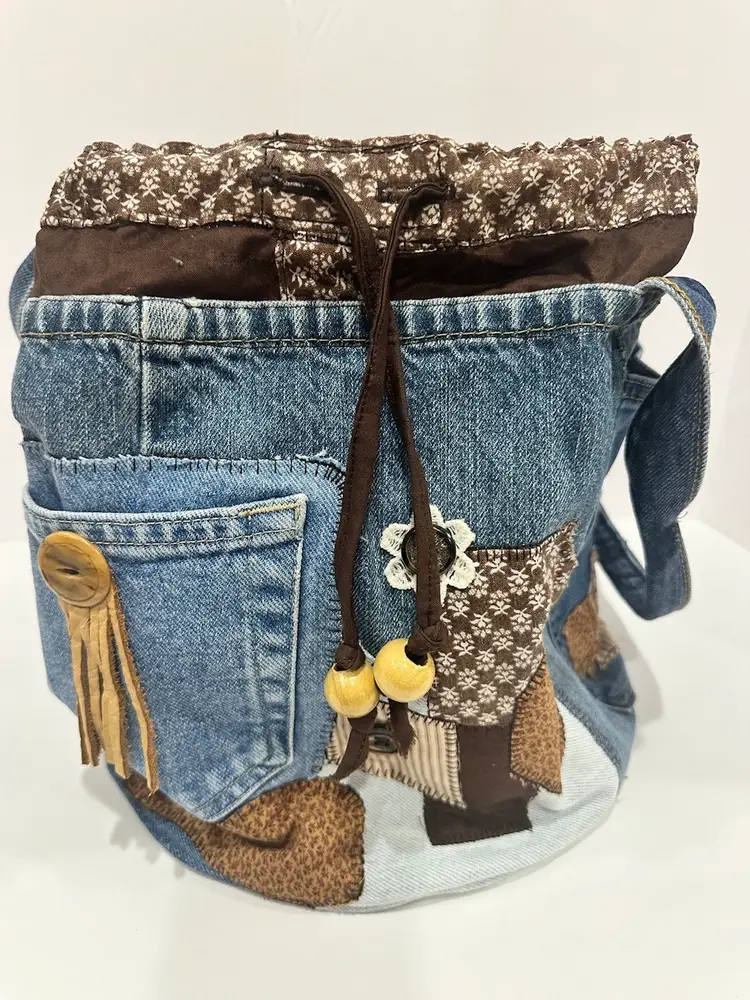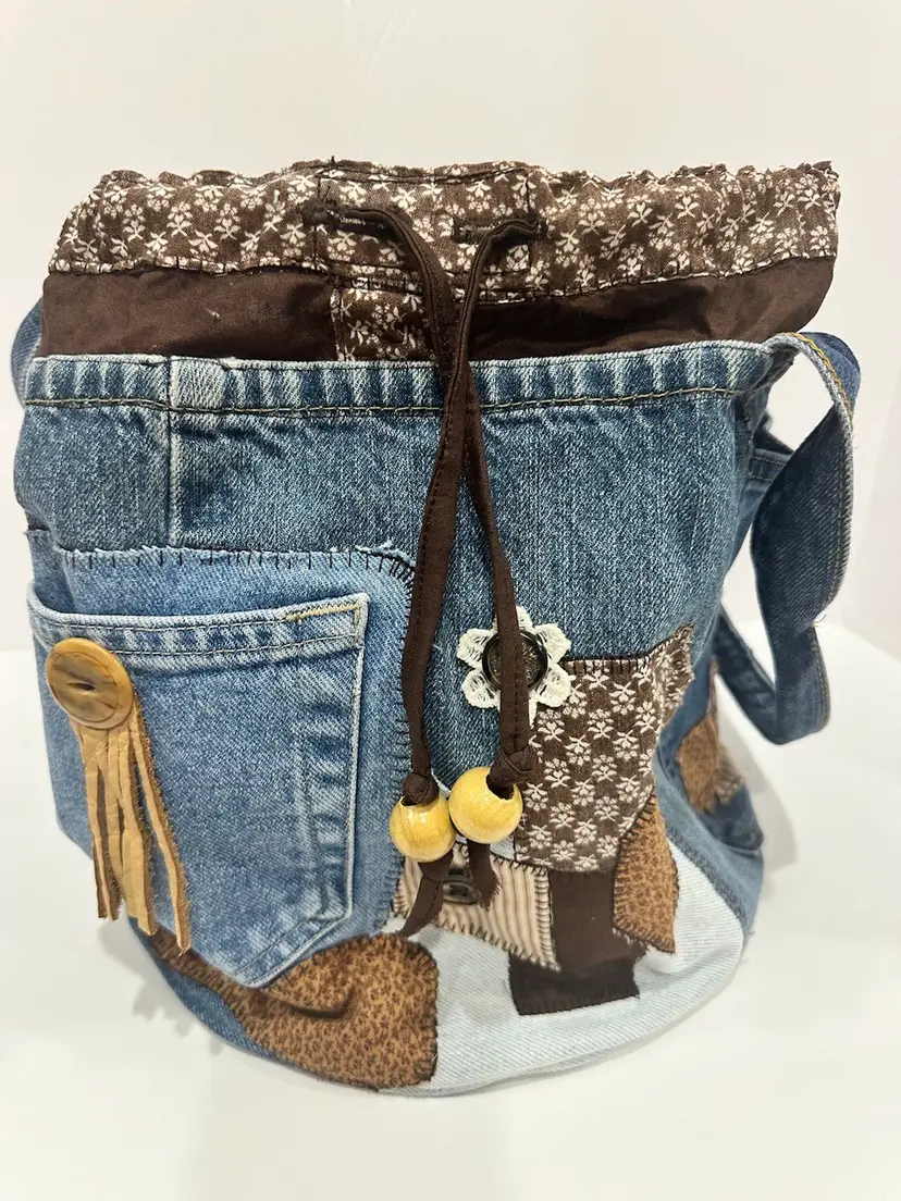 ✨ Features: • Made from repurposed vintage denim & fabrics • Barrel shape with sturdy base – roomy and functional • Fully lined interior for durability • Plenty of pockets inside & out for organization • Cute drawstring closure with bead detail • Size: [add measurements if available] • Style: boho, cottagecore, vintage-inspired, eco-friendly
