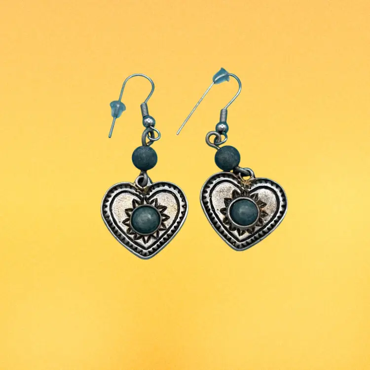 Add a touch of rustic charm with these bohemian heart dangle earrings. Each silver-tone heart features detailed stamped edging and a central green stone-like accent, topped with a coordinating bead. Lightweight and easy to wear, they bring a vintage-inspired, earthy feel to any outfit.