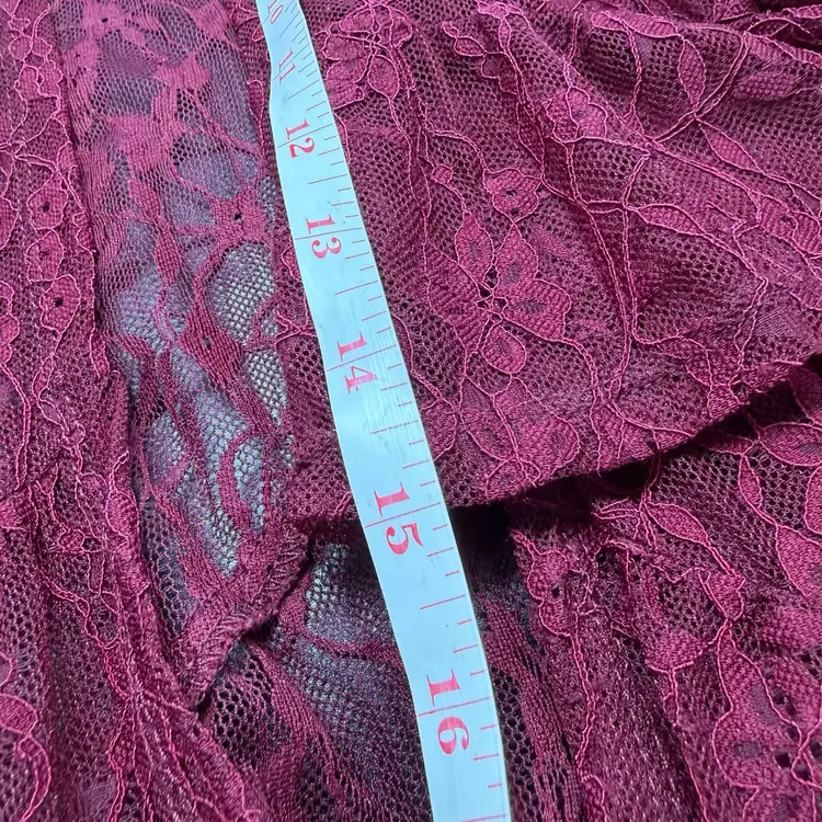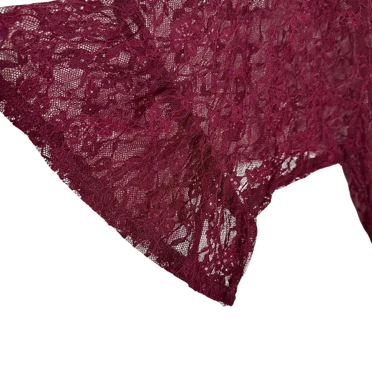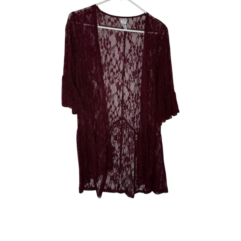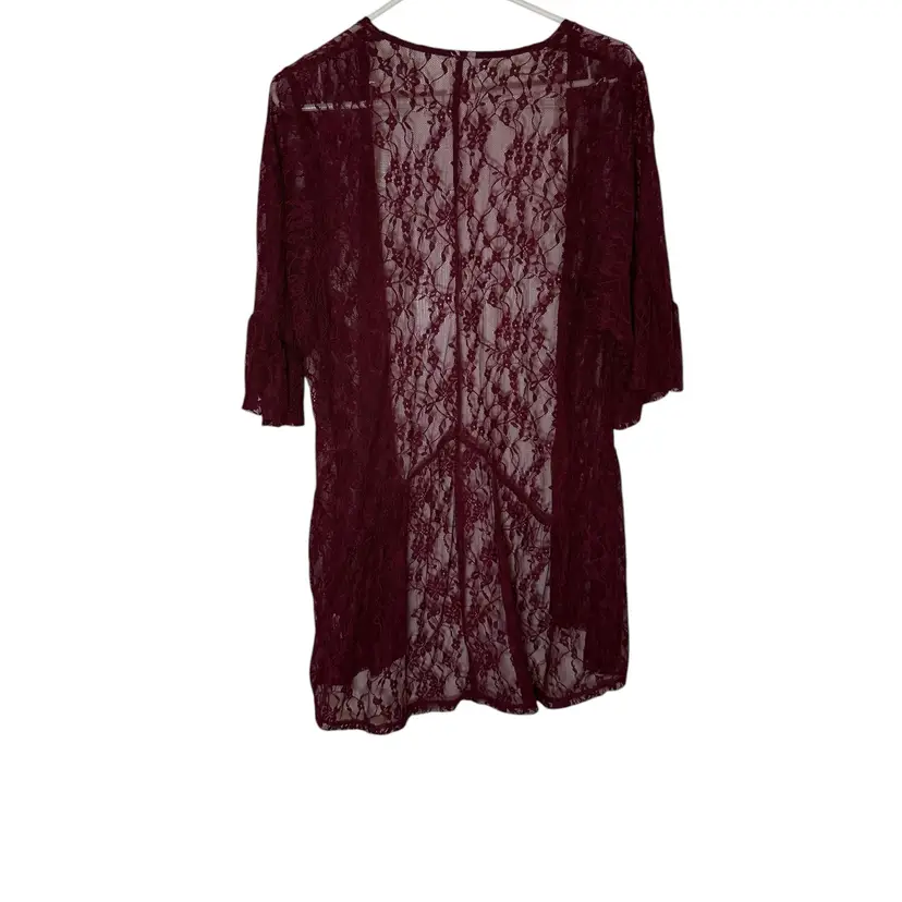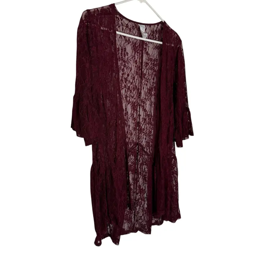 This Boho Lace Kimono Cardigan in Burgundy is perfect for those who embrace a relaxed and whimsical style. The floral lace design, flounce hem, and ruffled sleeve cuff add a touch of gypsy and hippie flair. Made from nylon and spandex, this sheer duster is ideal for layering over outfits in any season. The open front cover up offers a versatile and stylish addition to your wardrobe.