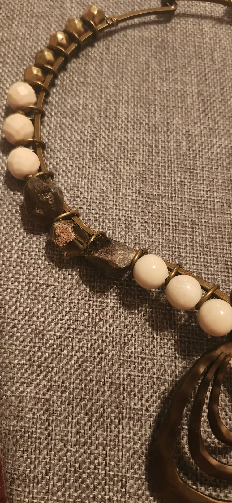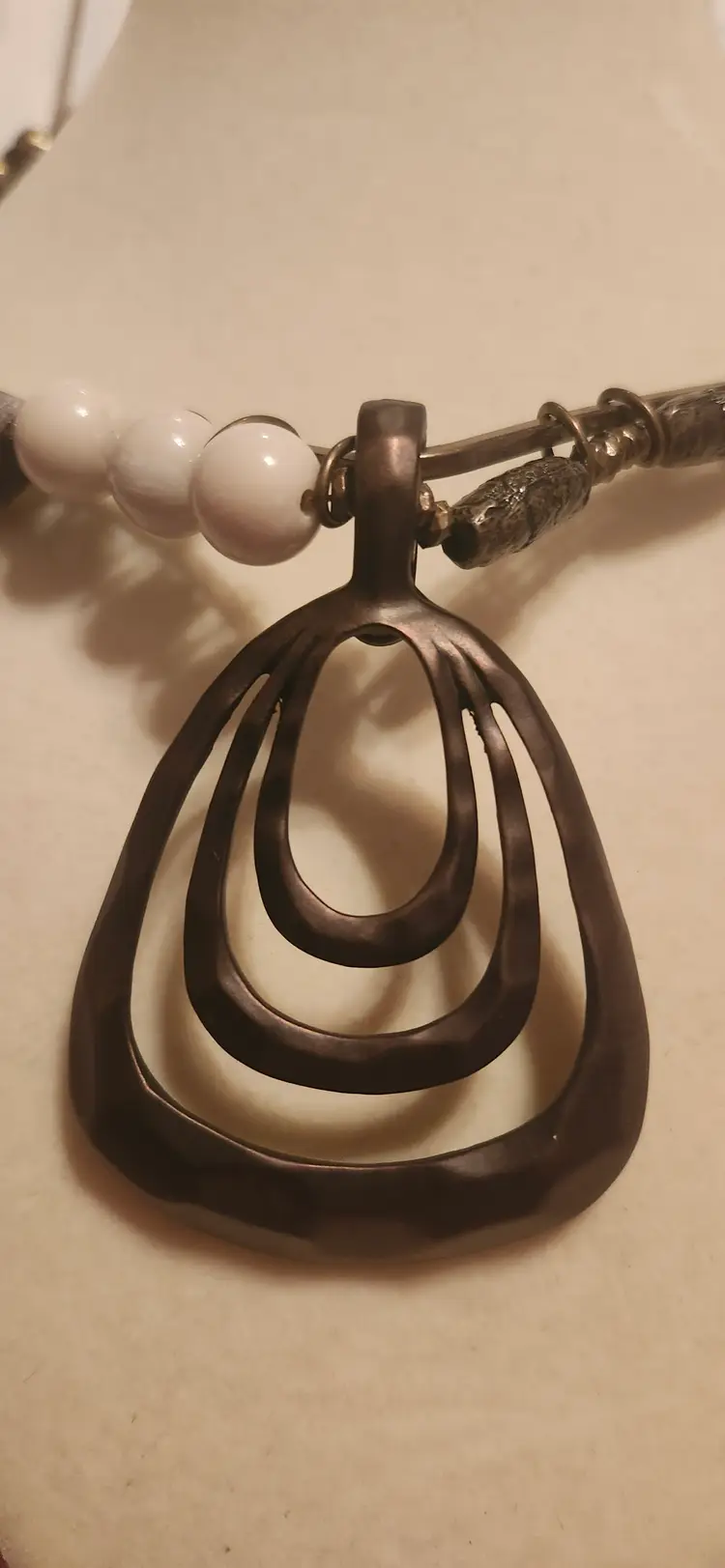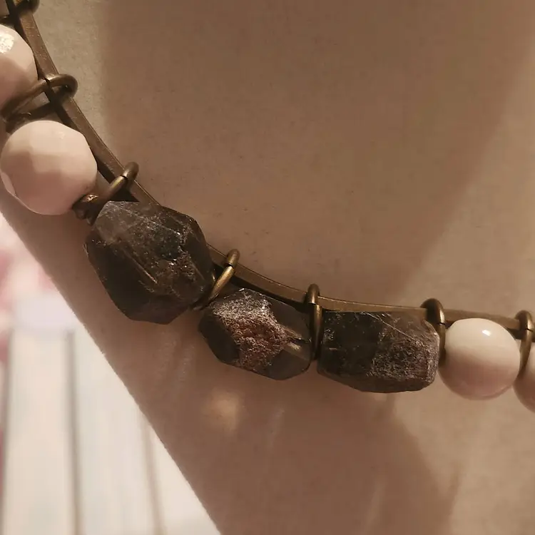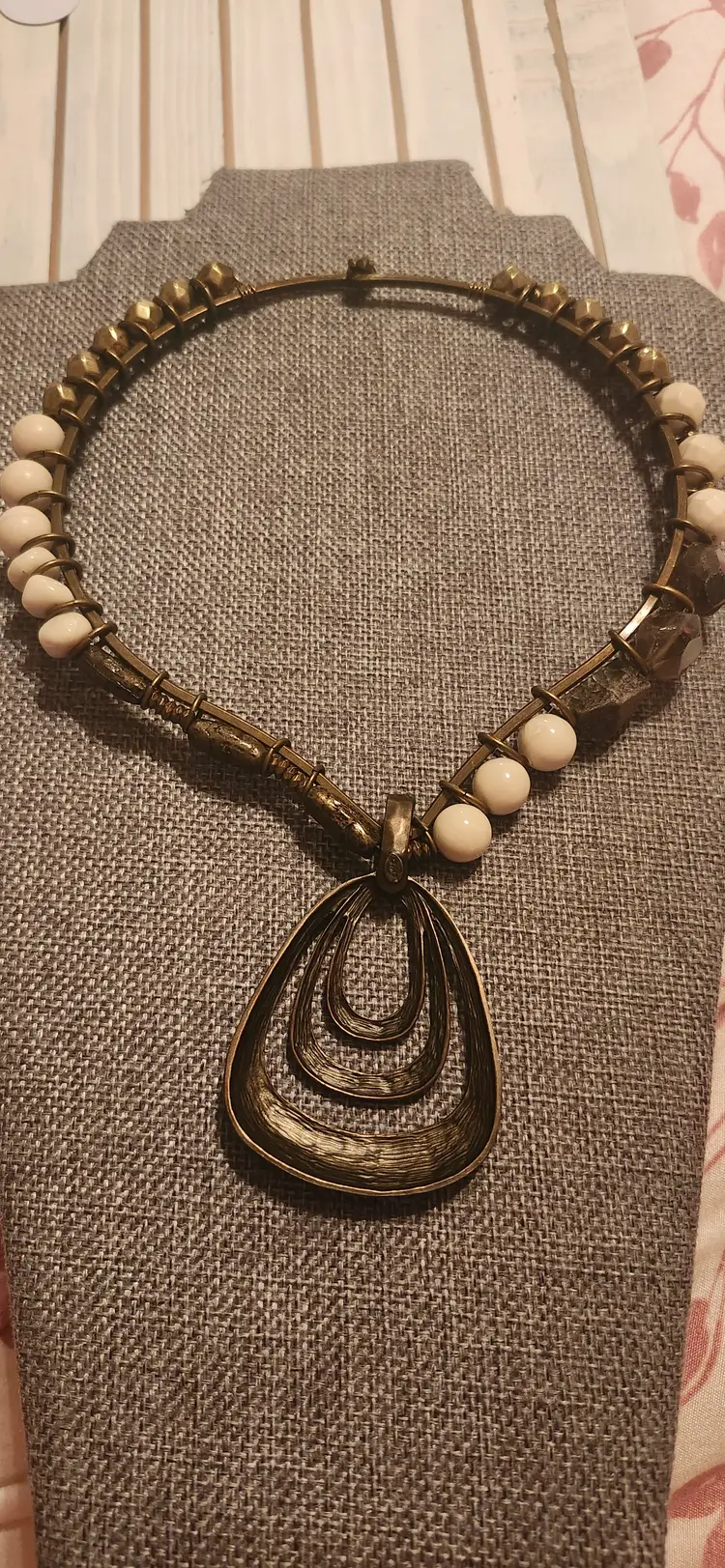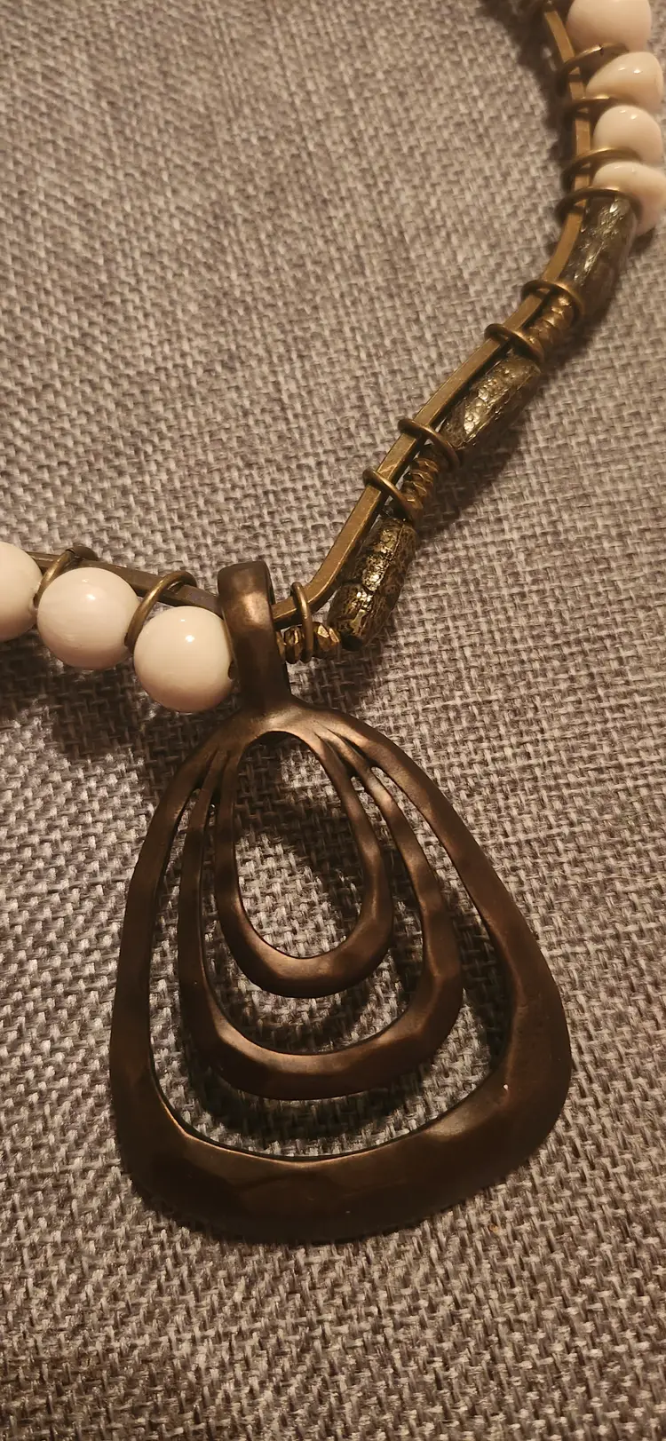 Make statement with his striking ~ Premier Designs necklace featuring a nix of geometric cream-toned beads, textured bronze accents, and a bold, layered openwork pendant. The tribal-inspired design combines nodern and earthy elements, perfect for elevating any outfit. Lightweight yet impactful, this necklace sits comfortably around the neck and it adds unique flair both casual and dressy looks. Brand: Premier Designs . Color: Bronze-tone metal with cream beads . Closure: Hook clasp . Pendant: Multi-layered open teardrop shape