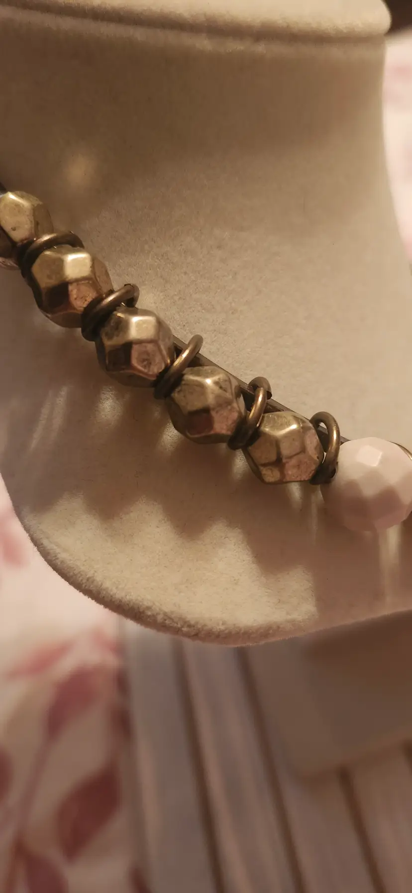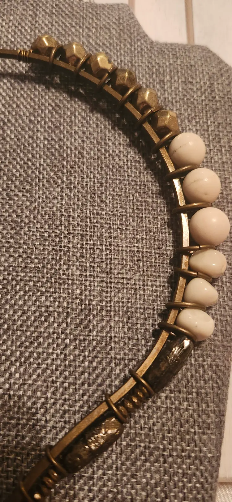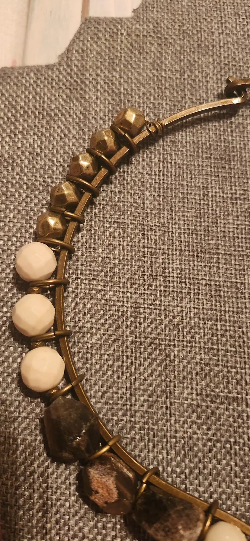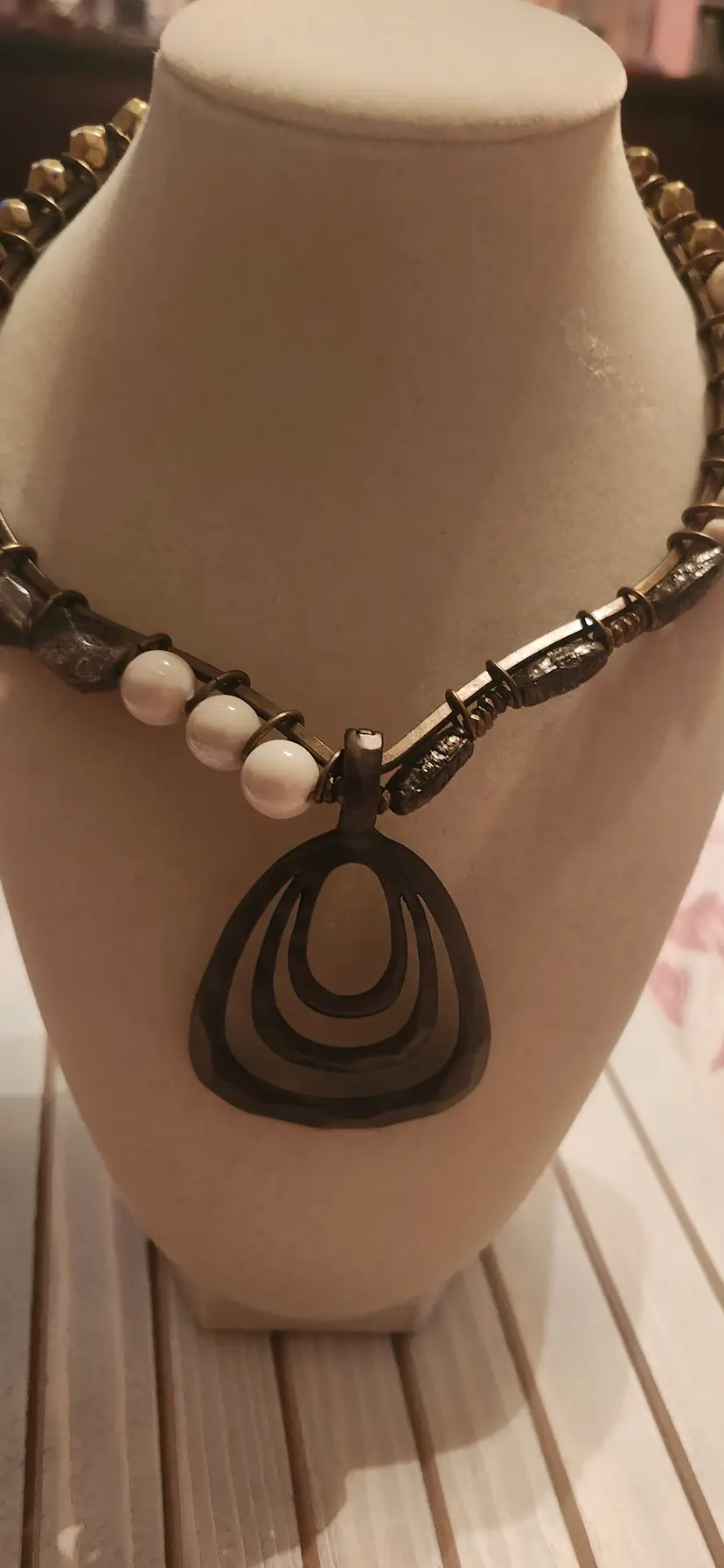 Make statement with his striking ~ Premier Designs necklace featuring a nix of geometric cream-toned beads, textured bronze accents, and a bold, layered openwork pendant. The tribal-inspired design combines nodern and earthy elements, perfect for elevating any outfit. Lightweight yet impactful, this necklace sits comfortably around the neck and it adds unique flair both casual and dressy looks. Brand: Premier Designs . Color: Bronze-tone metal with cream beads . Closure: Hook clasp . Pendant: Multi-layered open teardrop shape