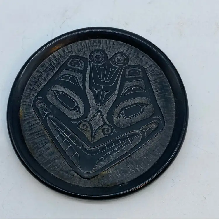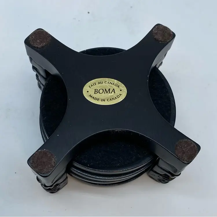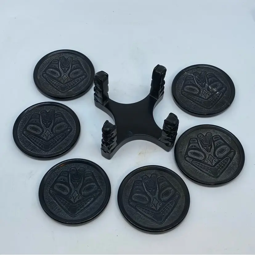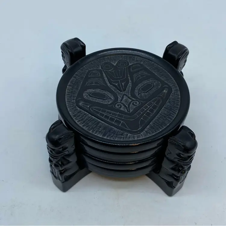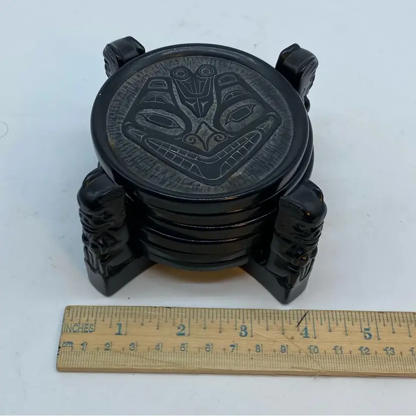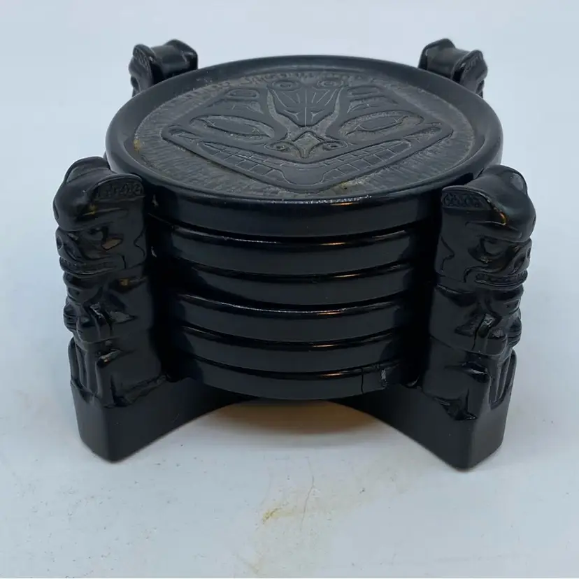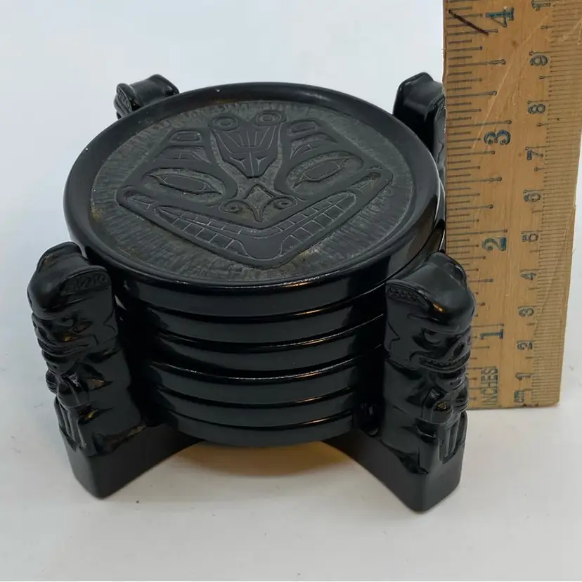 This great set of 6 coasters all feature the bear totem shown. The rack is totem poles at the four corners to hold them. 5 coasters and stand are in very good undamaged condition with no chips, cracks, wear or repair One coaster has crack and repair. Stand still has the original Boma gold foil stickers attached. Approximately 4 x 3 inches