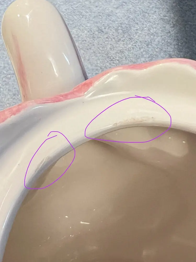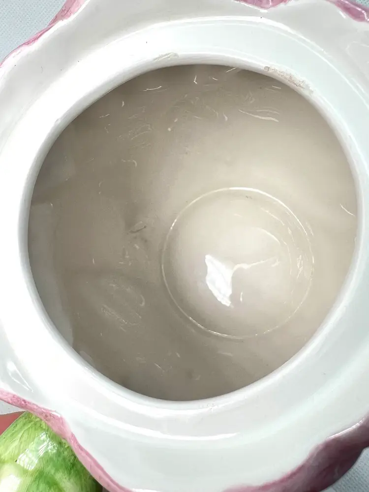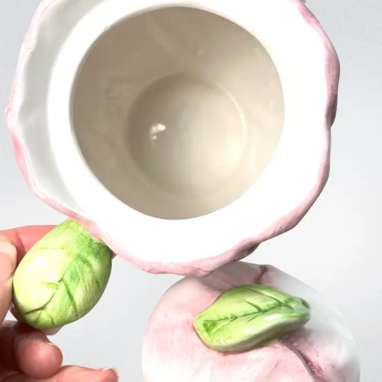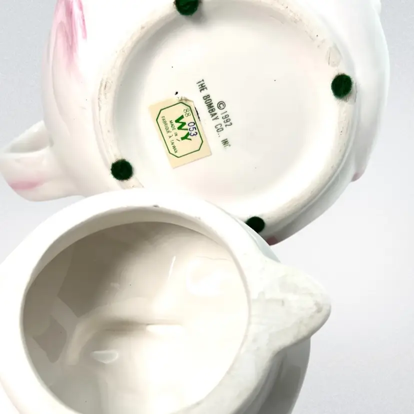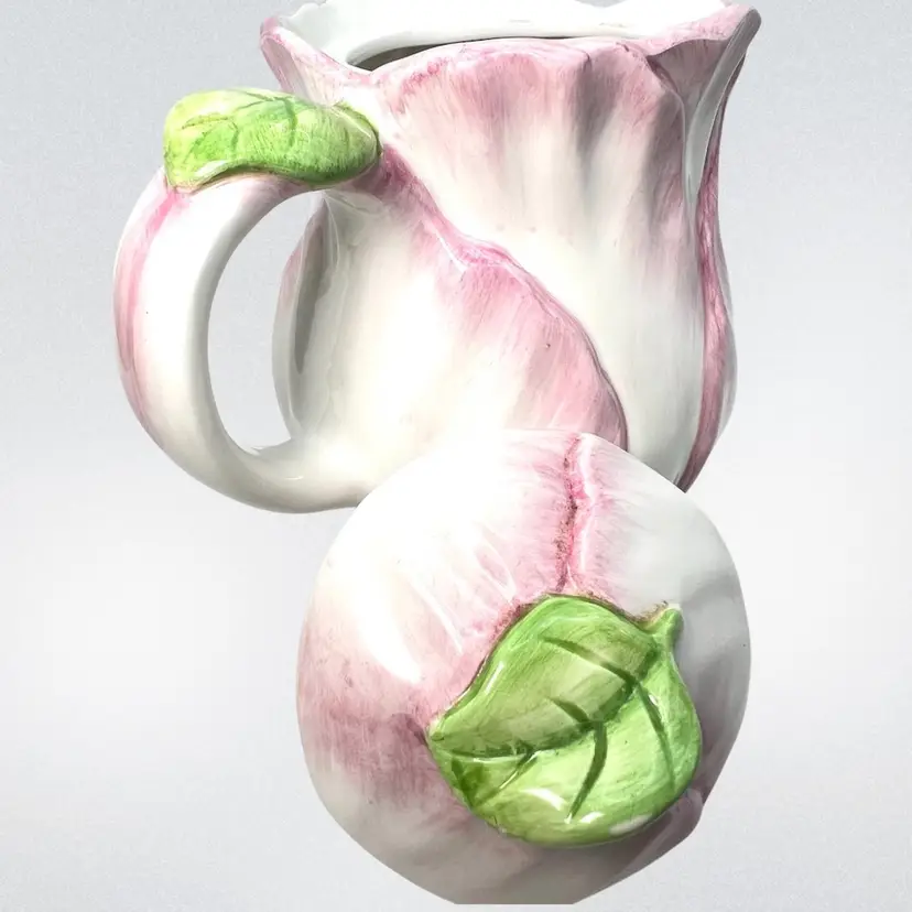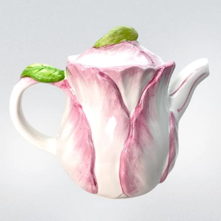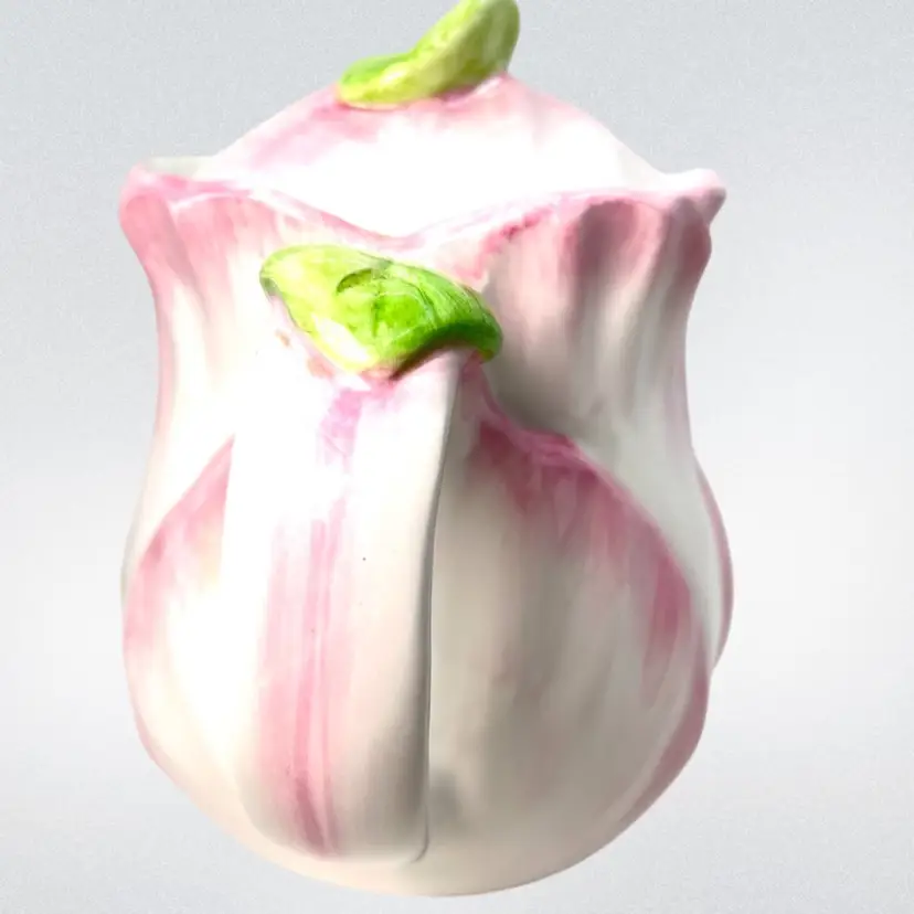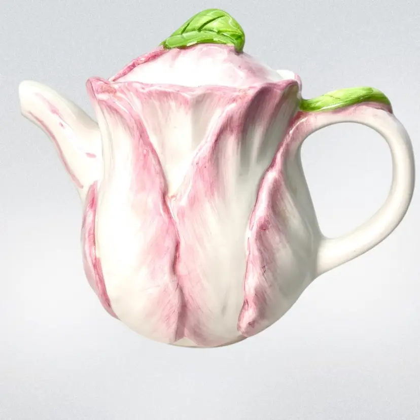 Pink Tulip Flower Shaped Decorative Teapot. “Spring Blossoms” vintage pattern Stamped Bombay Company Inc 1992 Original sticker on bottom. Beautiful display piece Approx 7” high with lid x 8” handle-to-spout x 5” wide Condition: Lovely soft pink and white with green leaves 3 disclaimers: Please see last photos 🍃small 2/16” glaze chip off green leaf of handle 🫖 2 small rub areas on teapot where lid slides on rim ❤️a patch inside which is not a crack but looks like manuf. flaw like a fold