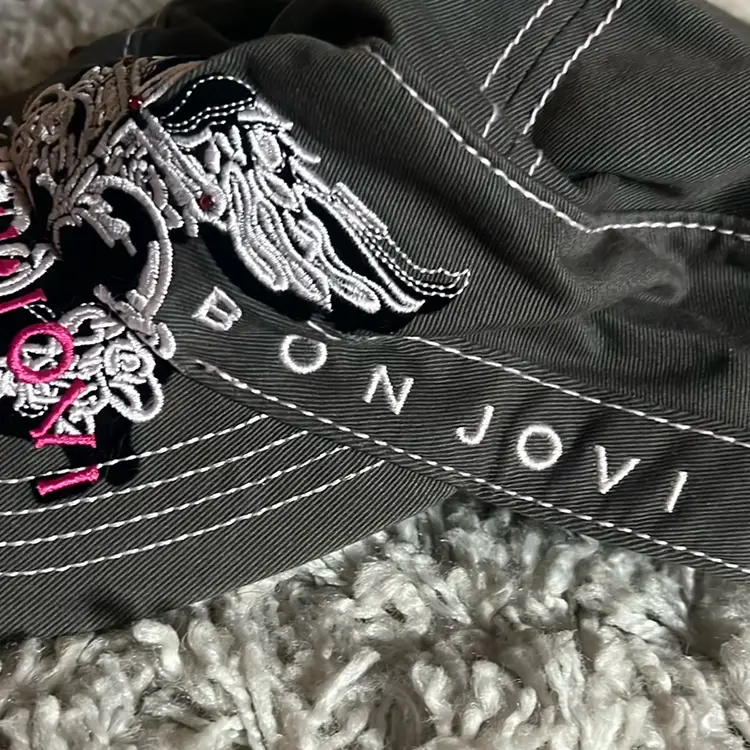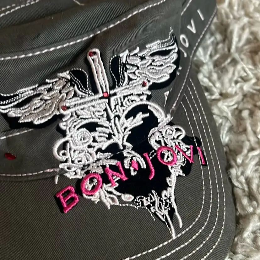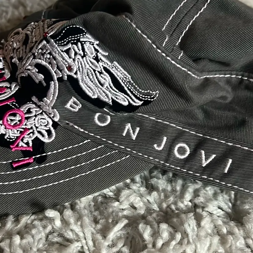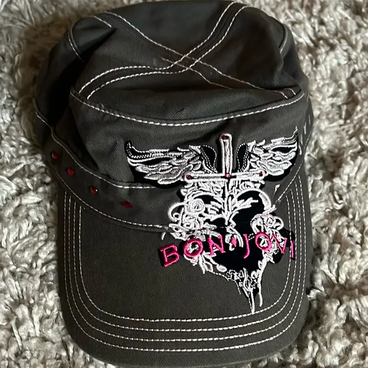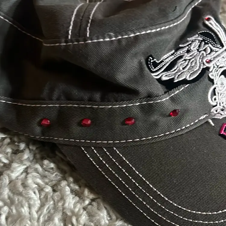 Gray paperboy ball cap with white and pink trim. Pink rhinestones. Velcro closure lightly worn but cleaned. #rock