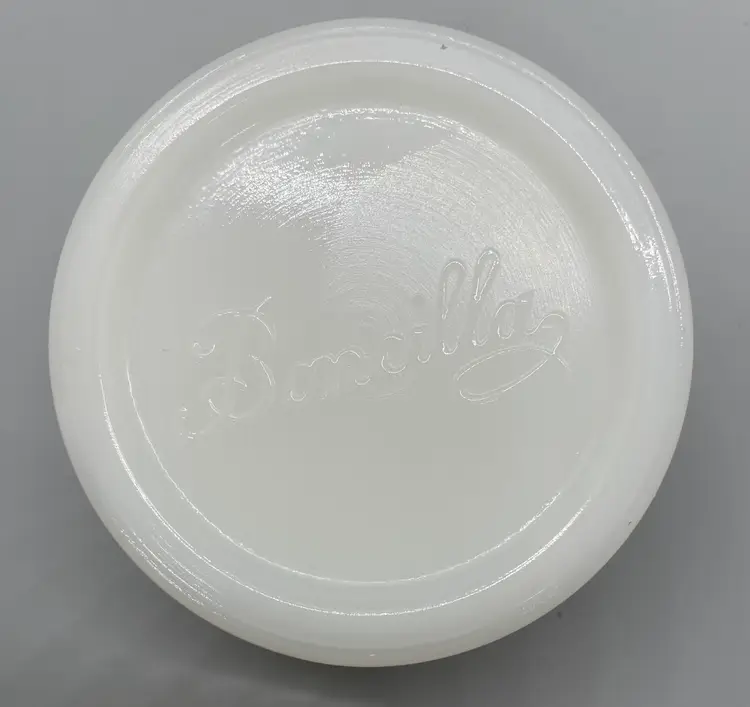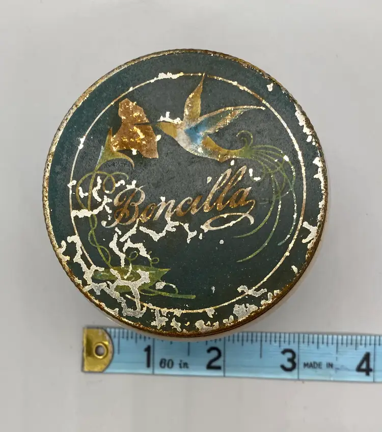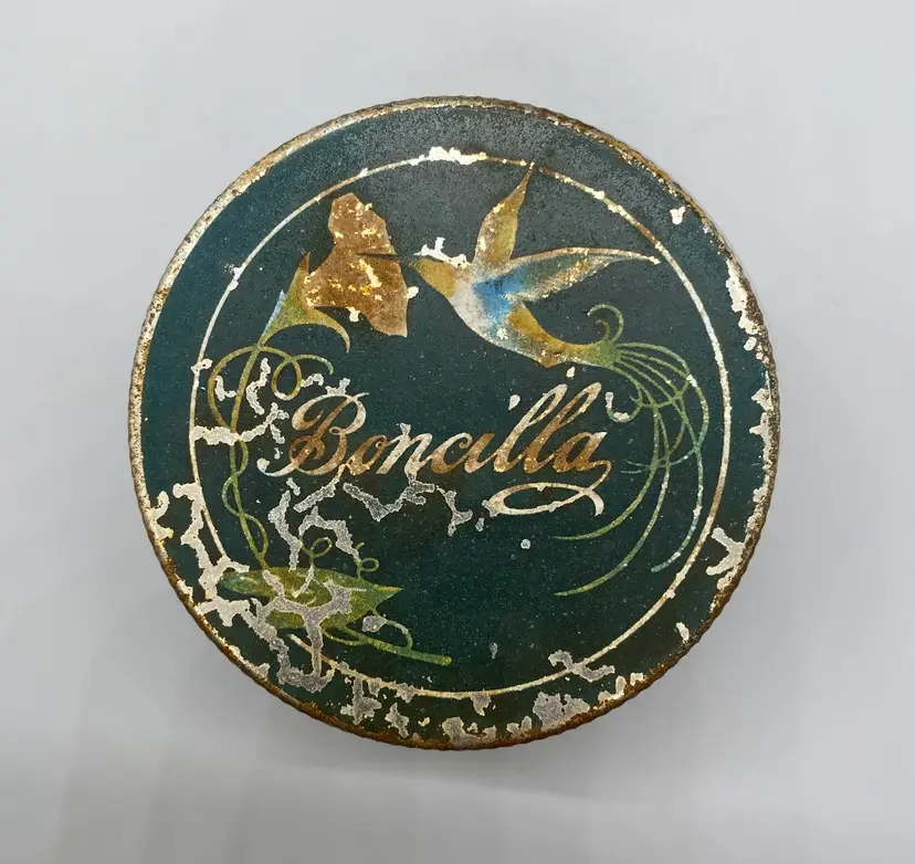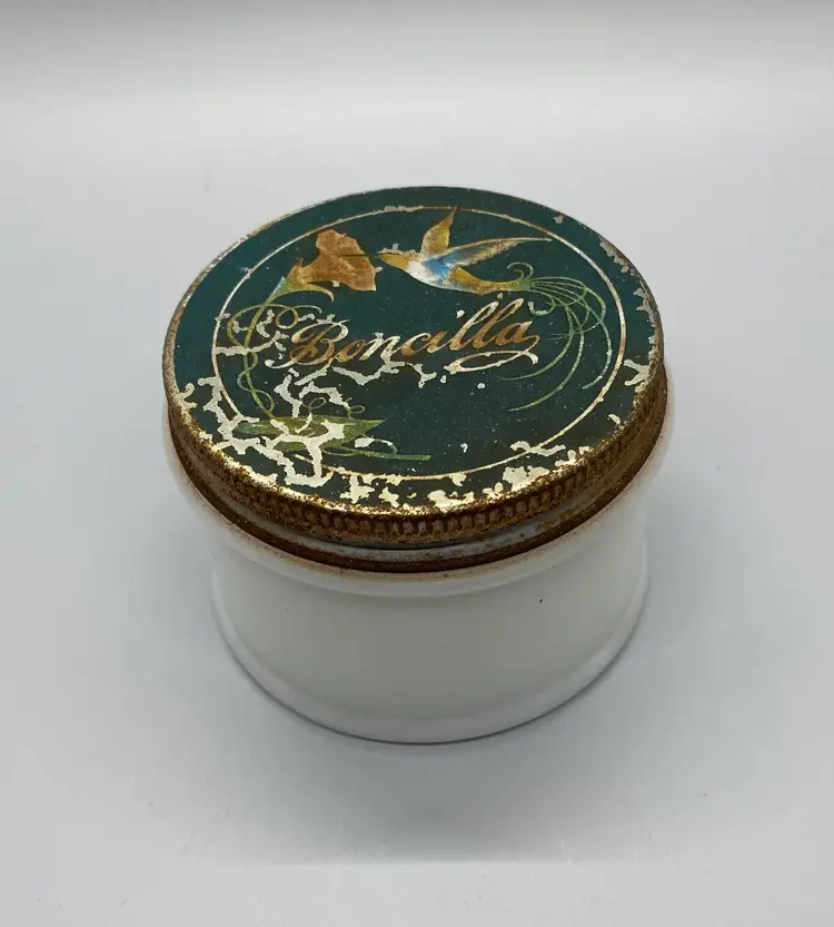 Boncilla brand white milk glass jar Hummingbird on metal lid lid shows wear and some mild rusting embossed Boncilla on bottom measures approx. 2 1/4" x 3"