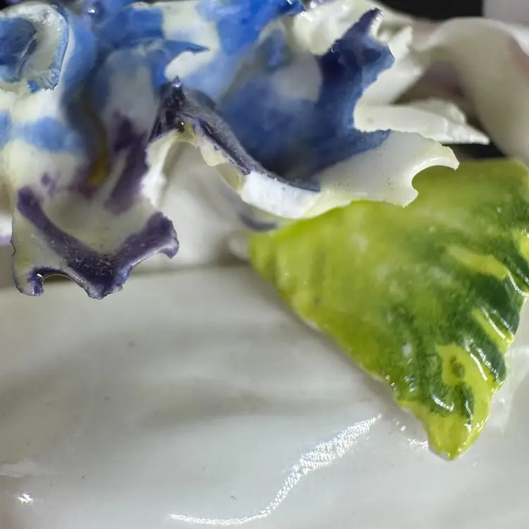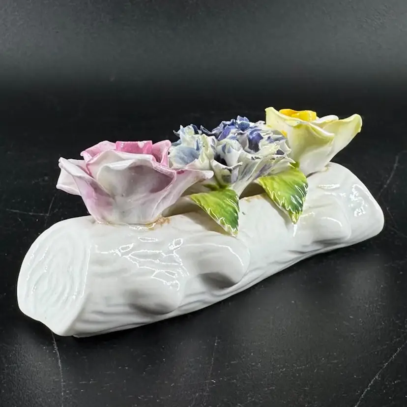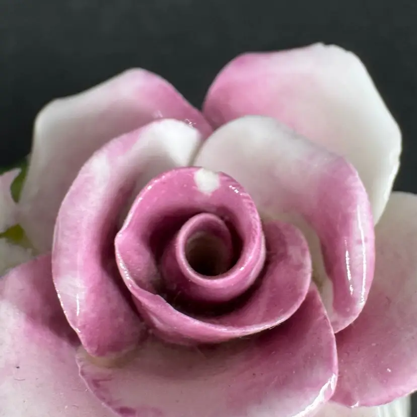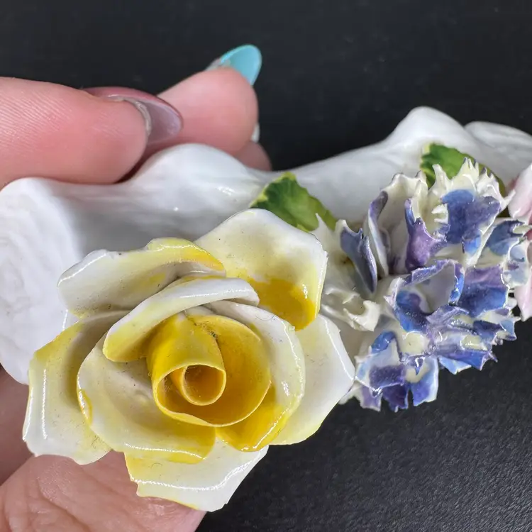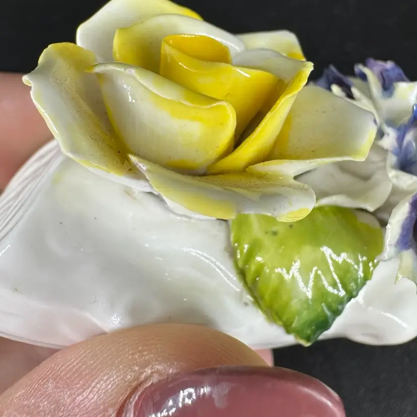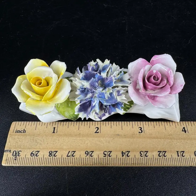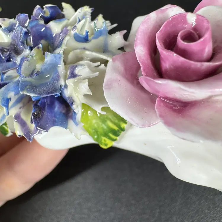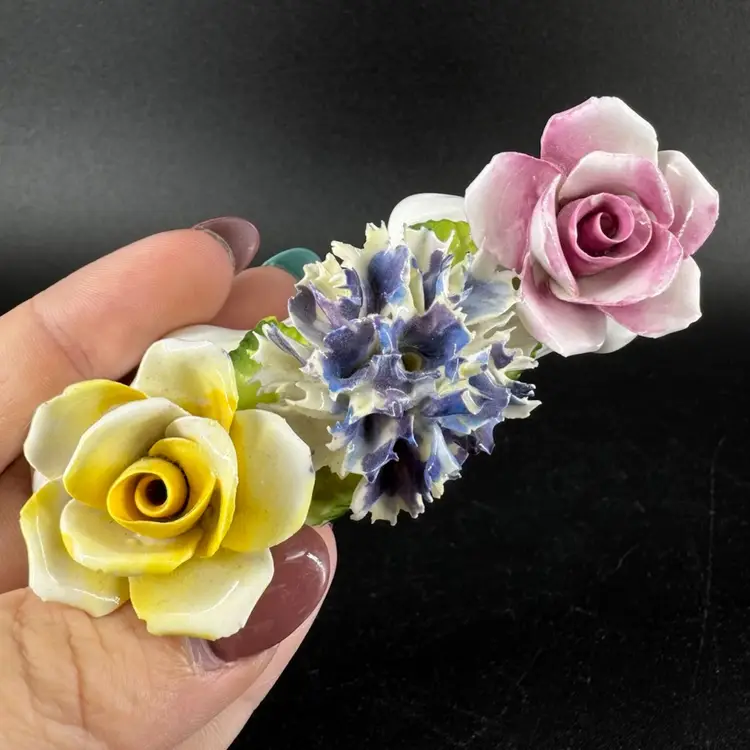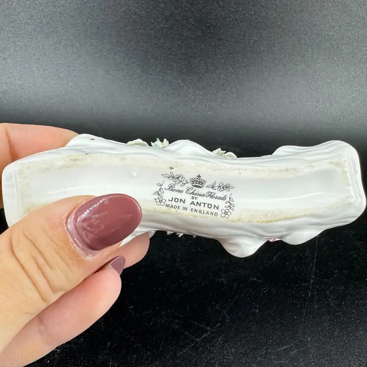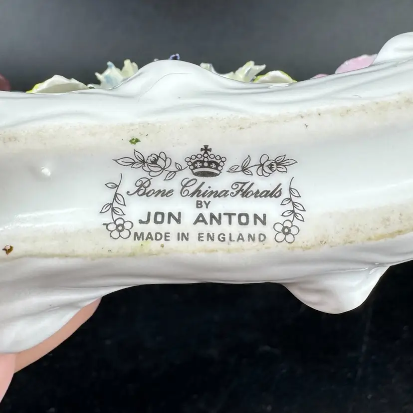This bone china florals by Jon Anton is approximately 4” in length. There is a few chips on the flowers the pink rose and the purple flower the peddles have the chip which can be viewed in the photos. It is marked “Bone China Florals By Jon Anton Made In England”.