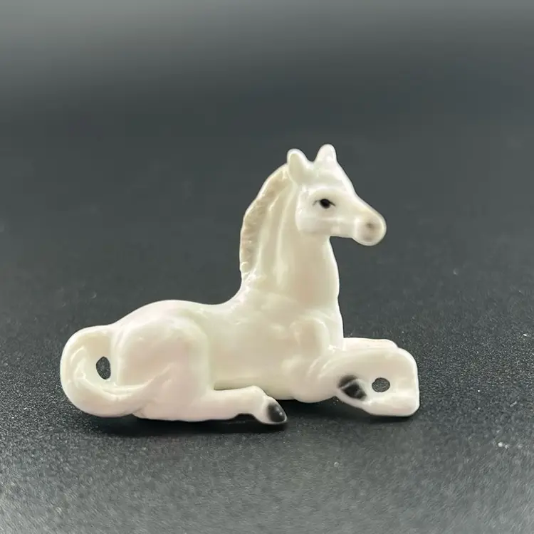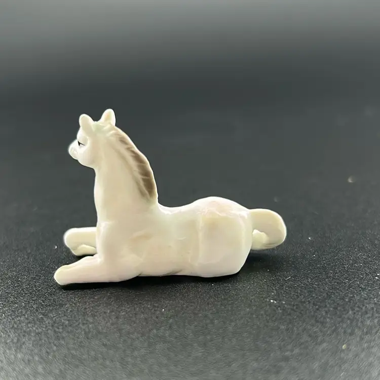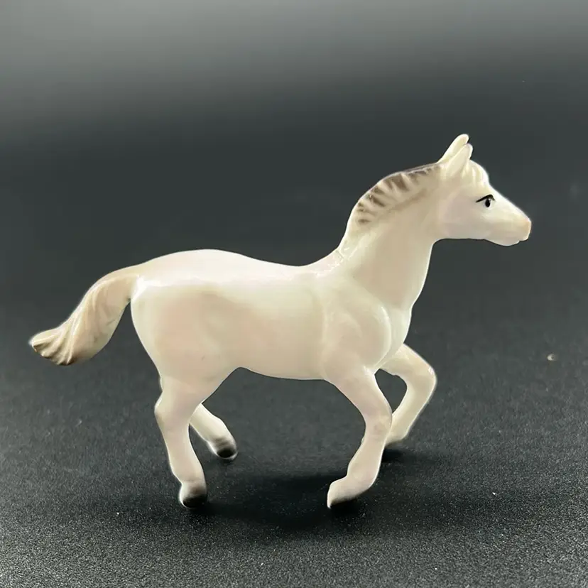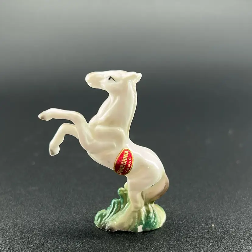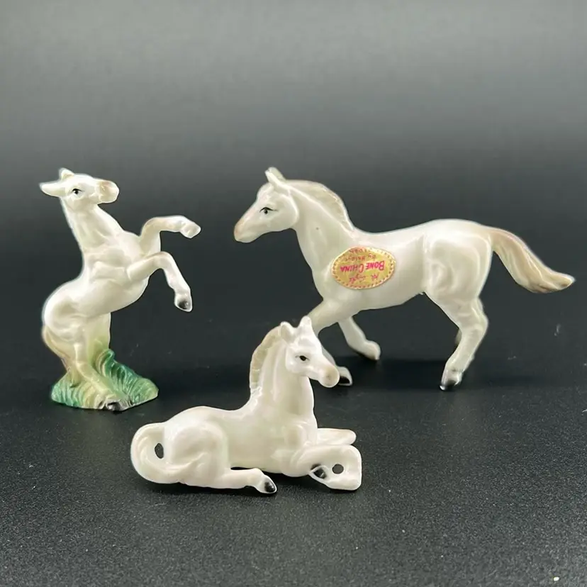 These are a set of three bone china miniature horses made in Japan. They have excellent details. There are no chips or cracks. The tallest one stands about 2 inches tall and about 2 3/4 inches wide.