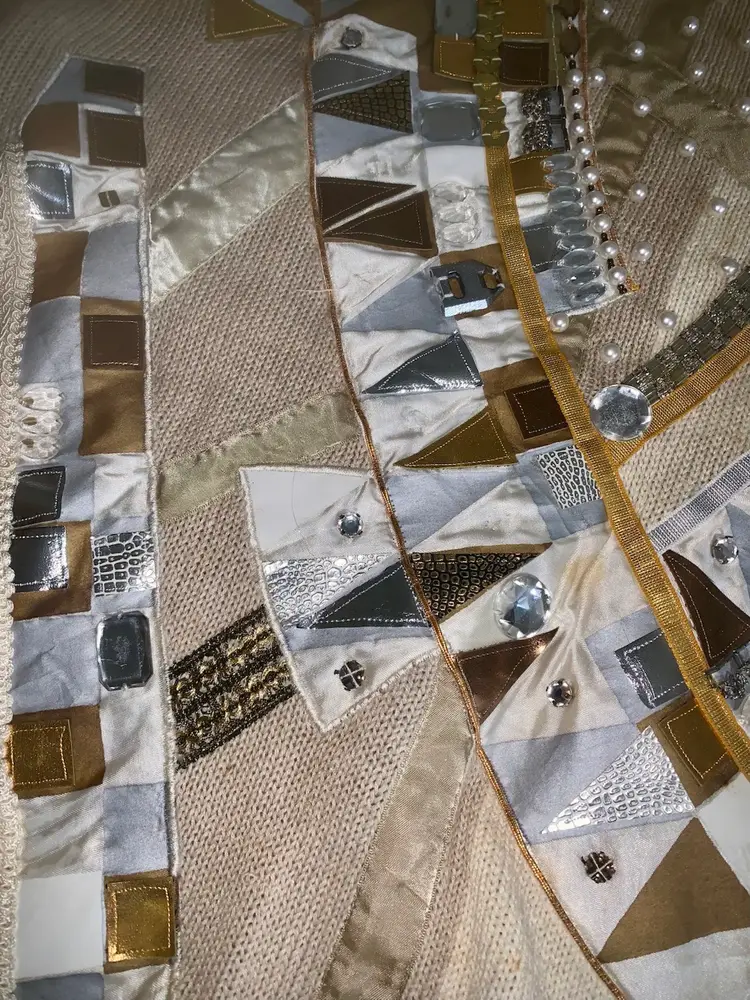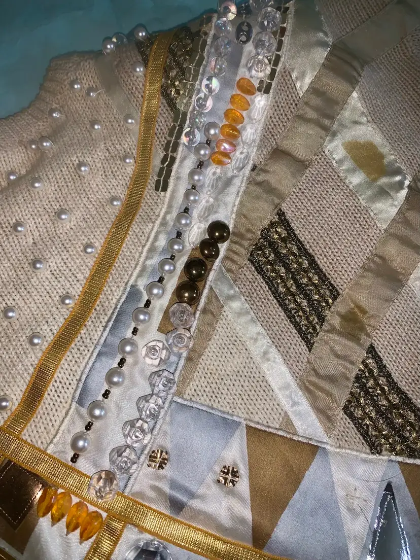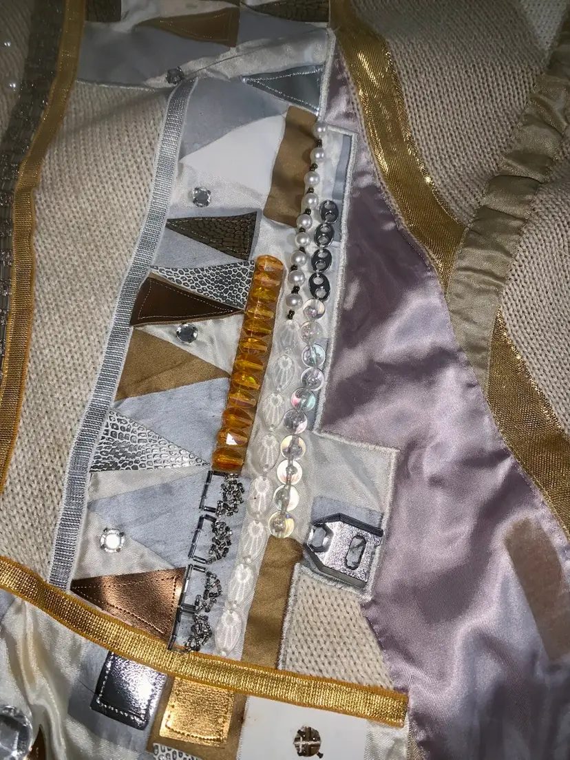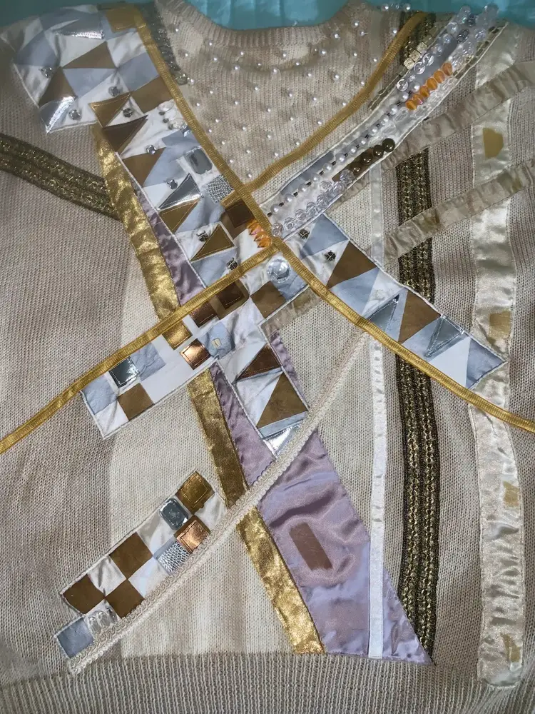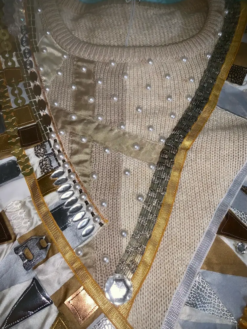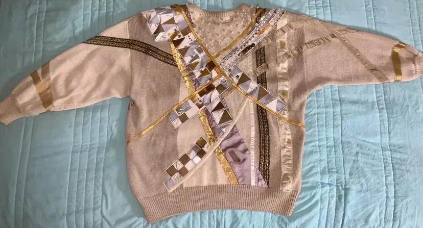 90's Throwback! Bonnie Boerer: Women's Designer Sweater w/bejeweled stones. Mixed materials. Shoulder pads sewn in. Like New. Smoke free. Measurements taken across flat garment 26.25" L, 22" W, 18" Sleeves