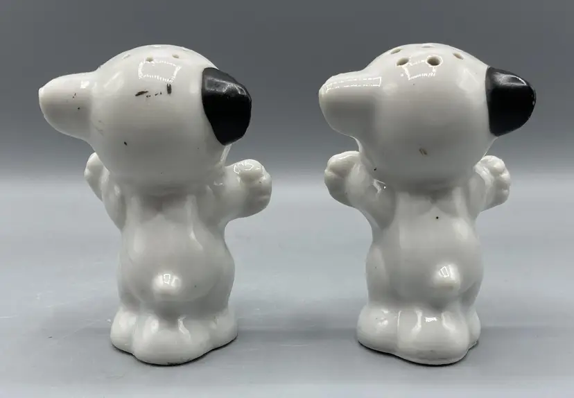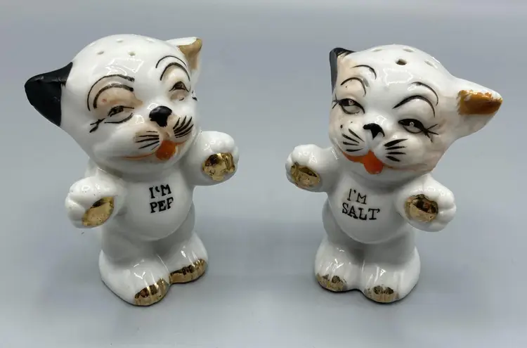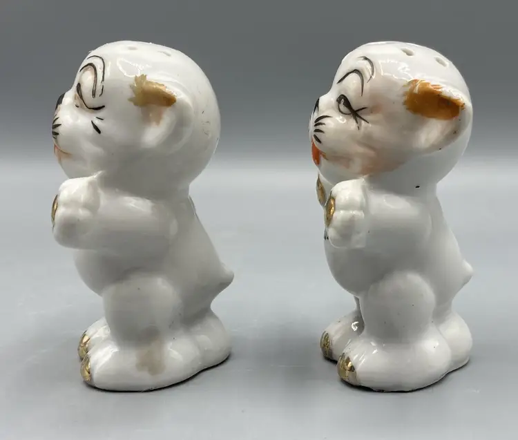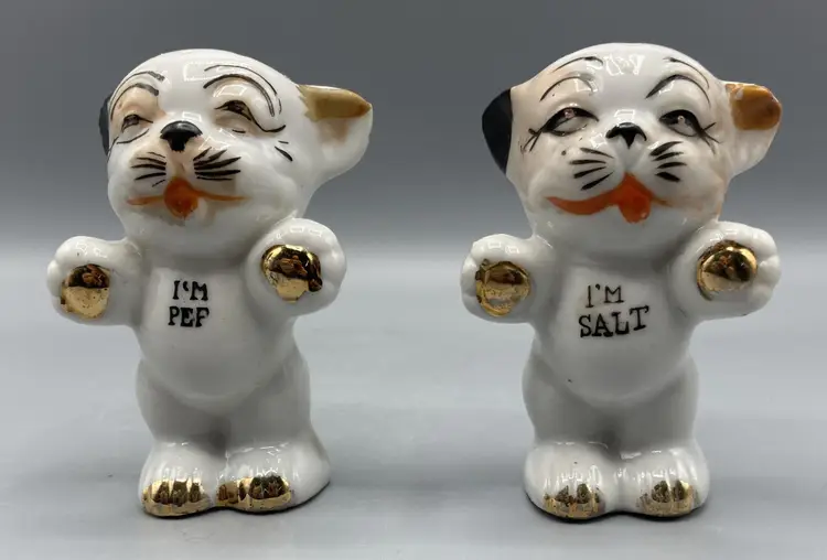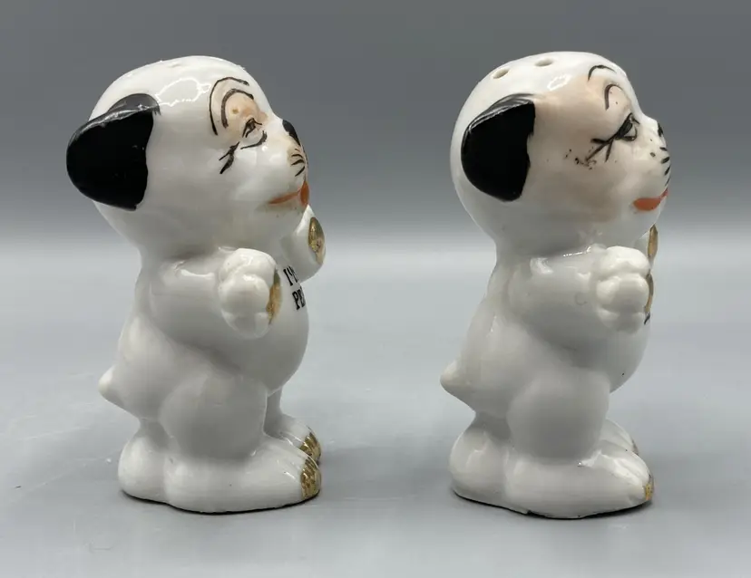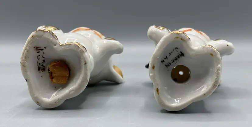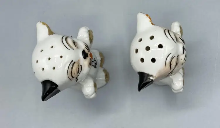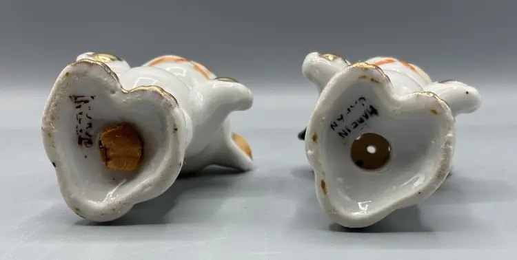 These shakers are in good used condition. They have some minimal paint loss. The salt shaker is missing the original cork. They each measure approximately 3" tall and 1 1/2" wide.