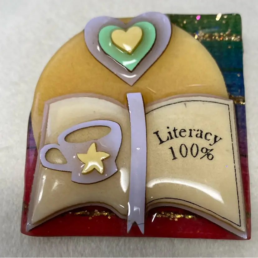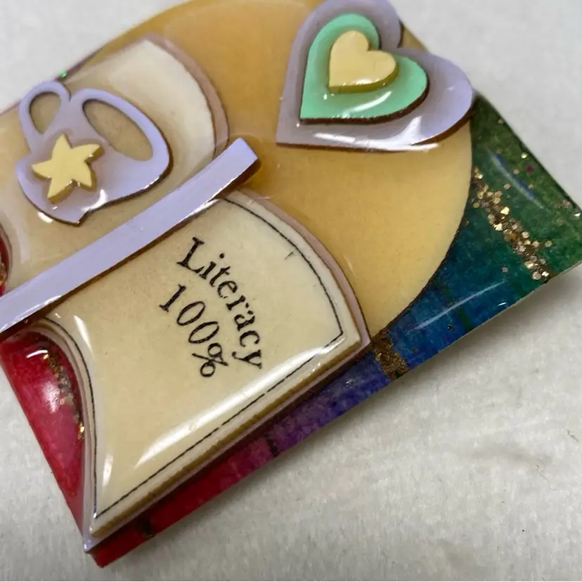 BOOK PINS By LUCINDA - This Dimensional Brooch / Pin Features An Open Book With Bookmark Promoting 100% Literacy ~ Also Has A Coffee Cup And Hearts