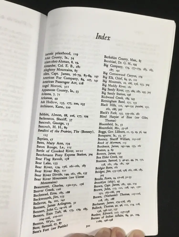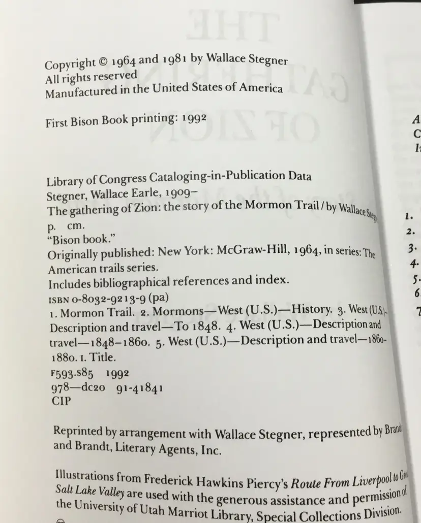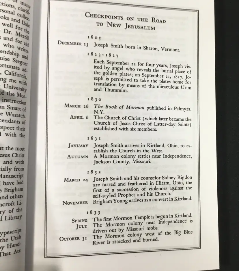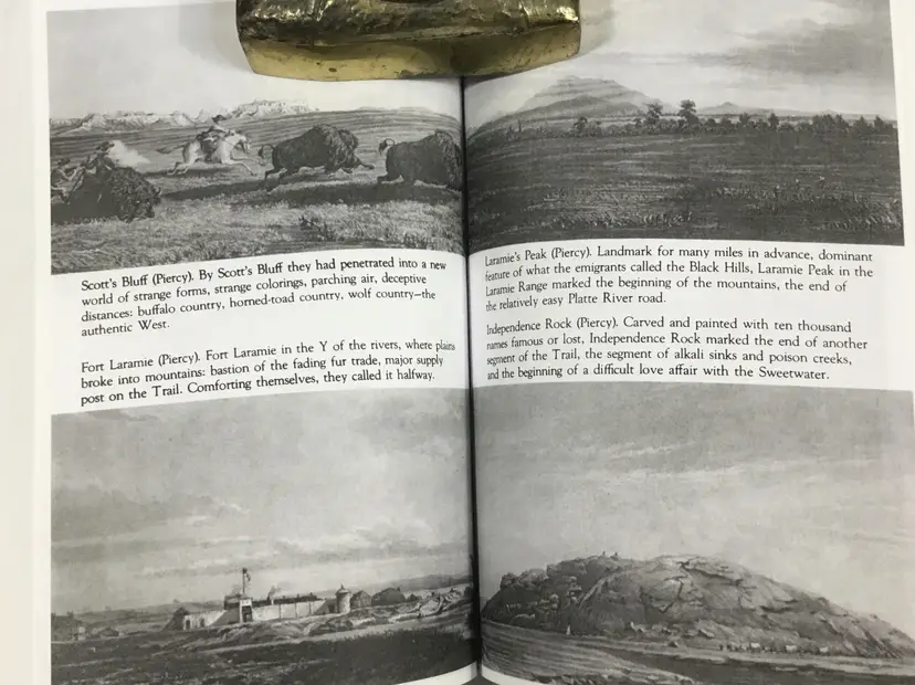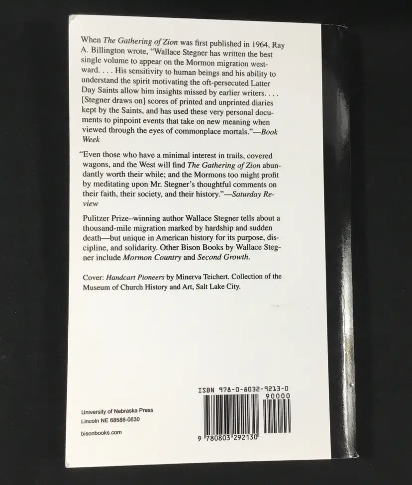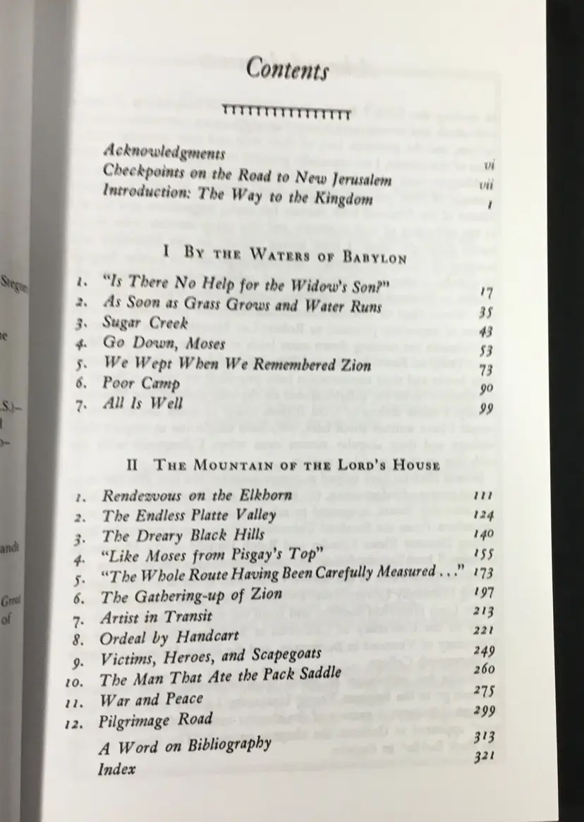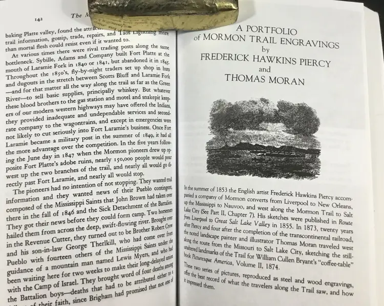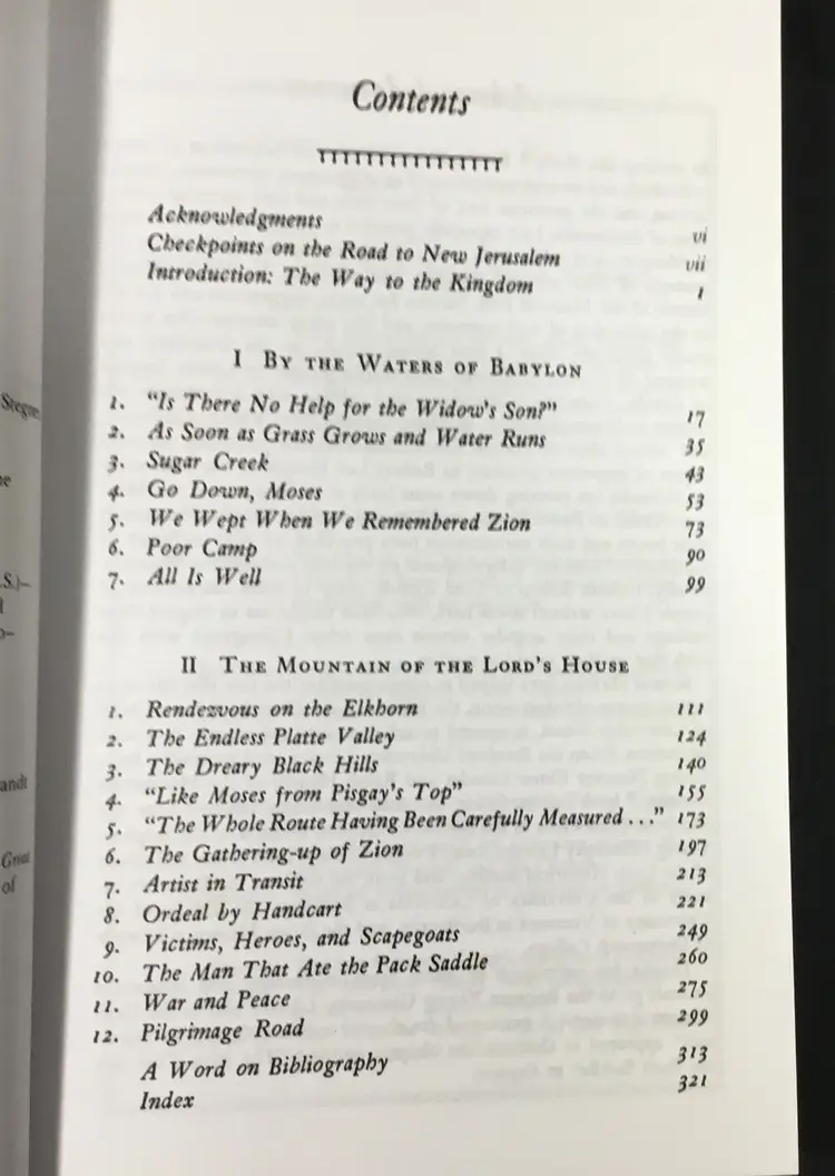 332 pages, soft cover book of the History of the Mormon Trail in the 1800s, from New England to Utah. Book includes a list of "Checkpoints" on the road to New Jerusalem, an introduction, a 16 page portfolio of etchings (scenes along the way) by Frederick Hawkins and Thomas Moran, a 7 page bibliography and an 11 page index. Very good condition, tiny wear on two corners (See all photos)