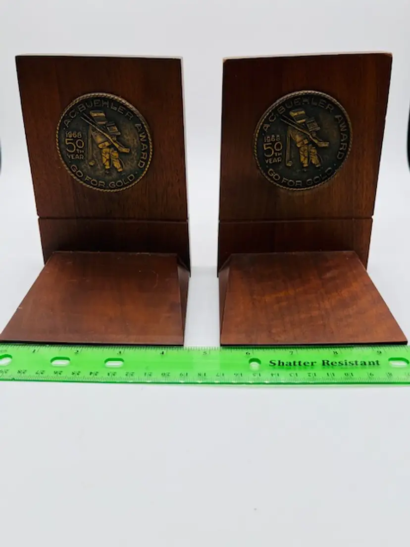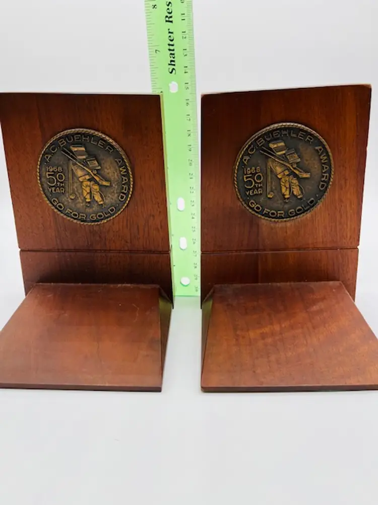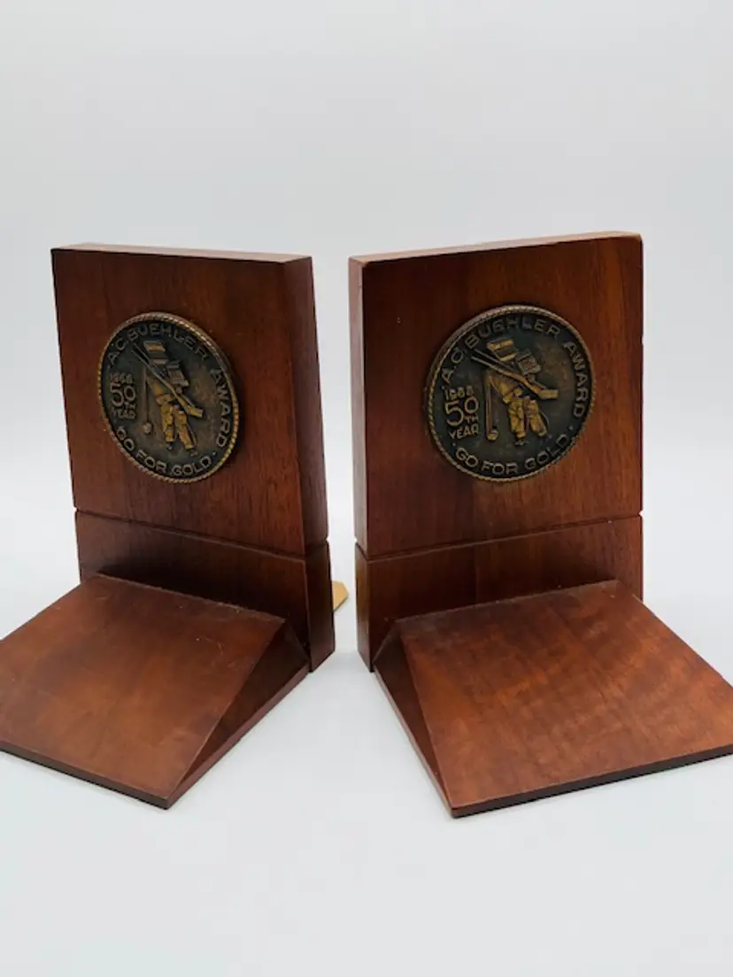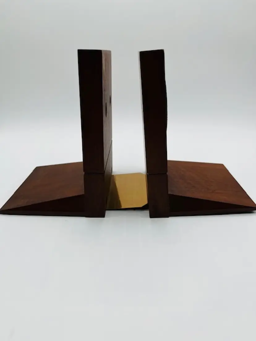 These vintage solid walnut bookends from 1968 feature a unique medallion pattern, adding a touch of Mid Century decor to any room. The Brand CENTURY adds a sense of nostalgia to the piece, making it a desirable collectible for those who appreciate retro design. Crafted from wood, these bookends are sturdy and timeless, perfect for display in a home or office setting.