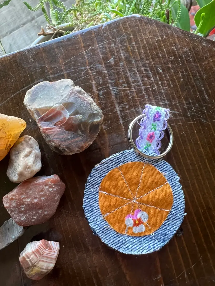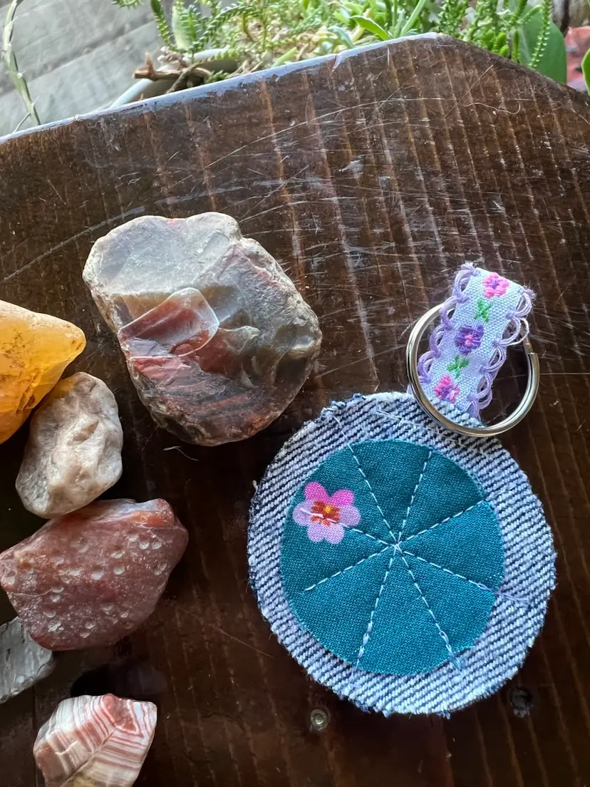 Upcycled denim and scrap fabric made into cute key chain. All profits will be donated to local mutual aid through prismmpls.org. Key chains have been donated by my dear friend Susie (@patchworksusannas IG). Rocks are not included with purchase 😉