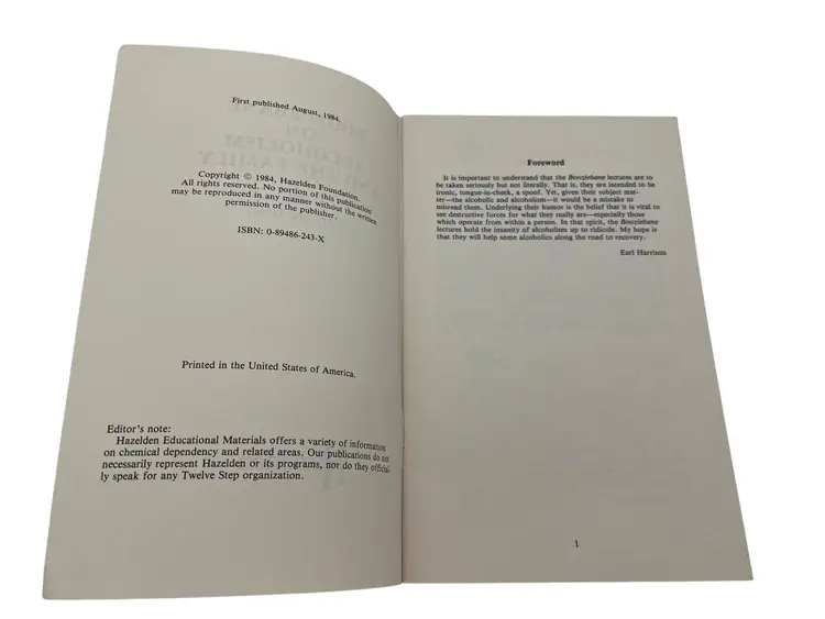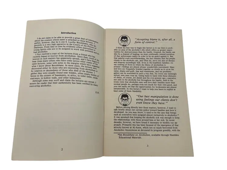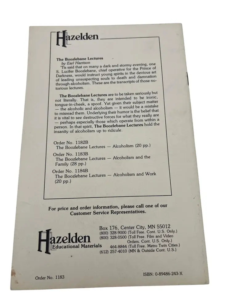 This 1984 booklet offers a humorous take on alcoholism within a family context, drawing inspiration from C.S. Lewis' The Screwtape Letters. According to the brochure the contents are to be taken seriously but not literally. They are intended to be ironic, tongue-in-cheek, and a spoof. Underlying the humor though is the belief that it is vital to see destructive forces for what they really are. The Boozlebane Lectures hold the insanity of alcoholism up to ridicule.