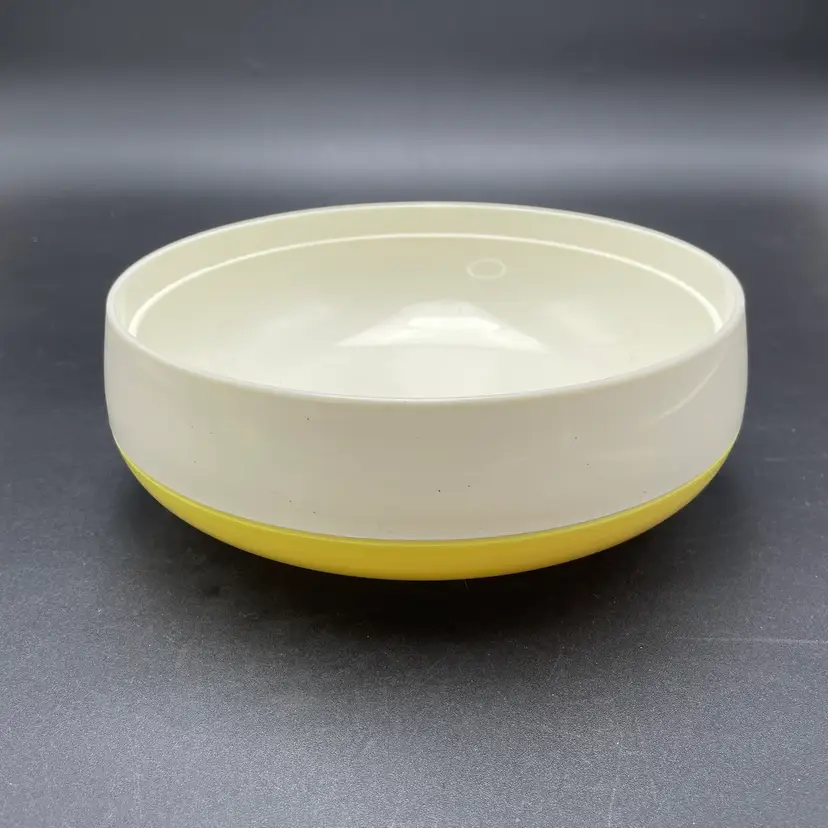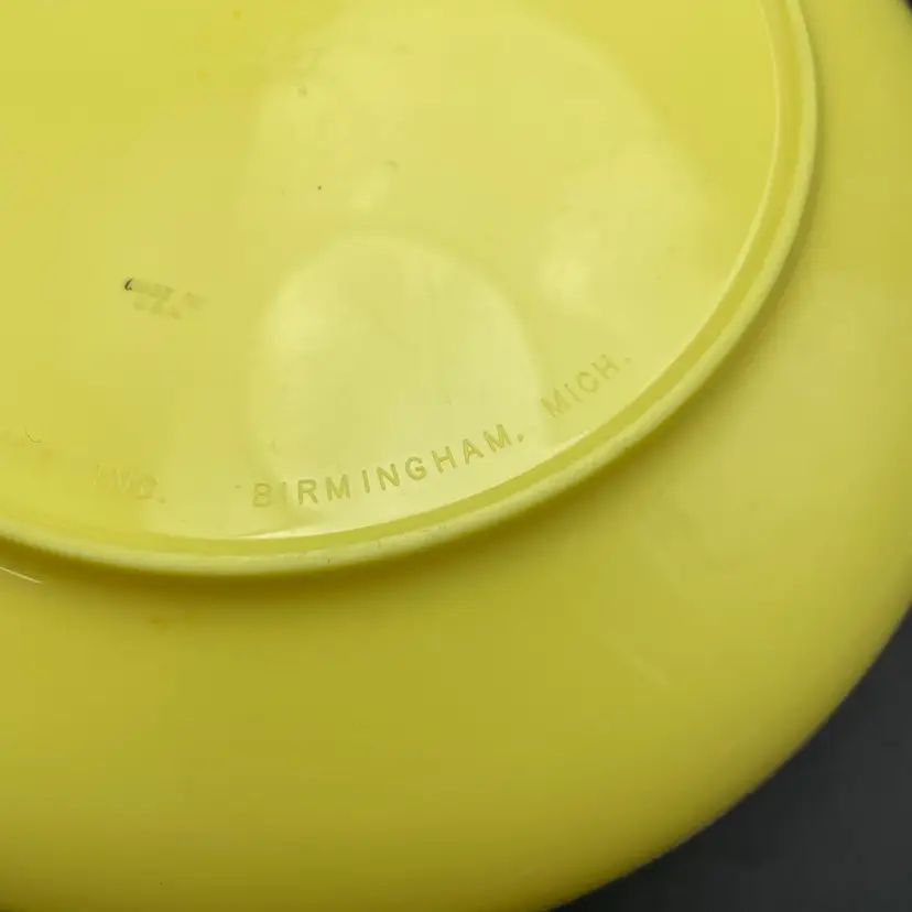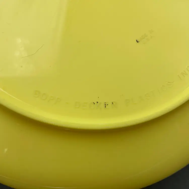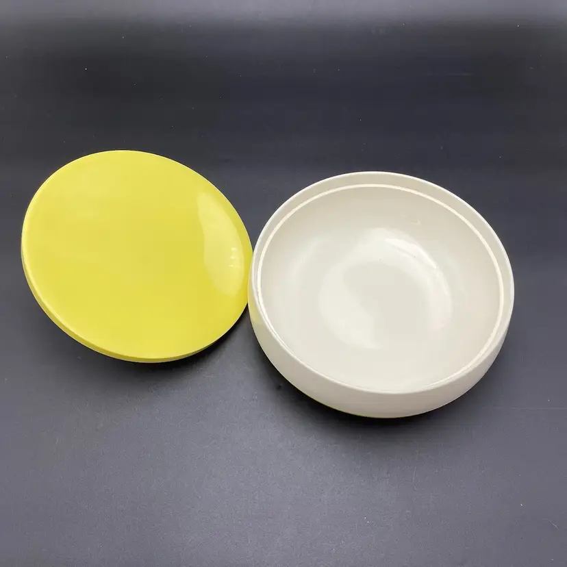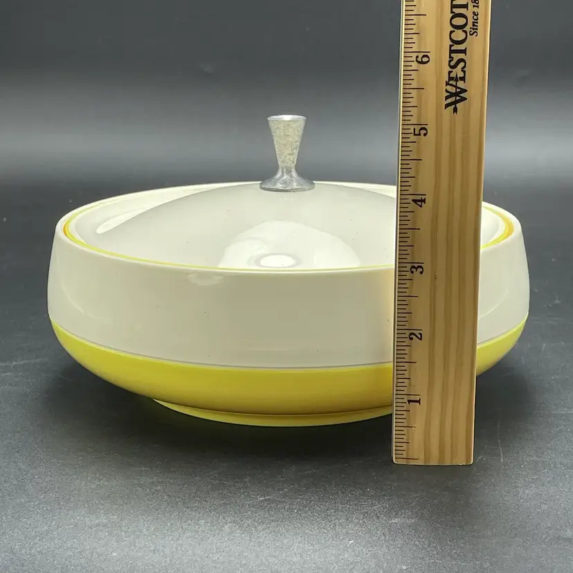 This is a mid century Bopp-Decker Plastics Inc Vacron covered serving dish in atomic yellow. Made in the USA. Measures approximately 5.25" tall including the lid x 8" across. No major flaws.