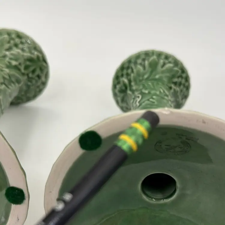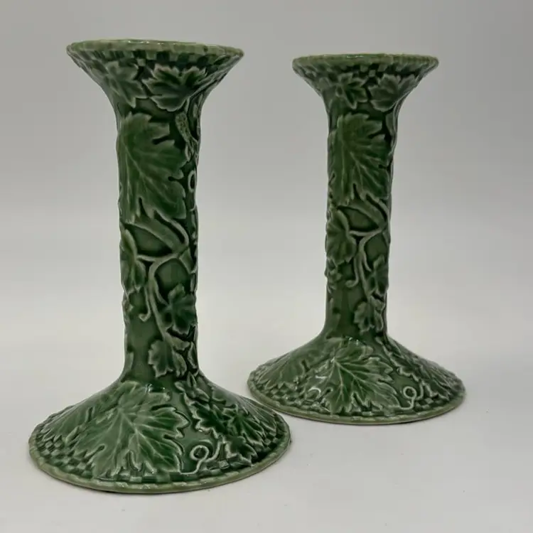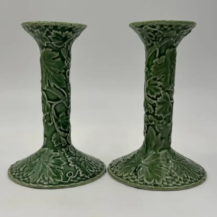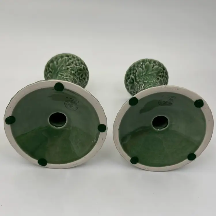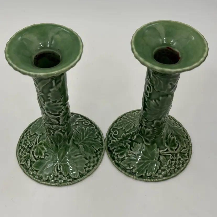 6” T 4”W has a flee bite on very bottom of one candel holder has some crazing from age. Does not take away from the beauty of these two candle holders.