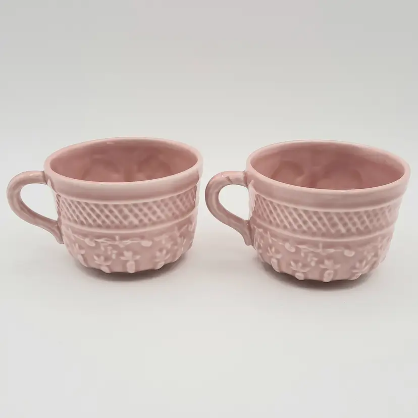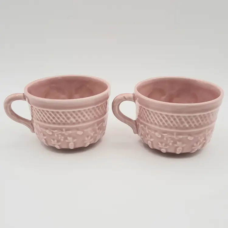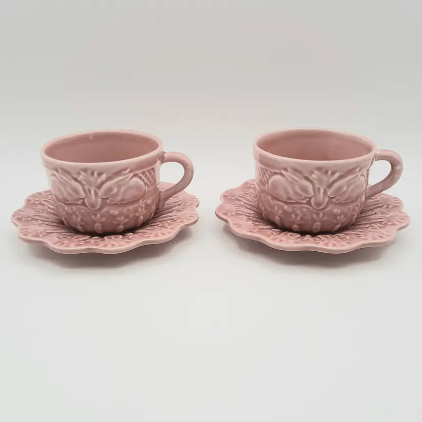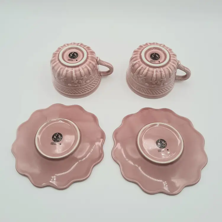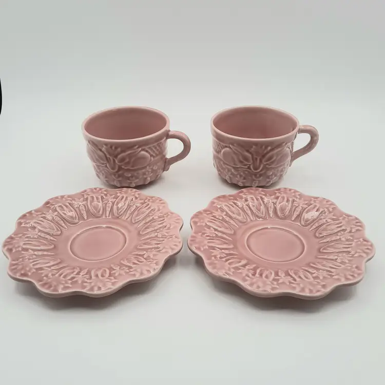Darling BP cups and saucers are in great condition with some crazing on the saucers, cups are 2 1/2"H x 3 1/2"W at rim, saucers are 5 3/4" I also have a listing of (2) 4 pc place settings in this pattern that are just a bit darker pink