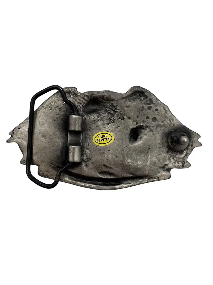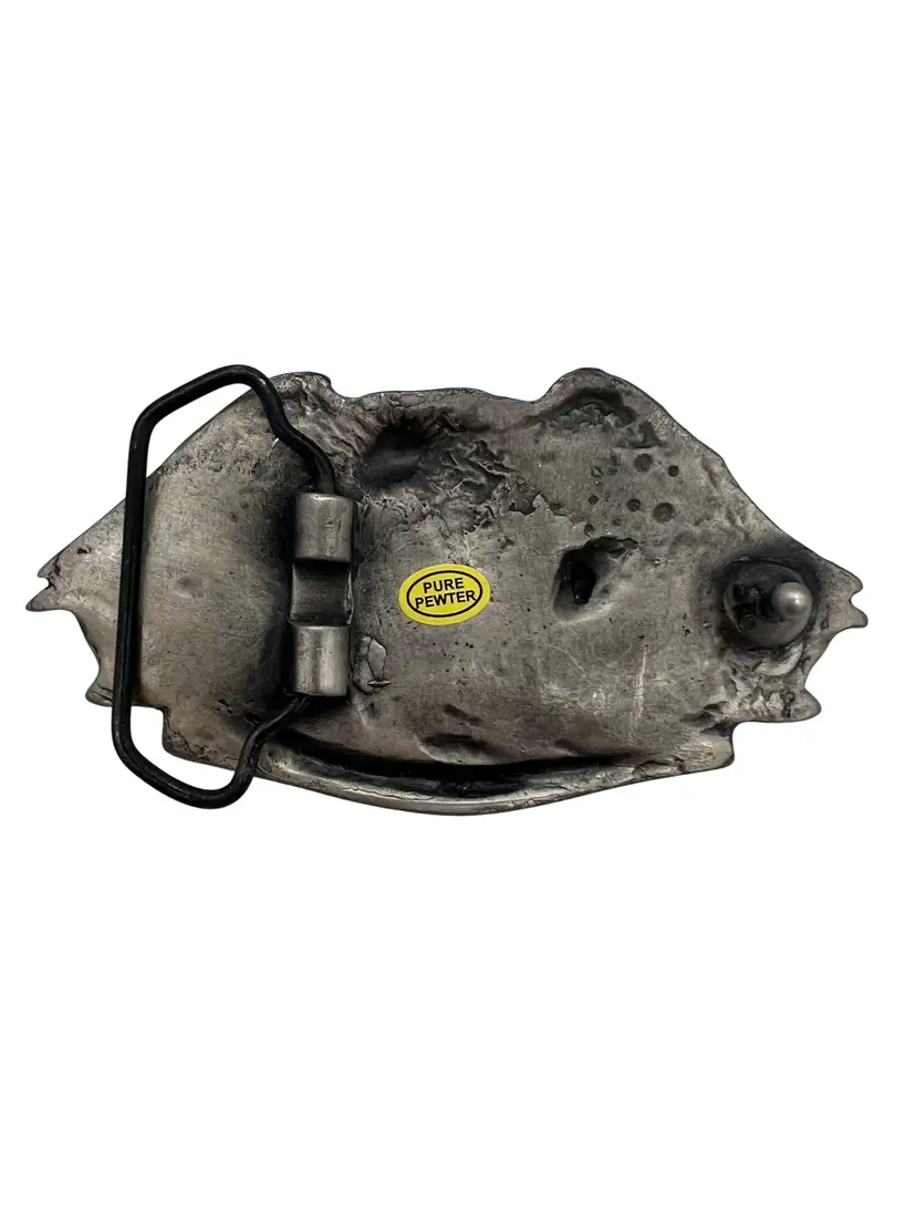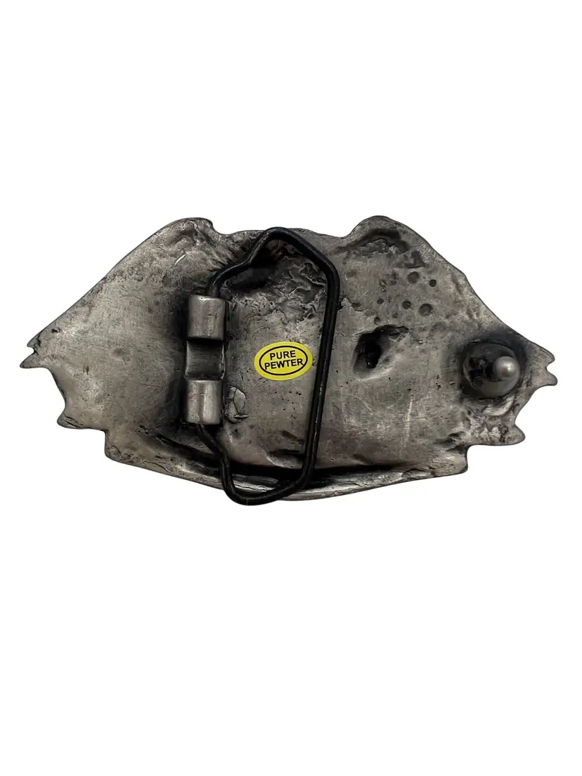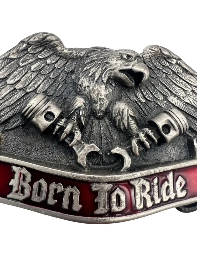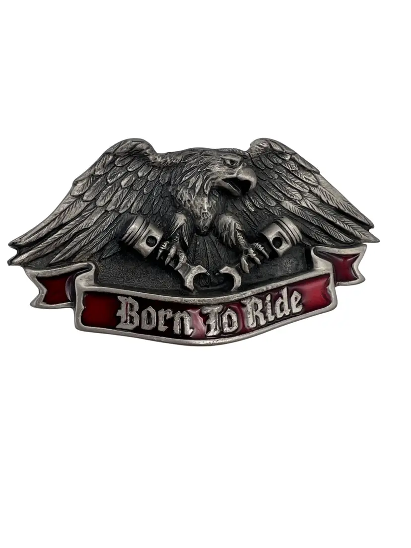 Crafted from pewter, this 4" x 2" heavy-duty belt buckle features a detailed eagle gripping pistons with "Born To Ride" on a vibrant red banner.