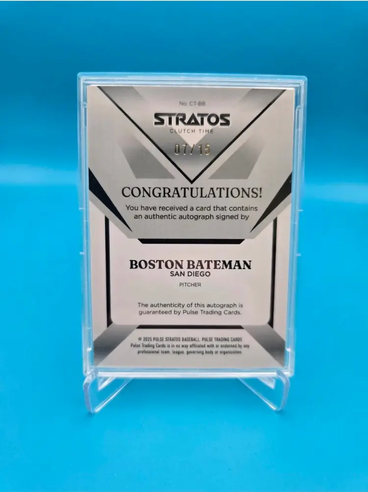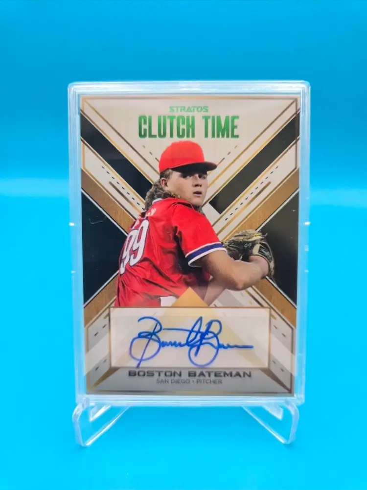Boston Bateman, former Padres and current Orioles prospect. Green foil auto card numbered to /15. NM or better and fully encased. Stacked shipping applies.