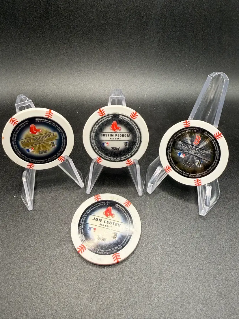 4 nice heavyweight poker chips from Topps Chipz release in 2014. Boston redsox Ortiz, Buckholz, Peoria, Lester. Ortiz and Buckholz are gold or sparkle parallels.