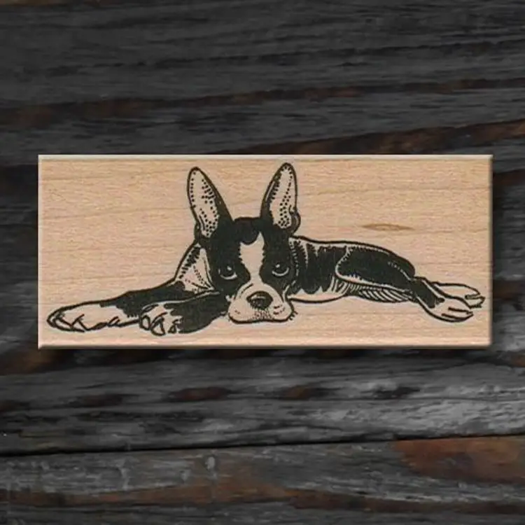 Boston Terrier Laying Down Dog Pet Rubber Stamp Size: 1-1/2 x 3-1/4 inches Wood Mounted Red Rubber Handmade