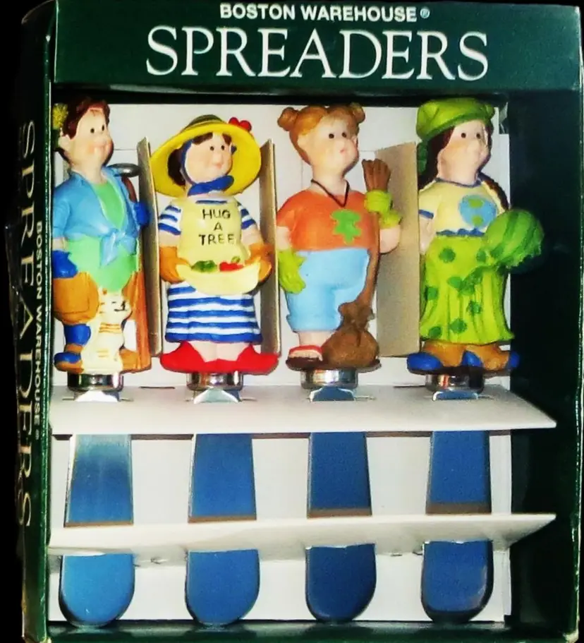 From Boston Warehouse, set of 4 fun spreaders in box, never opened or used. Has garden or nature theme to them.