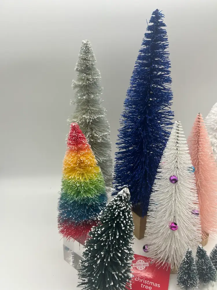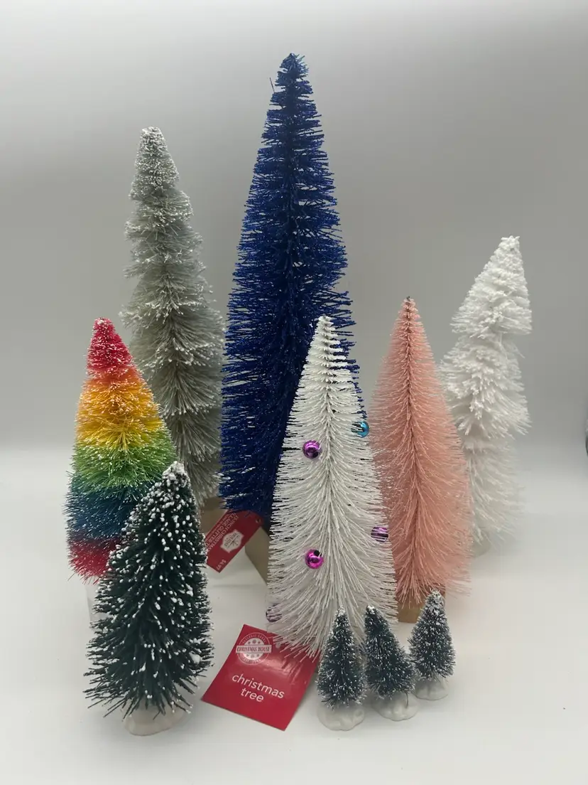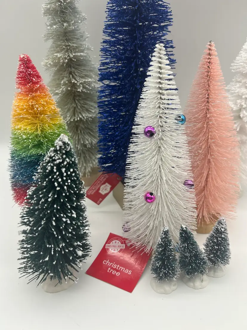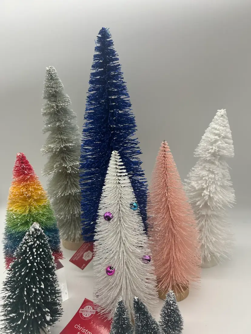 Lot of 10 bottle brush trees measuring from 13” tall to 2 1/2” tall. These are higher end trees with wooden and plastic bases. Some are brand new with tags on priced from $5 and up.