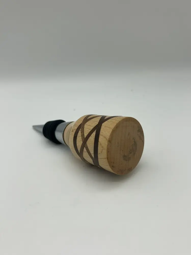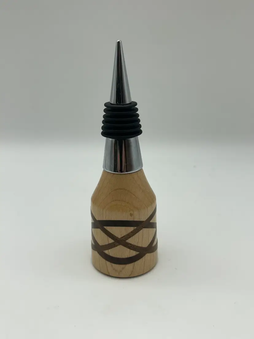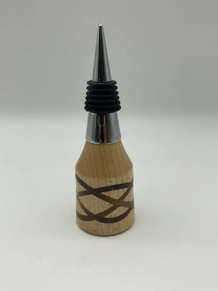 I believe the wood on the bottle stopper is maple with walnut inlay creating the Celtic like design. The stopper is approximately 5 1/4” tall and 1 3/4” wide.
