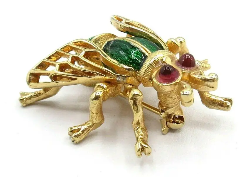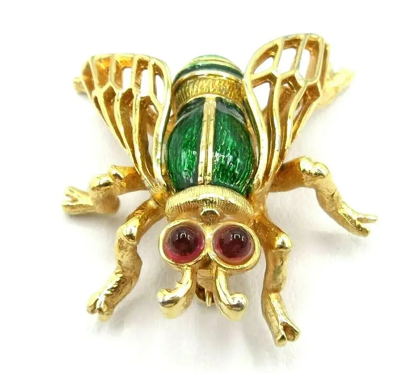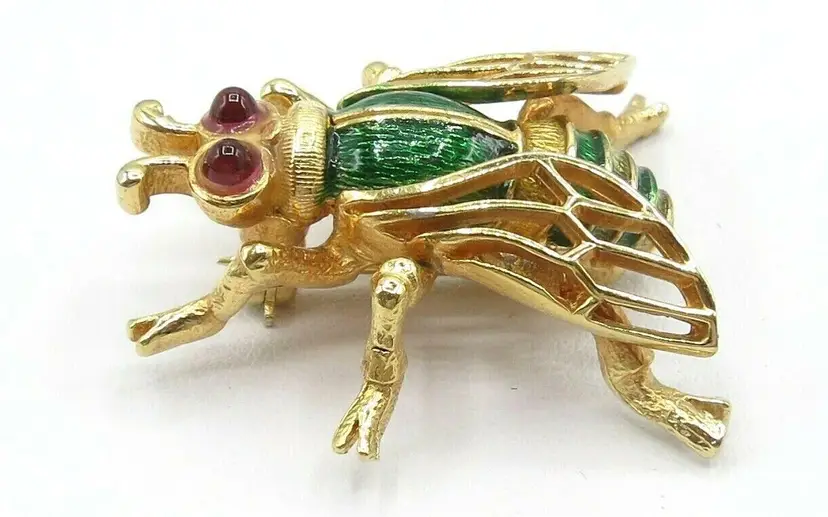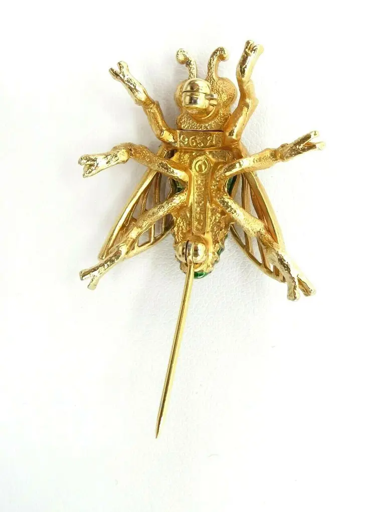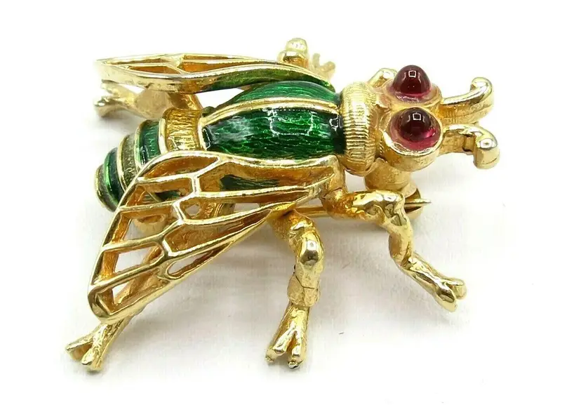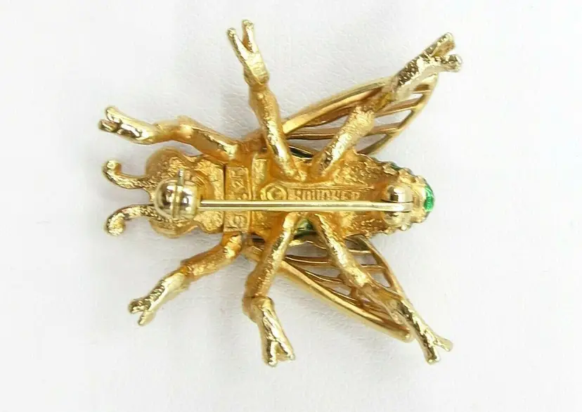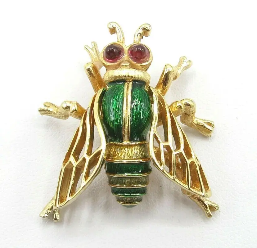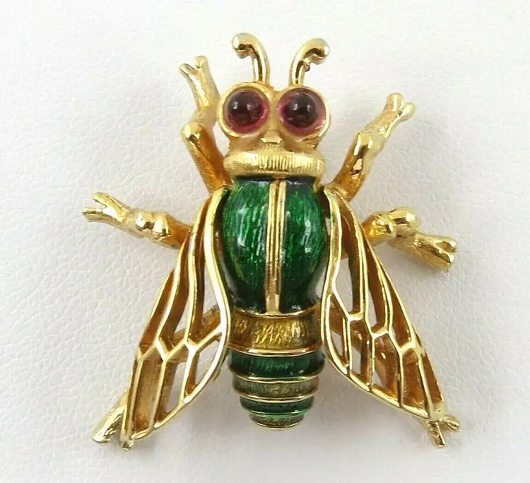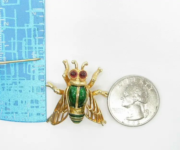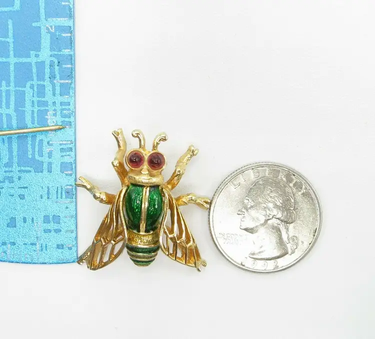Boucher Gold Tone Green Enamel Red Stone Eye Insect Bug Brooch Pin Signed