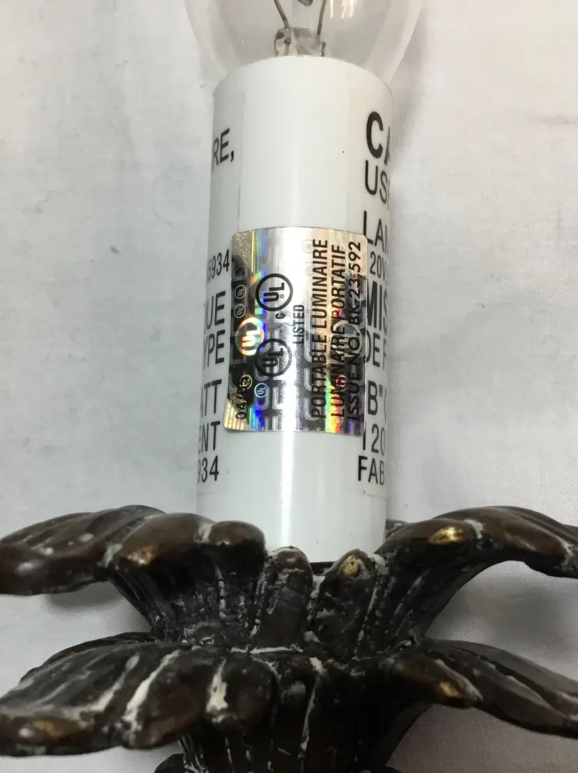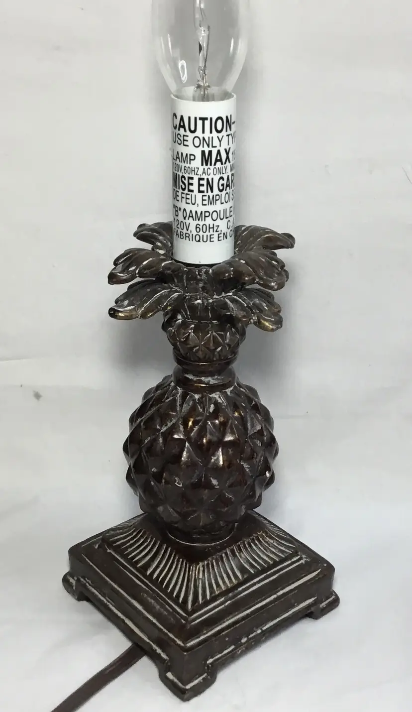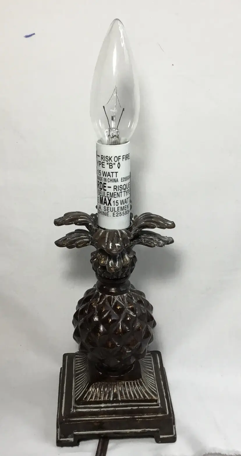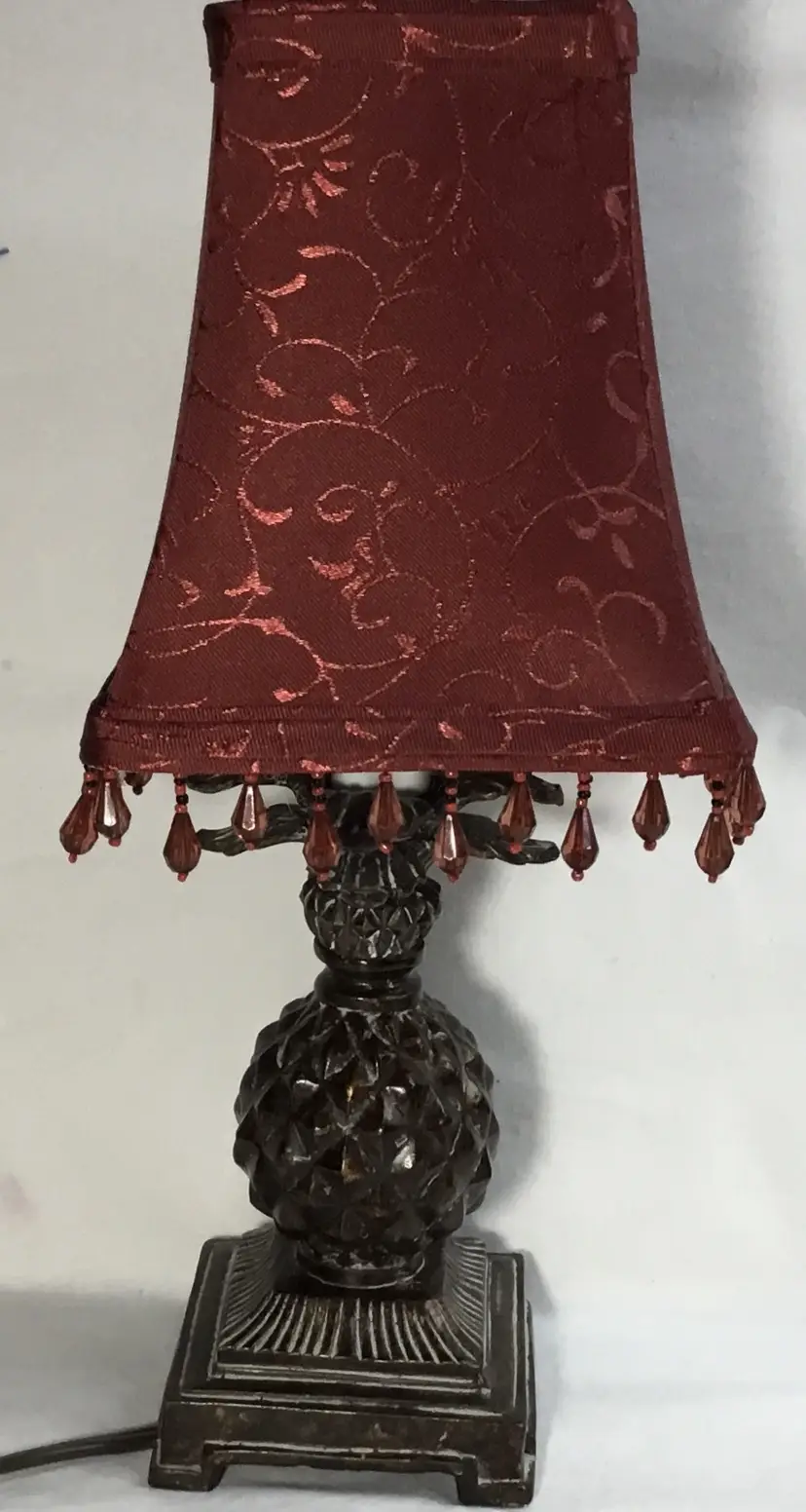 12 inches tall with 5.5 inch, fabric lamp shade. Lamp stand 10 inches from base to tip of bulb, and is all metal with pineapple and leaves above a 3 inch square base. Metal has faux bronze finish, with faux antiqued patina. Above metal lamp stand is a candle-like stem with tapered light bulb -- 15 watts maximum for safety. Stem of "candle" has a sticker which says, Caution: Risk of fire, use only type "B" bulb. Lamp max 15 watt, 120V, 60 Hz, AC only. Made in China." The stem also has an Underwriters Laboratory hologram sticker. Shade is dark red, square, tapered with damask fabric outside, with red, acrylic beads hanging from the bottom edge. Inside is a satiny, white fabric. Brown electric cord has inline rotary switch. Bottom of lamp has 2 stickers, one says July -- 2005 which I THINK is the UL inspection date. Other sticker says Made in China.