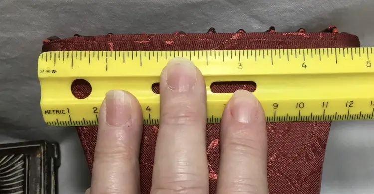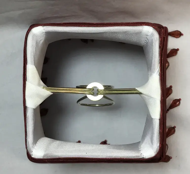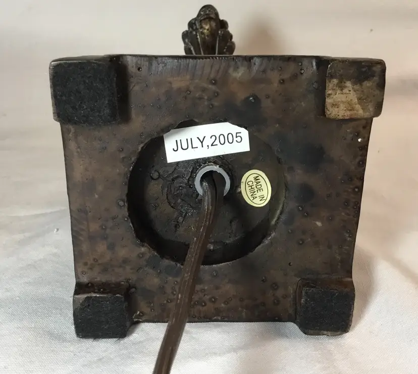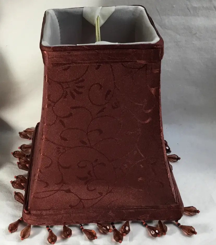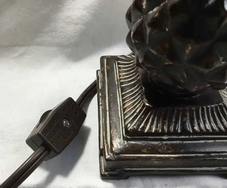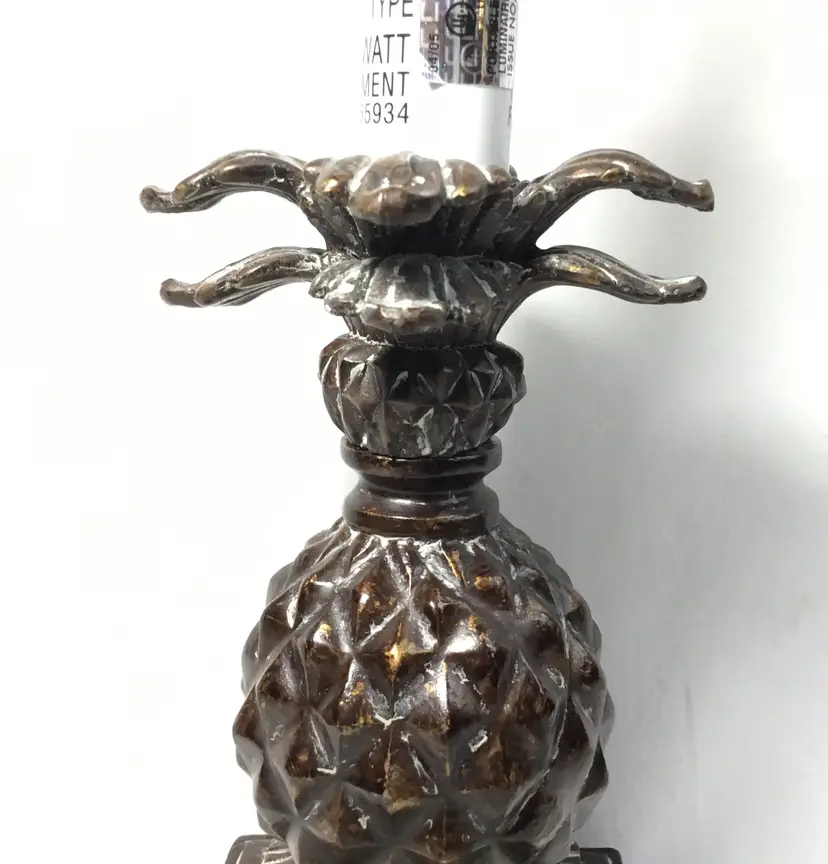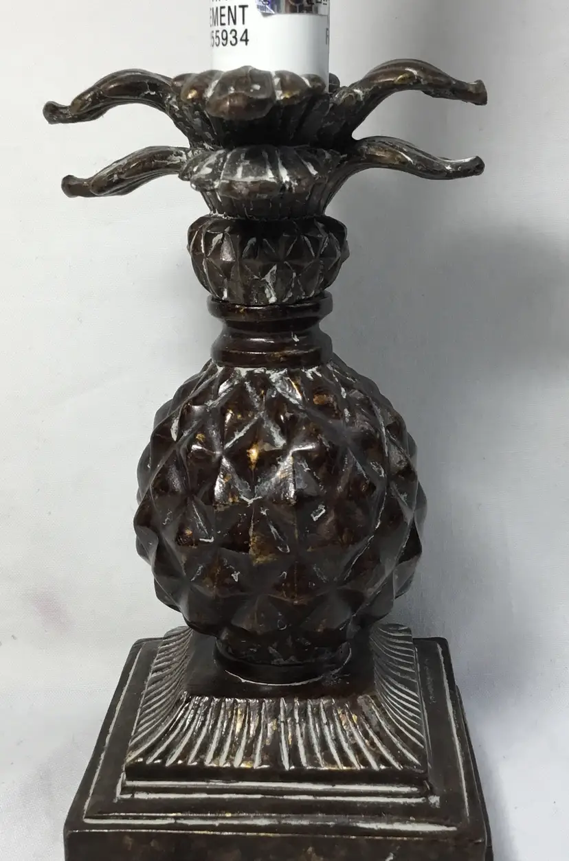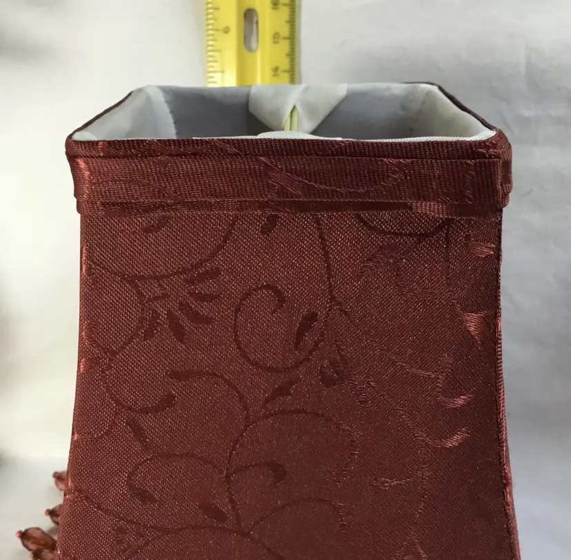 12 inches tall with 5.5 inch, fabric lamp shade. Lamp stand 10 inches from base to tip of bulb, and is all metal with pineapple and leaves above a 3 inch square base. Metal has faux bronze finish, with faux antiqued patina. Above metal lamp stand is a candle-like stem with tapered light bulb -- 15 watts maximum for safety. Stem of "candle" has a sticker which says, Caution: Risk of fire, use only type "B" bulb. Lamp max 15 watt, 120V, 60 Hz, AC only. Made in China." The stem also has an Underwriters Laboratory hologram sticker. Shade is dark red, square, tapered with damask fabric outside, with red, acrylic beads hanging from the bottom edge. Inside is a satiny, white fabric. Brown electric cord has inline rotary switch. Bottom of lamp has 2 stickers, one says July -- 2005 which I THINK is the UL inspection date. Other sticker says Made in China.