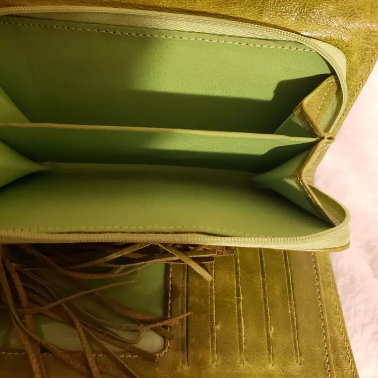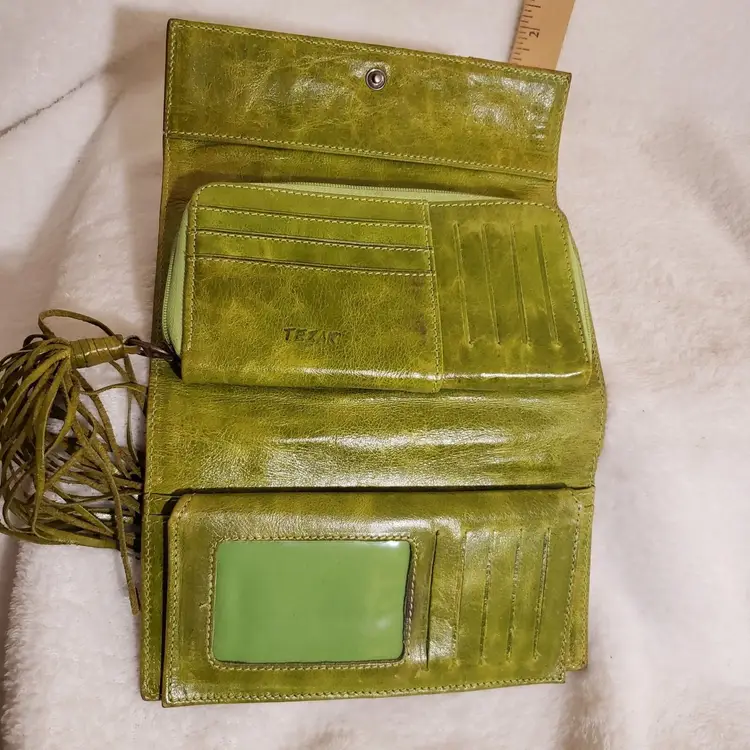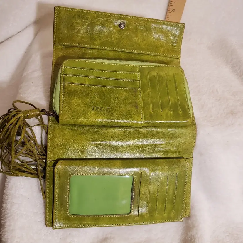 Features: Credit Card, Folding Department: Women Personalize: No Pattern: Solid Size: One Size Country/Region of Manufacture: Colombia Material: Leather Accents: Tasseled Brand: Tezari Style: Wristlet Color: Green Theme: Classic Type: Wallet