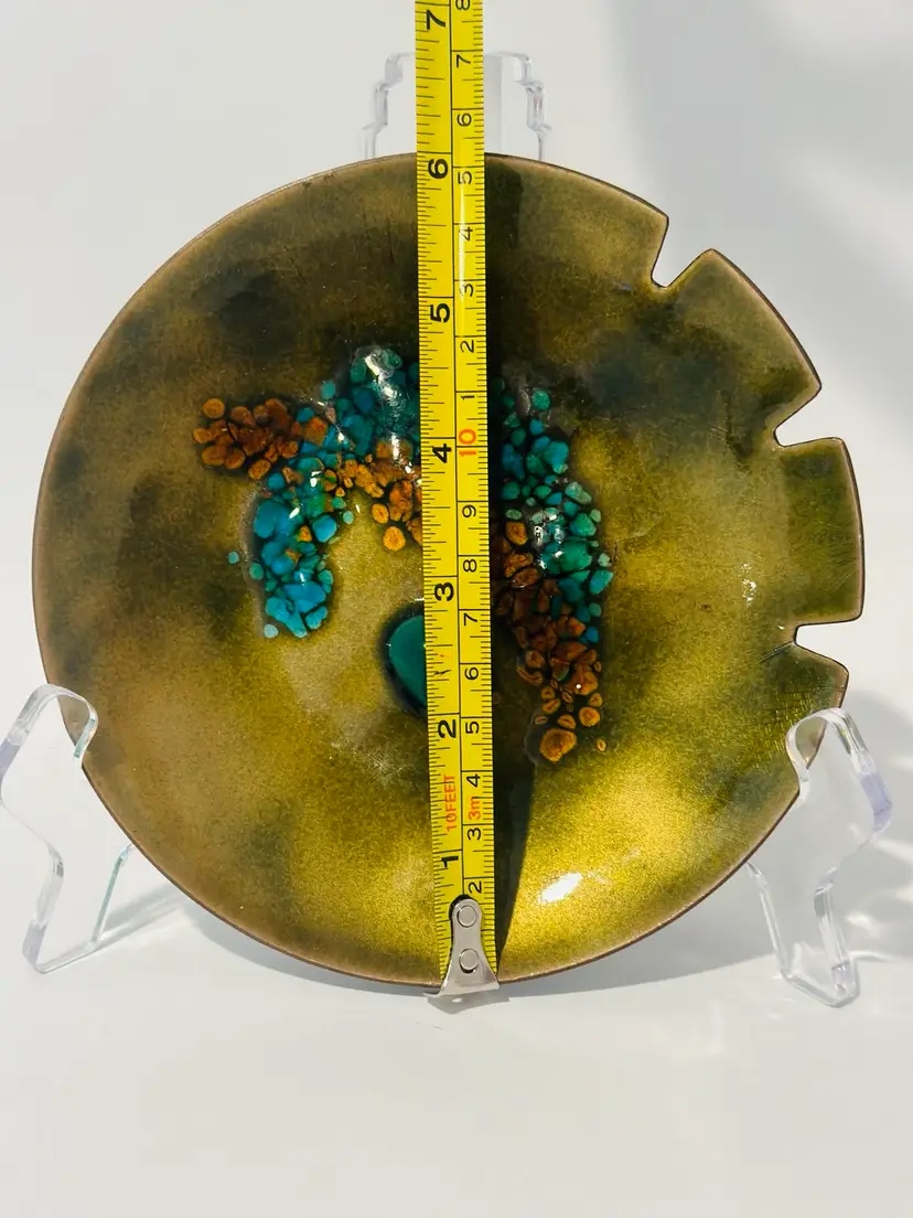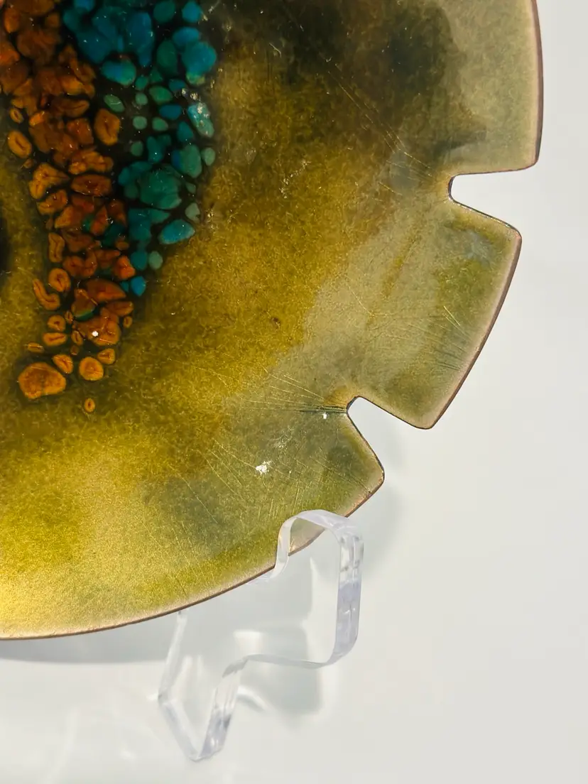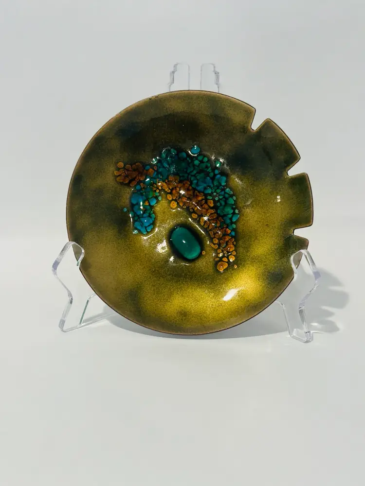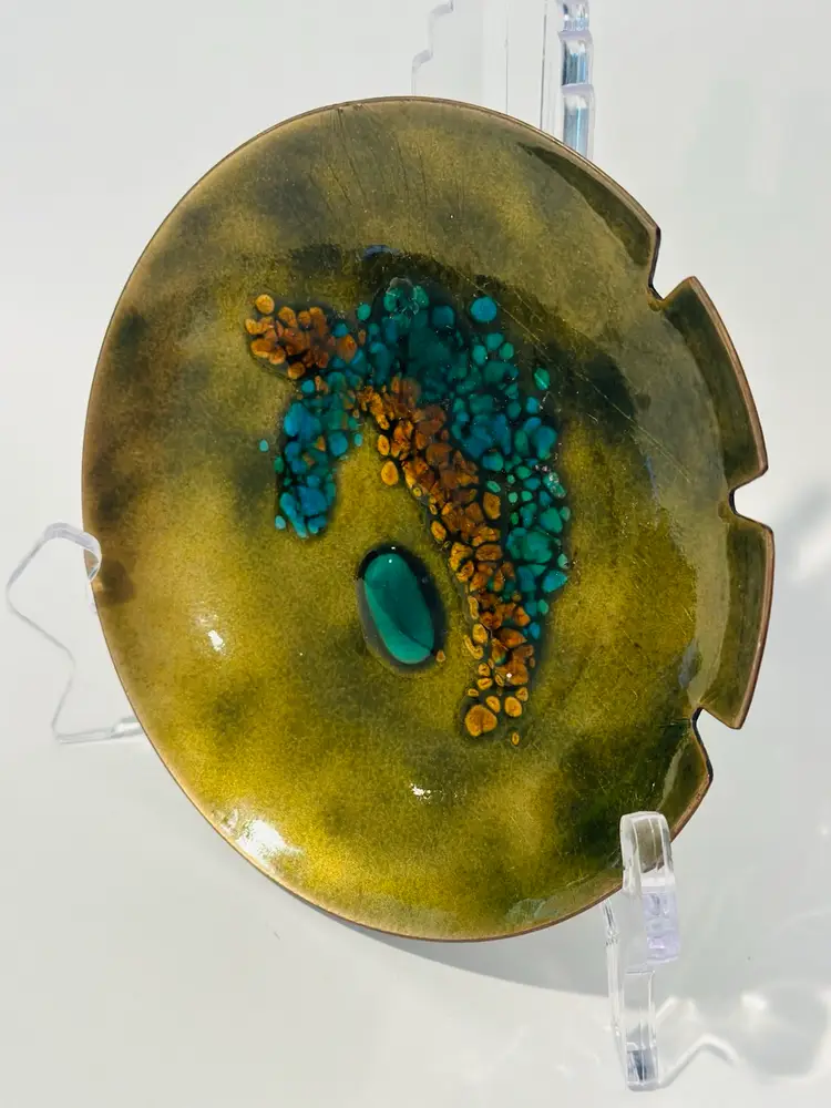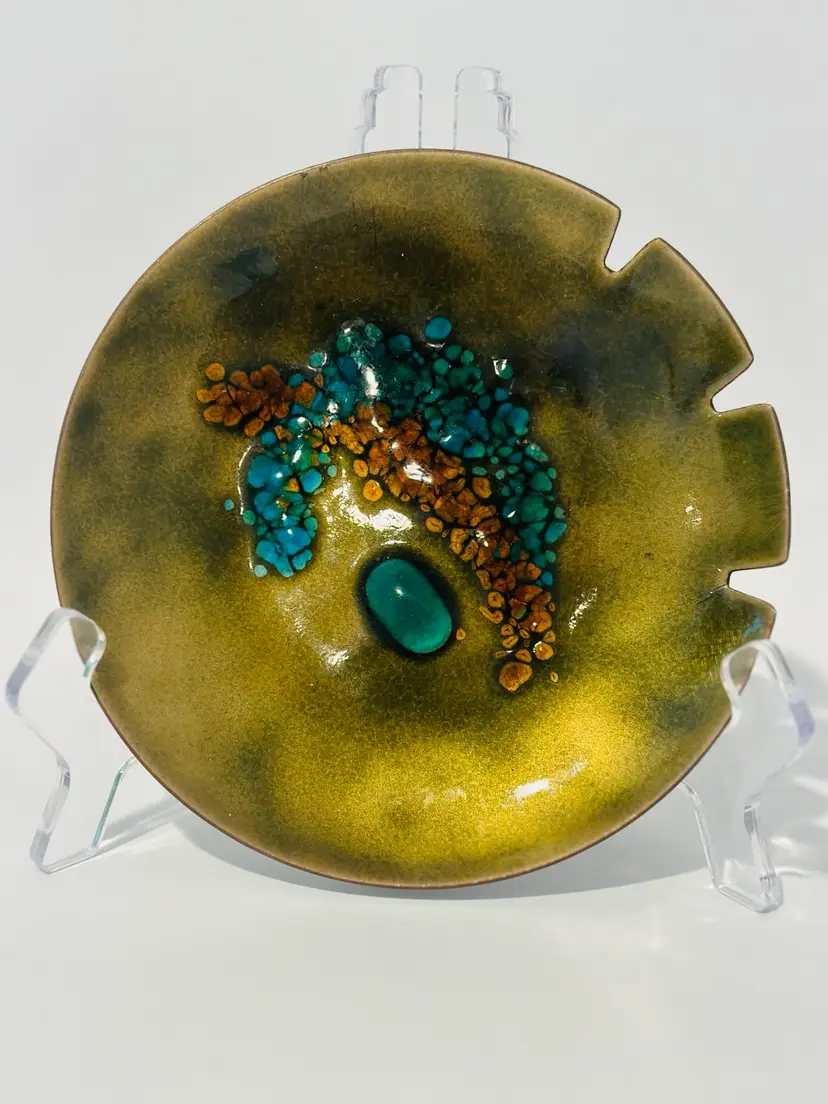 This exquisite Bovano Handcrafted Enamel Copper 6” Trinket Dish / Ashtray MCM is a true work of art. Made in the United States, it is crafted from high-quality copper and adorned with beautiful enamel. Perfect for collectors and lovers of metalware, this dish is ideal for displaying and organizing your trinkets or as a stunning decorative piece.