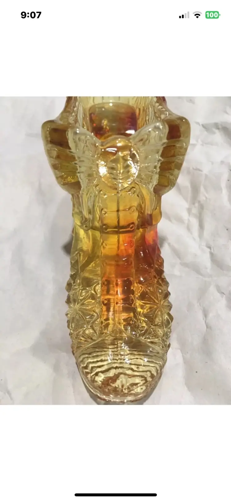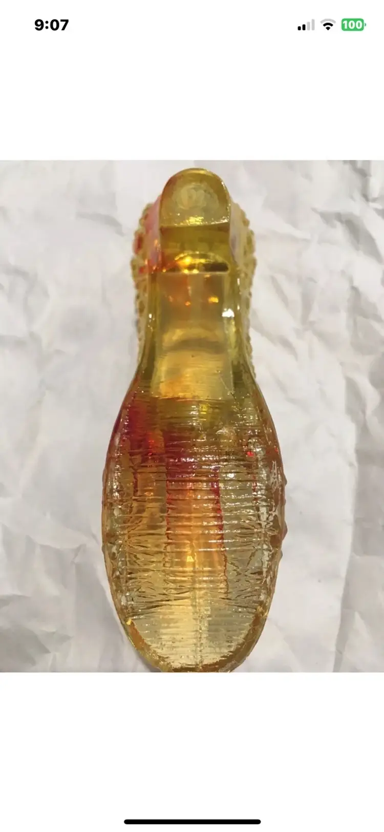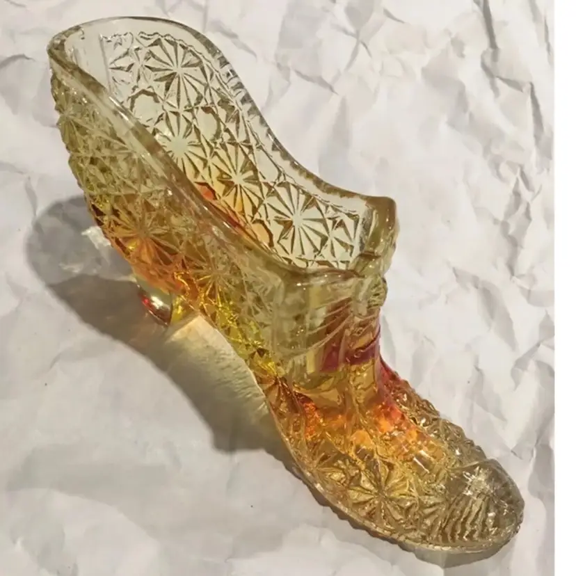 This vintage Boyd Daisy Button & Bow Tie Golden Honey Amber Art Glass Slipper Shoe is a delightful addition to any collection. It has a glossy finish and is made of molded Cadmium glass. The shoe is 5.5 inches long, 2.5 inches high, and 1.75 inches wide. Great home decoration. The shoe is decorative art glass and glows orange under black light in the sole and heel. It is sure to catch the eye of any admirer. Slight rough spot flea bite on upper heel seam. Can’t see it but you can feel it. No cracks.