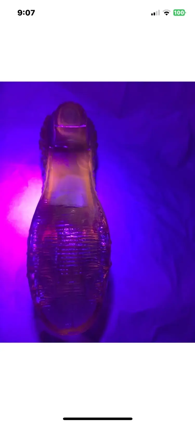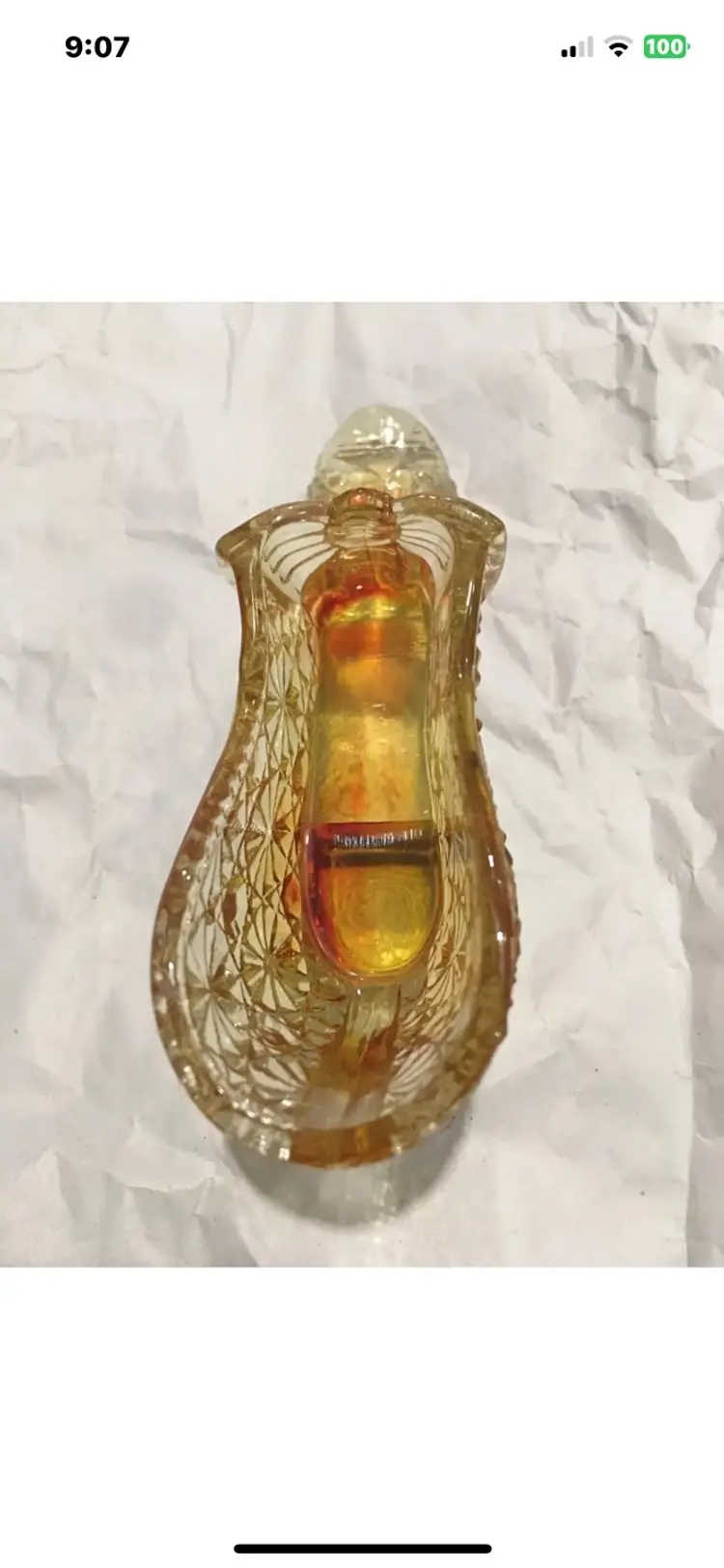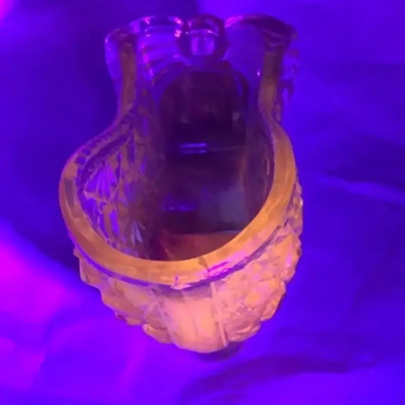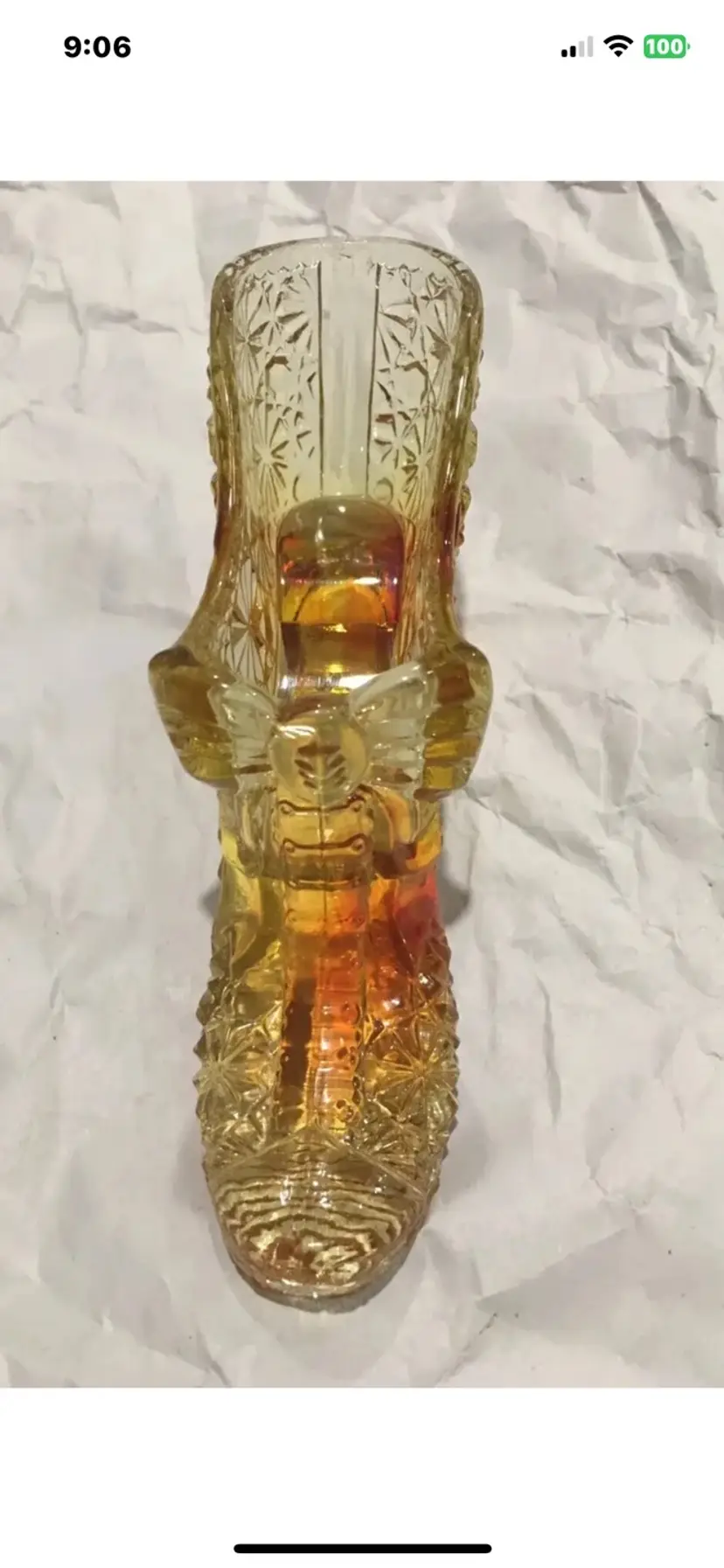 This vintage Boyd Daisy Button & Bow Tie Golden Honey Amber Art Glass Slipper Shoe is a delightful addition to any collection. It has a glossy finish and is made of molded Cadmium glass. The shoe is 5.5 inches long, 2.5 inches high, and 1.75 inches wide. Great home decoration. The shoe is decorative art glass and glows orange under black light in the sole and heel. It is sure to catch the eye of any admirer. Slight rough spot flea bite on upper heel seam. Can’t see it but you can feel it. No cracks.
